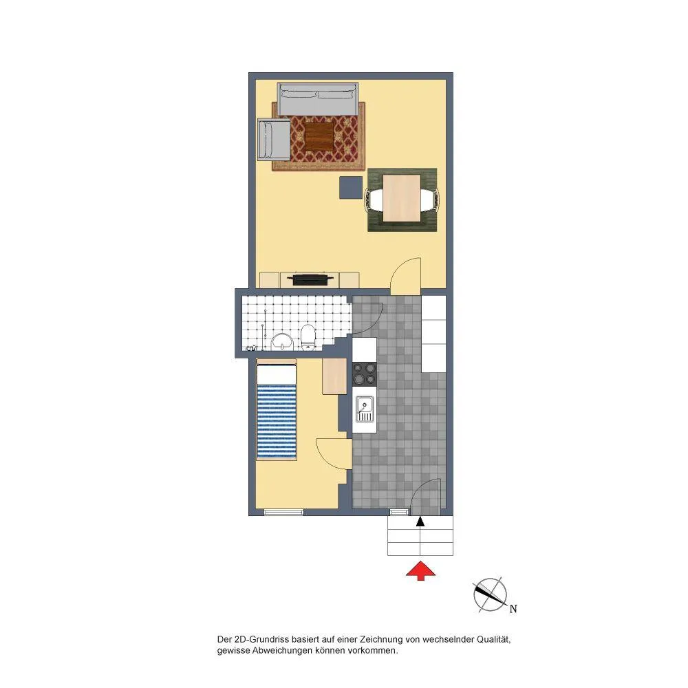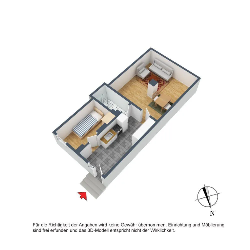 Diese modernisierte und gemütliche 2-Zimmer-Wohnung mit eigenem Eingang befindet sich im Hochparterre (Erdgeschoss mit 3 Stufen).