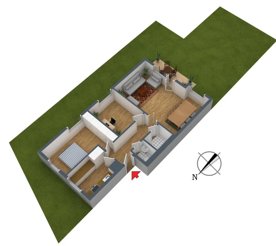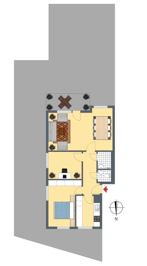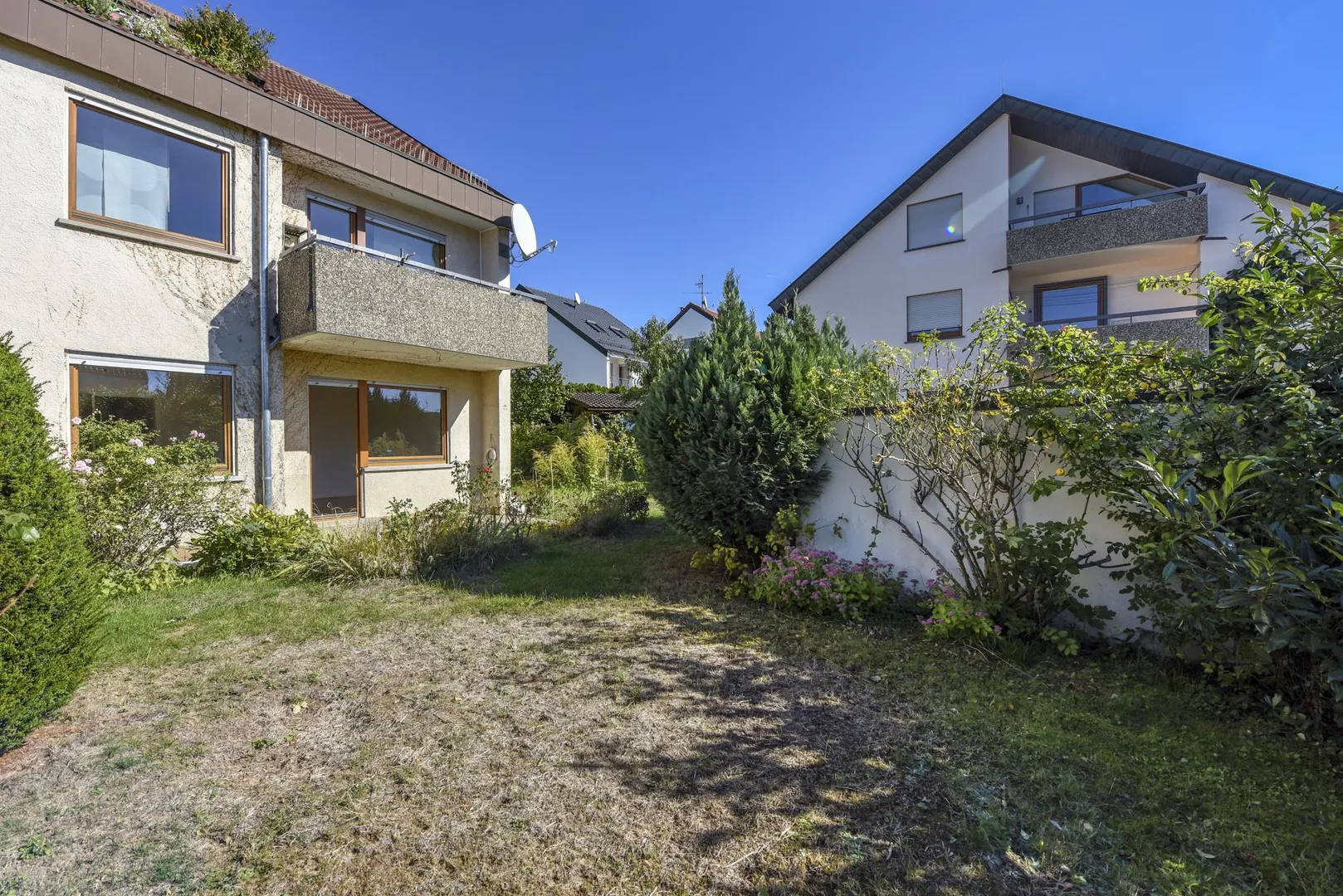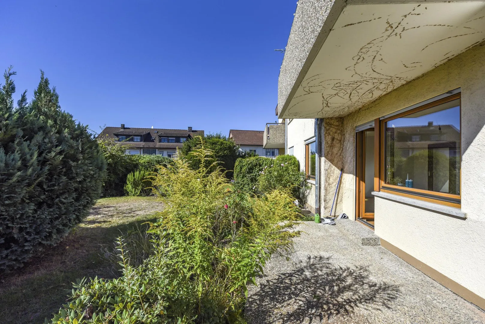 Der Grundriss ist gut: alle Räume sind direkt vom Flur begehbar. Die ca. 8,5 m² große und teilüberdachte Süd-Terrasse sowie der Garten sind über das Wohnzimmer begehbar. Das WC ist separat.