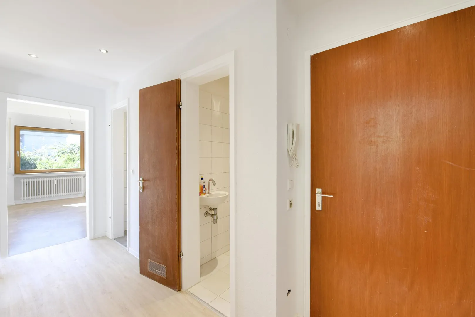 Die Decke im Flur ist abgehängt und mit Halogenleuchten ausgestattet.