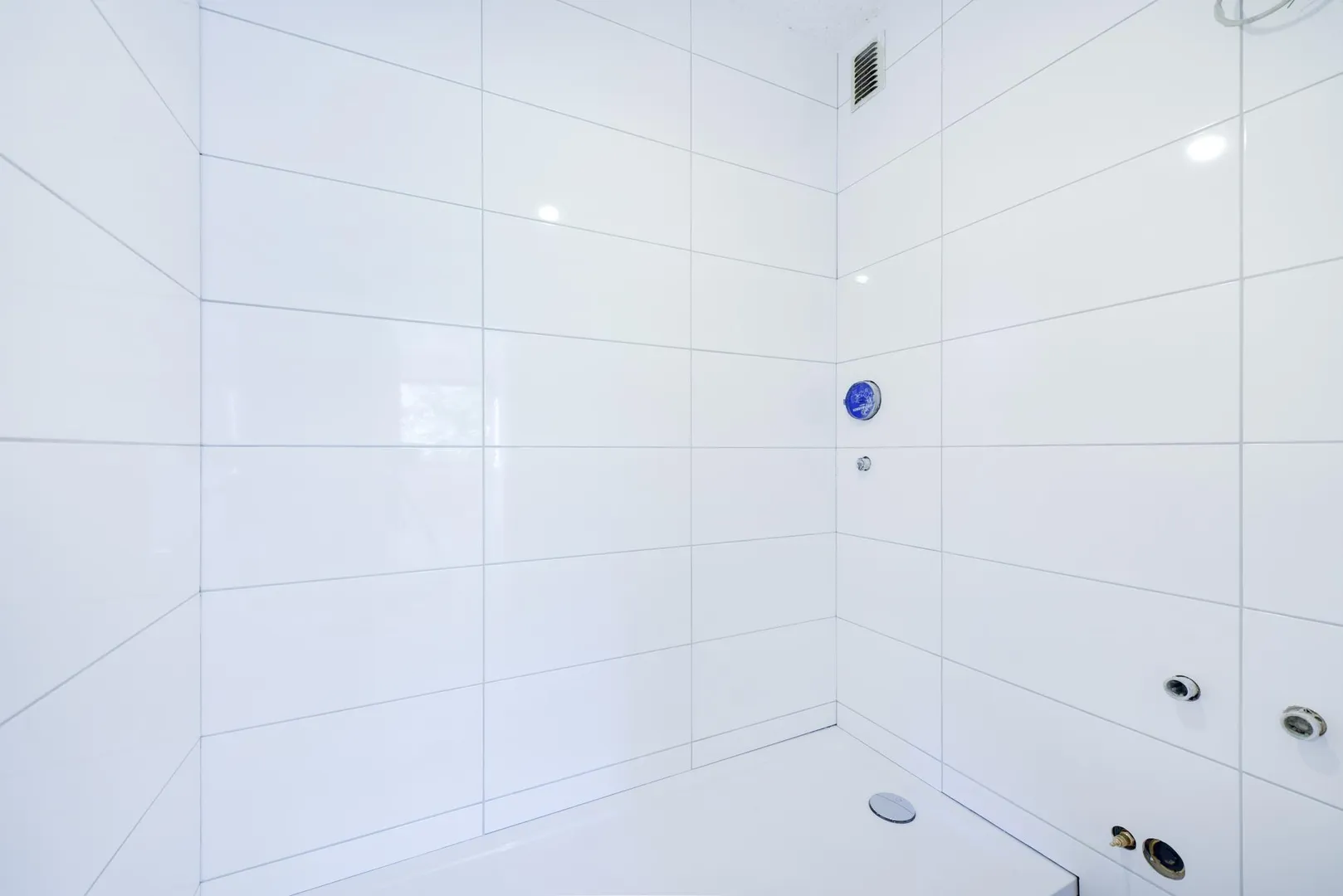 Das kompakte, raumhoch geflieste Badezimmer ist mit einer großen Dusche ausgestattet.