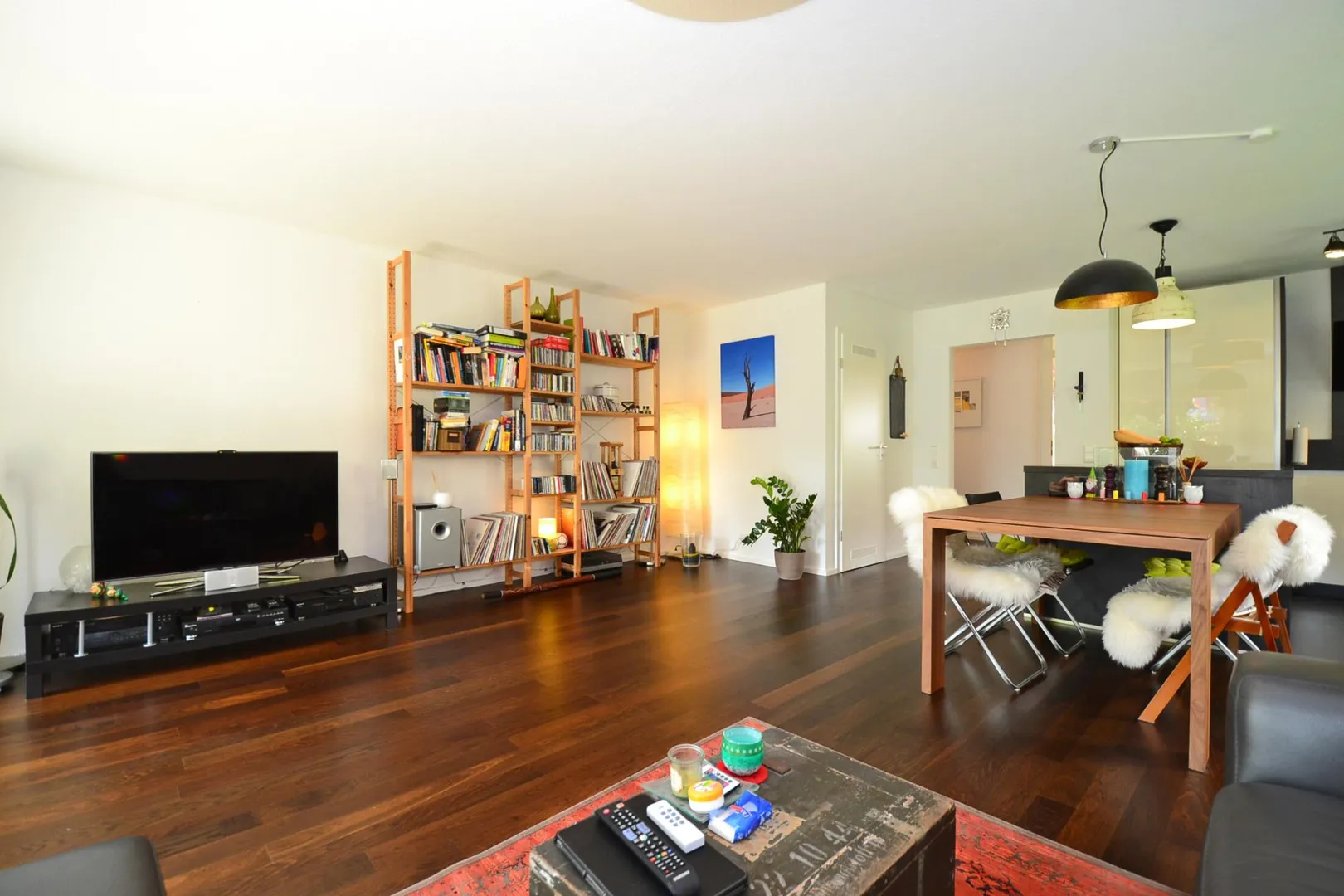 In den Zimmern ist Massivholz-Parkett verlegt. Die Böden im Flur, in der offenen Küche, im Bad und im separaten WC sind gefliest.