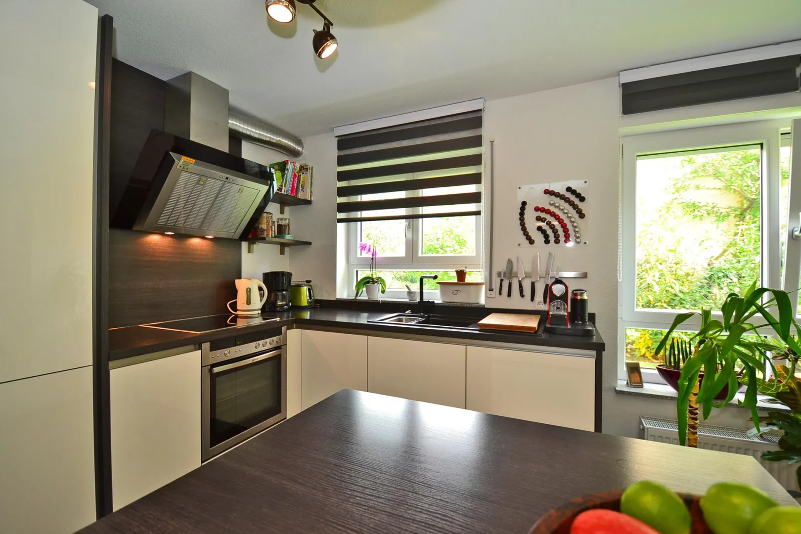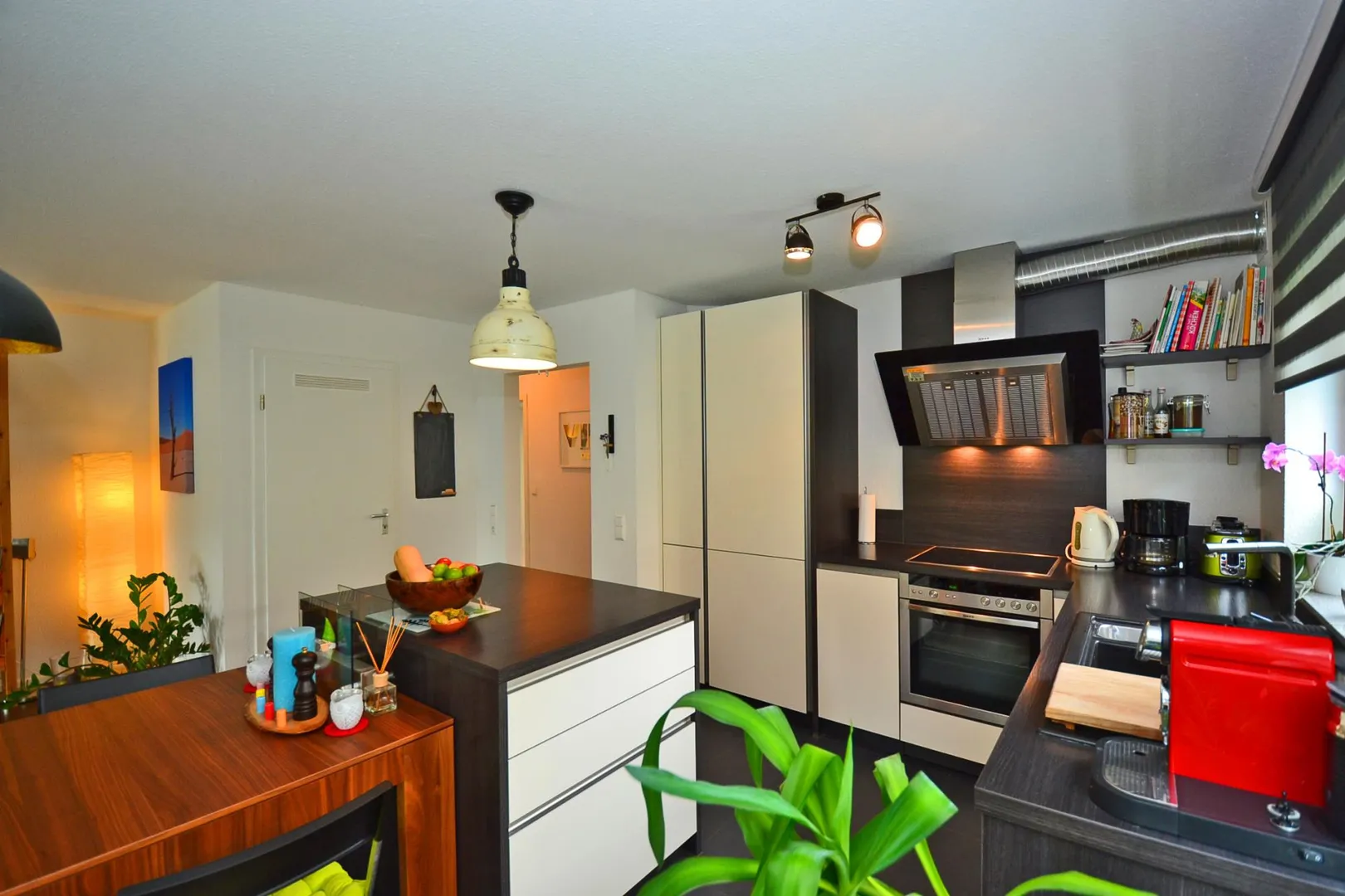 Die offene Küche ist mit einer hochwertigen Einbauküche ausgestattet. Die Einbauküche beinhaltet einen Kühlschrank mit Gefrierfach, eine Spülmaschine, einen Herd mit Dunstabzug nach außen, einen Backofen sowie Ober- und Unterschränke.