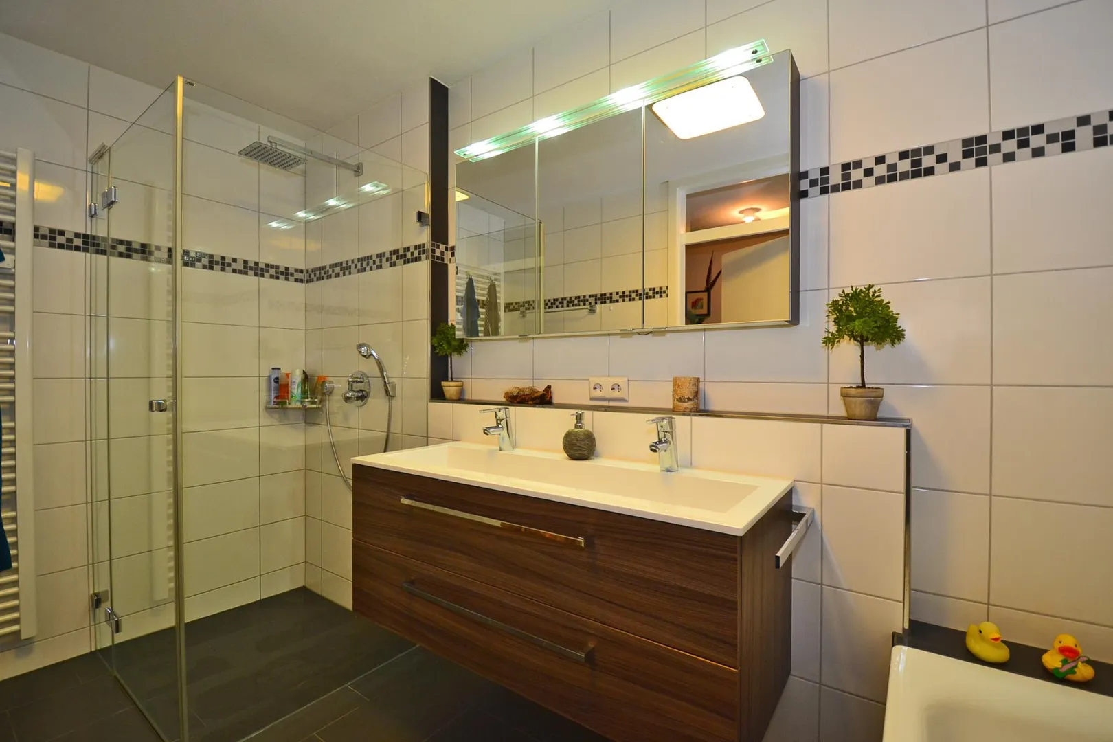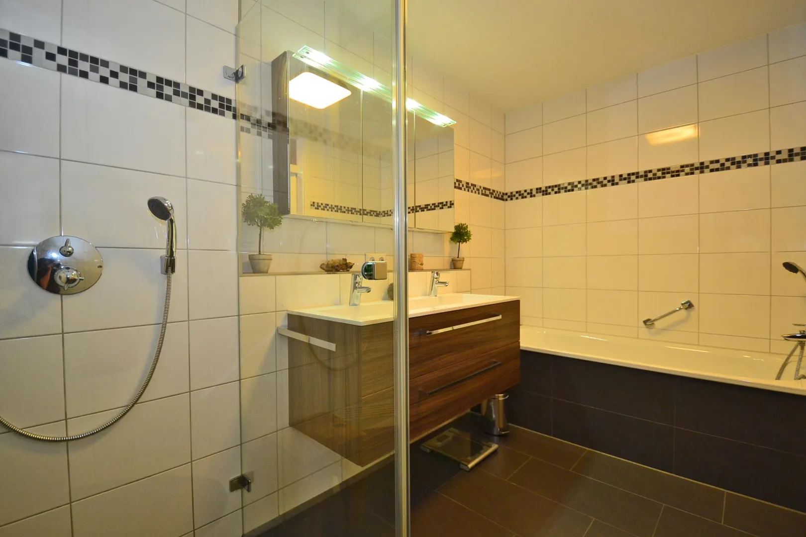 Das raumhoch geflieste Badezimmer ist mit einer Wanne, einer ebenerdigen Dusche, einem Handtuchheizkörper, einem Spiegelschrank, einem Unterschrank, einem Doppelwaschbecken sowie Fußbodenheizung ausgestattet.