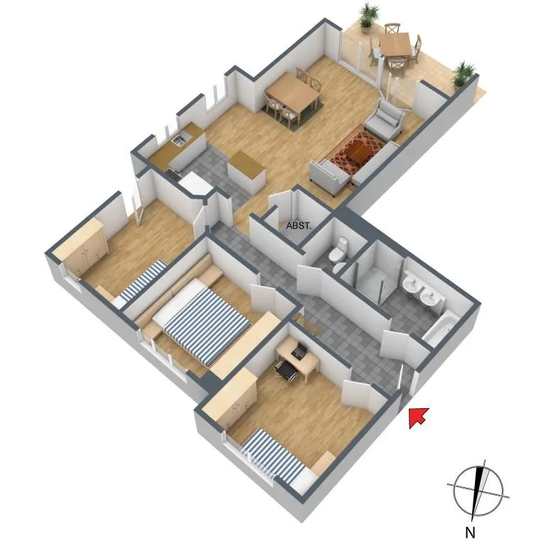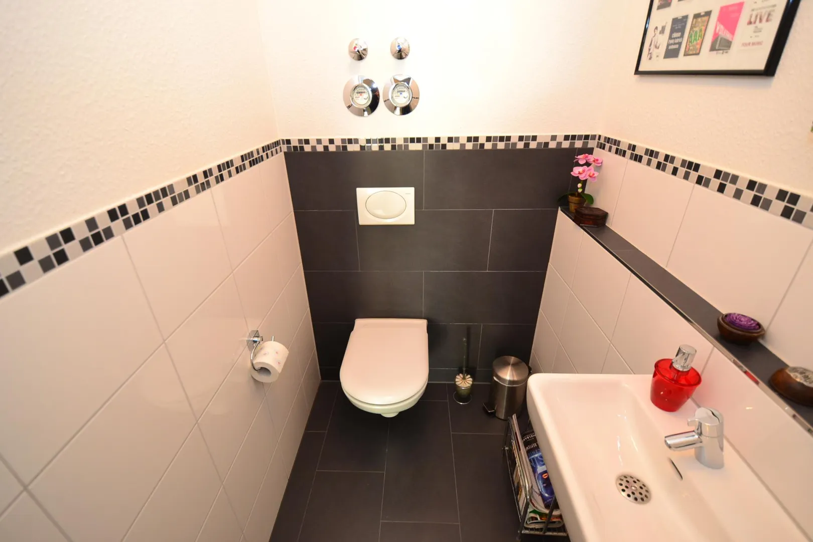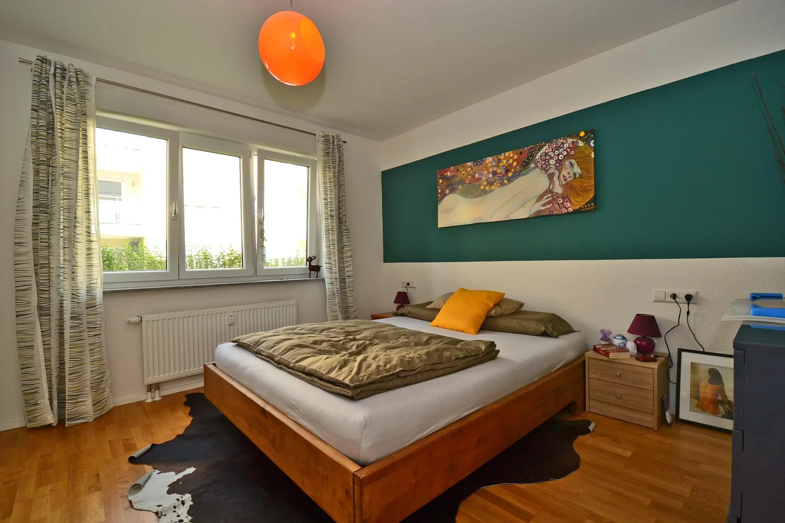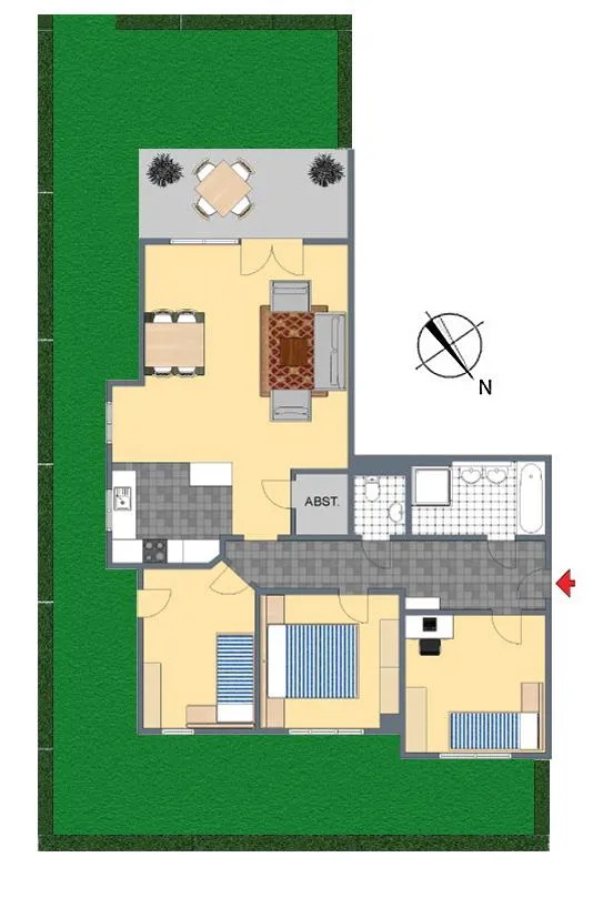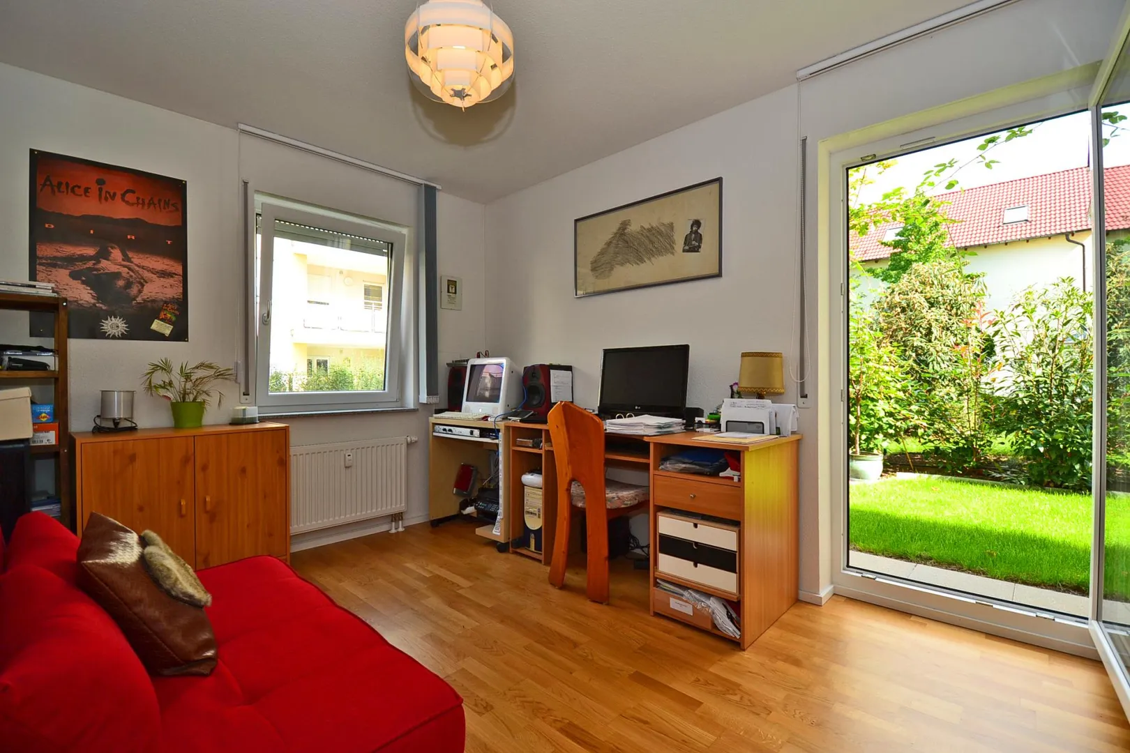 Die Aufteilung der Wohnung ist gut: Alle Räume sind vom Flur aus begehbar. Die ca. 11 m² große und überdachte Süd-Terrasse ist vom Wohnzimmer begehbar. Das WC ist separat. Im 1. Kinderzimmer befindet sich ein Gartenausgang. In der Wohnung befindet sich ein zusätzlicher Abstellraum.