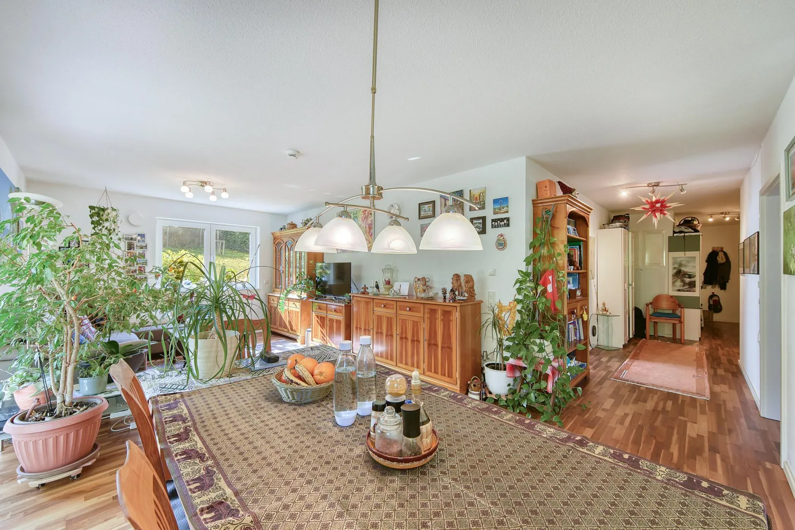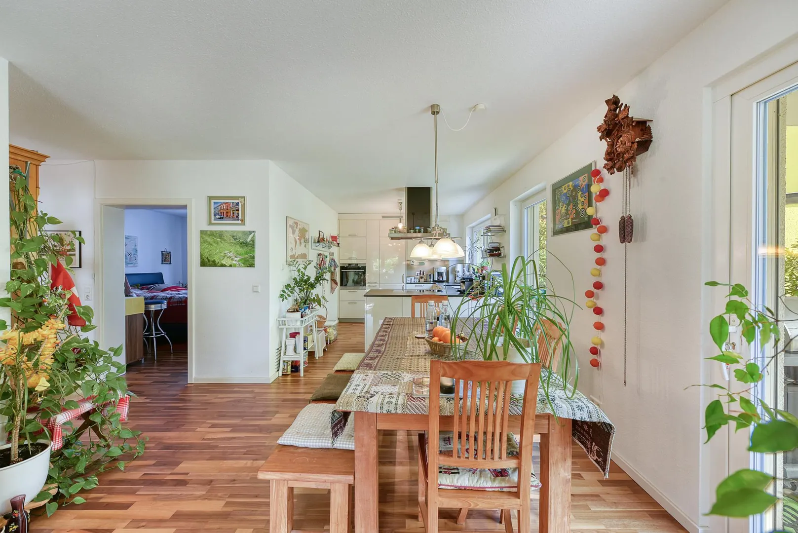 Im Küchen-, Ess- und Wohnbereich, im Flur sowie in den beiden anderen Zimmern ist Parkett verlegt. Die Böden im Badezimmer sowie im WC sind gefliest.
