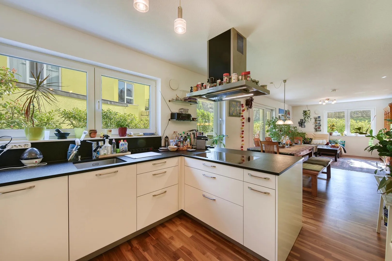 Die offene Küche ist ausgestattet mit einer Einbauküche.