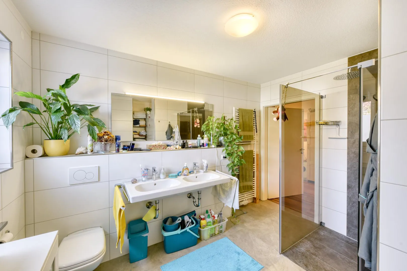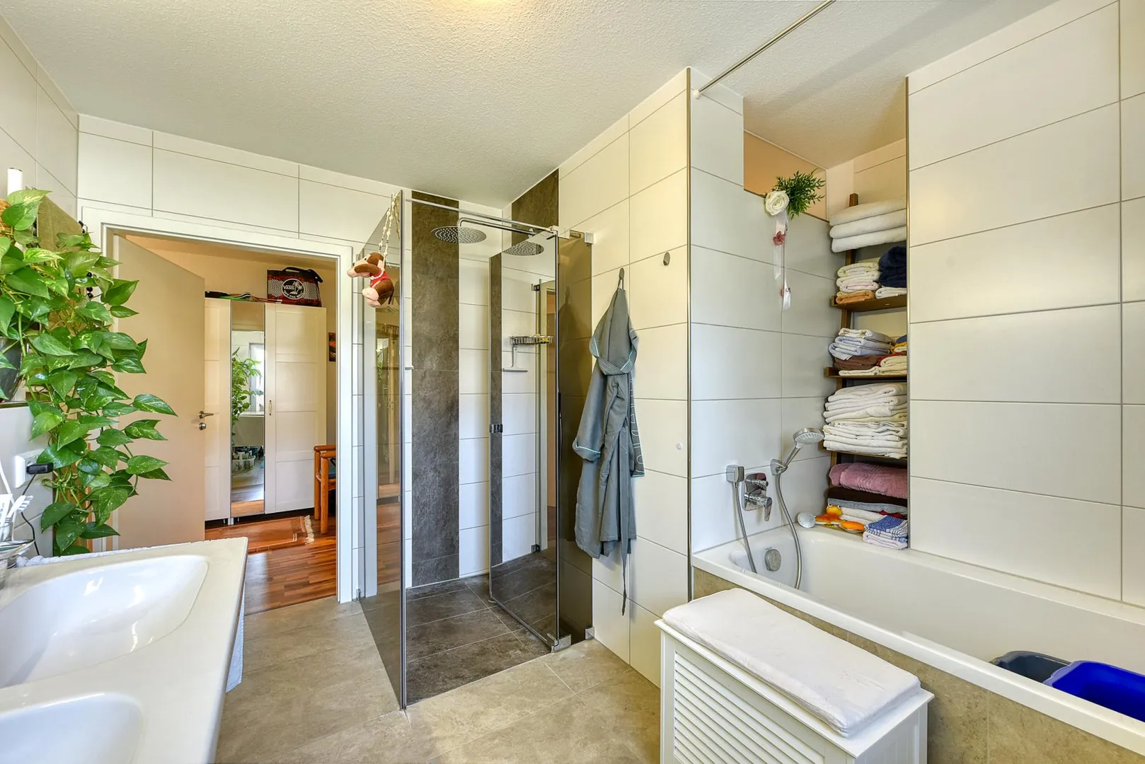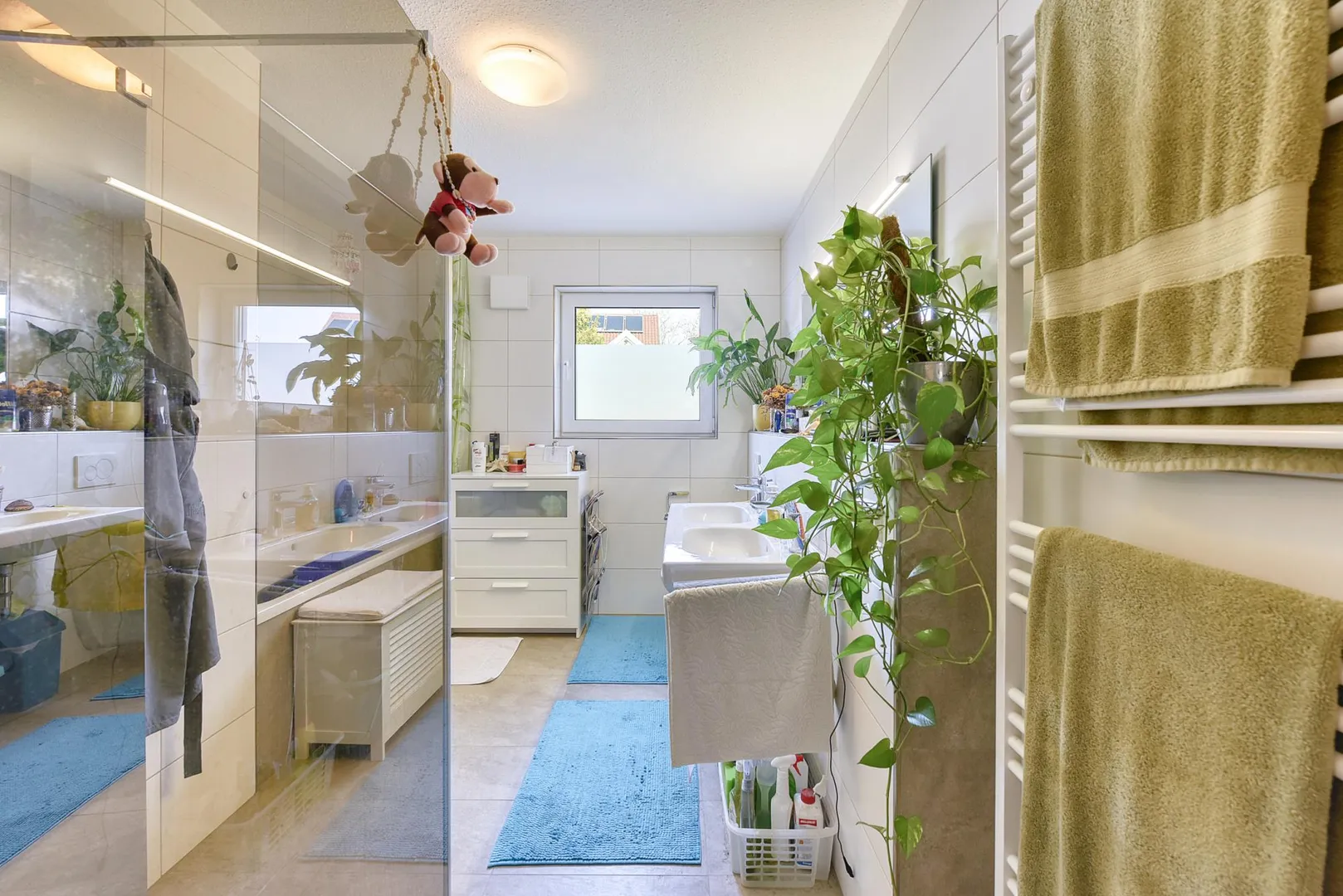 Das raumhoch geflieste Tageslicht-Bad ist ausgestattet mit einer Badewanne, einer bodenebenen Dusche, einem WC, zwei Waschbecken, einem Handtuch-Heizkörper sowie einem belichteten Spiegel.