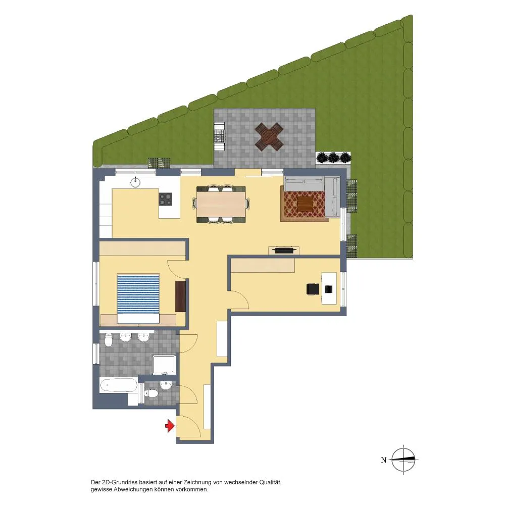 Der Grundriss ist offen gestaltet: der Flur, der Wohn-/Ess- sowie der Küchenbereich sind offen. Das Badezimmer verfügt über ein Fenster sowie ein WC. Das zweite WC (Gäste-WC) ist innenliegend. Die ca. 16 m² große und teilüberdachte Terrasse sowie die Grünfläche sind über den Essbereich begehbar.