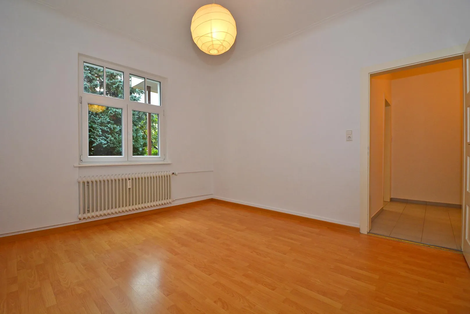 Die Wände sind mit Raufasertapeten tapeziert und frisch, weiß gestrichen.