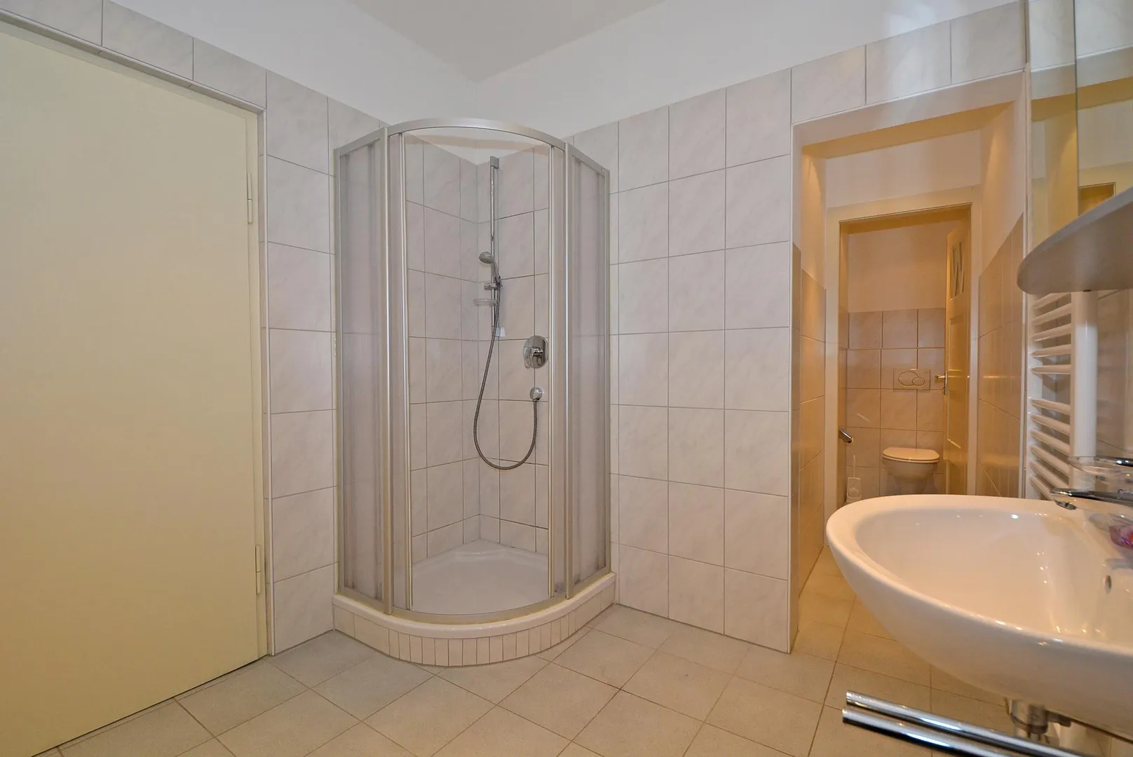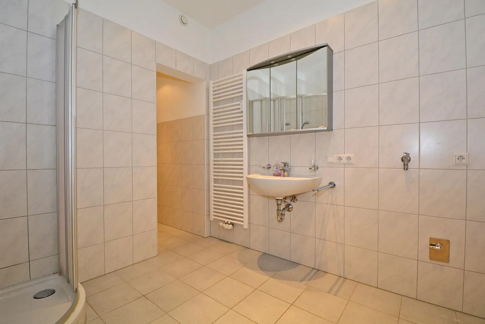Das fast raumhoch geflieste Badezimmer wurde 2008 modernisiert und ist mit einer Dusche, einem Handtuchheizkörper, einem Spiegelschrank und einem Waschmaschinenanschluss ausgestattet. Das WC ist separat und über das Badezimmer zugänglich.
