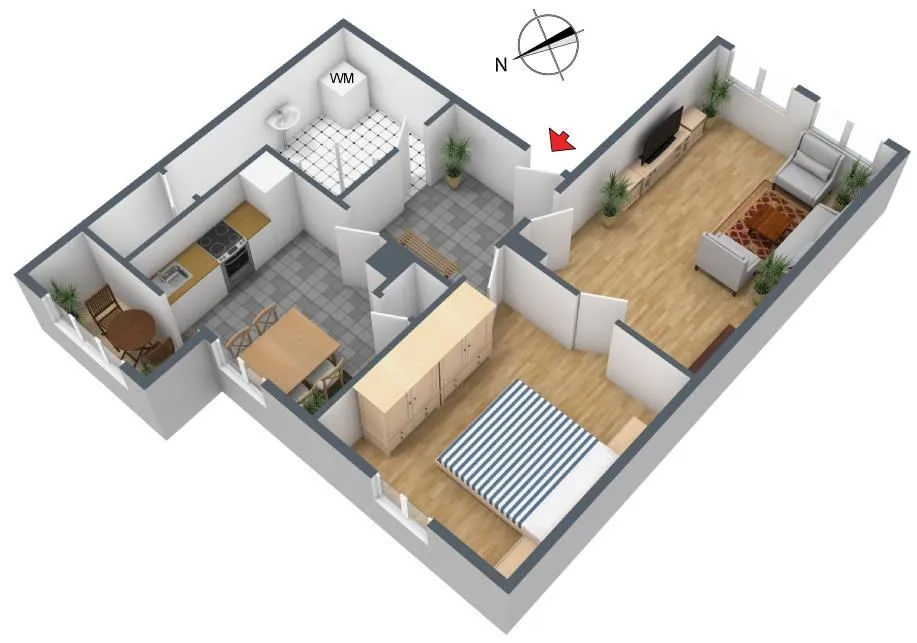 Das Wohnzimmer ist nach Süden ausgerichtet. Das Schlafzimmer und die Küche sind nach Norden ausgerichtet.