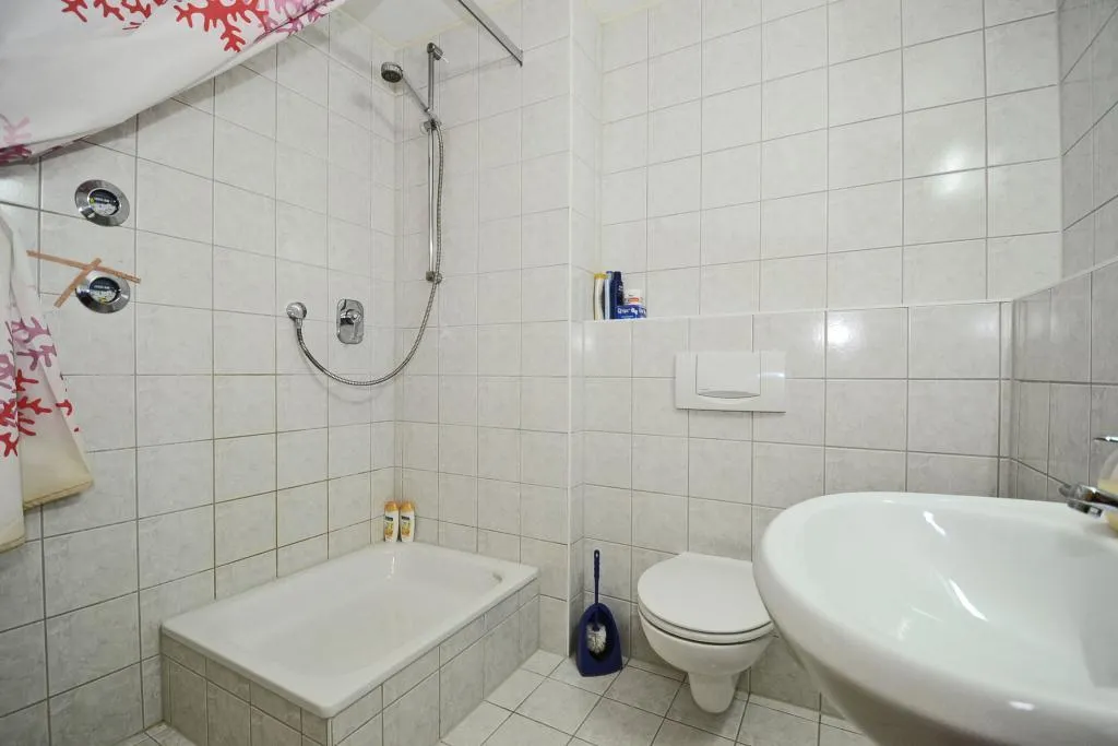 Das raumhoch geflieste Badezimmer ist ausgestattet mit einem Fliesenboden, einer Dusche, einem WC und einem Waschmaschinenanschluss.