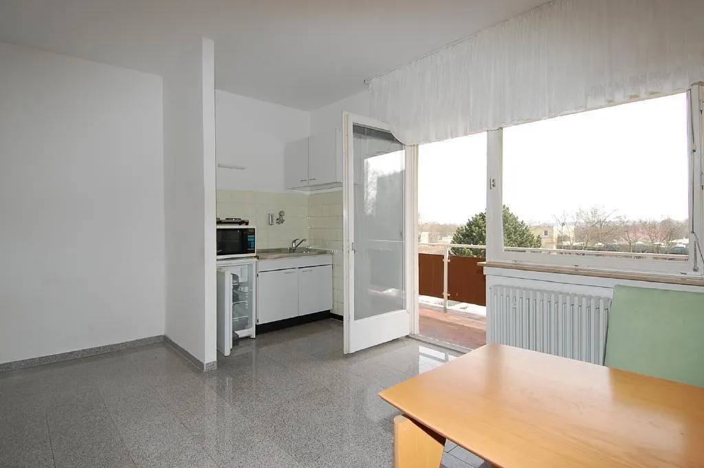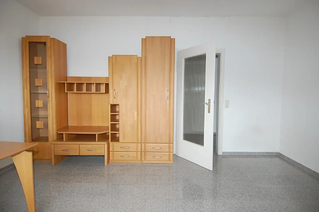 Die Wohnung ist ausgestattet mit einem Holzfenster und einer Holzbalkontüre mit Jalousien. Die Wände sind mit Raufaser tapeziert.