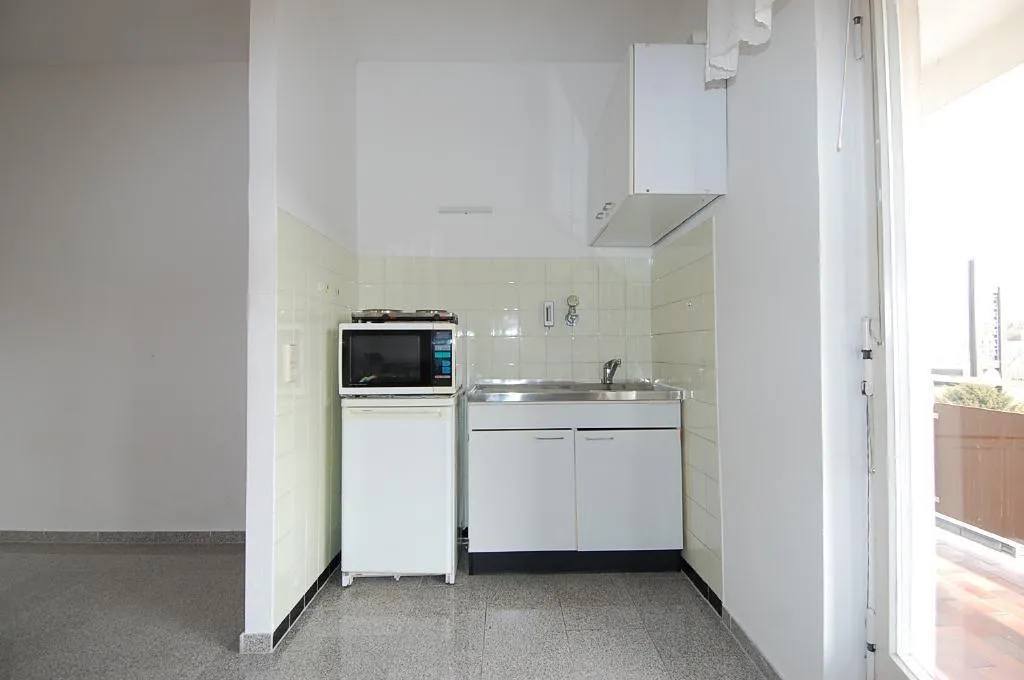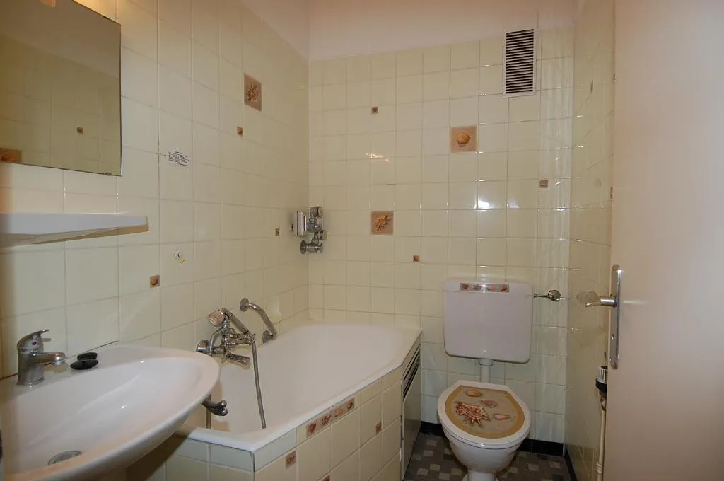 Der Boden im Eingangsbereich, sowie im Wohn- Schlafbereich ist mit Granitfliesen ausgestattet. Das Badezimmer verfügt über die ursprünglichen Fliesen, eine Badewanneund ein WC.