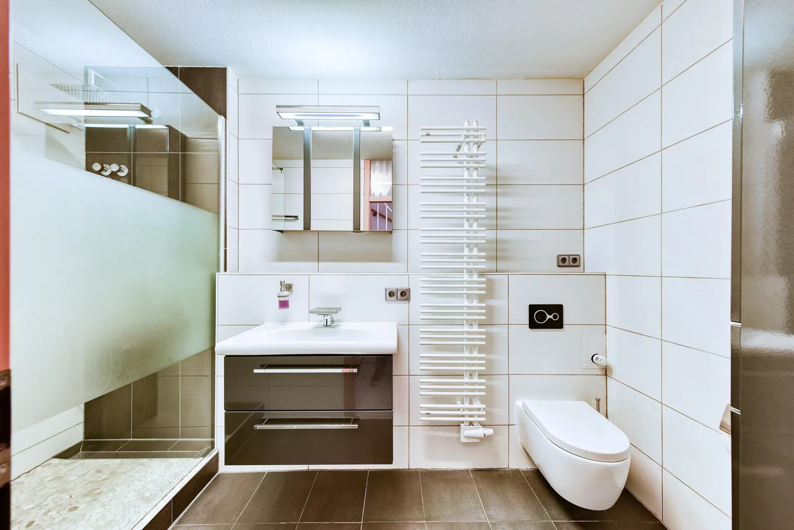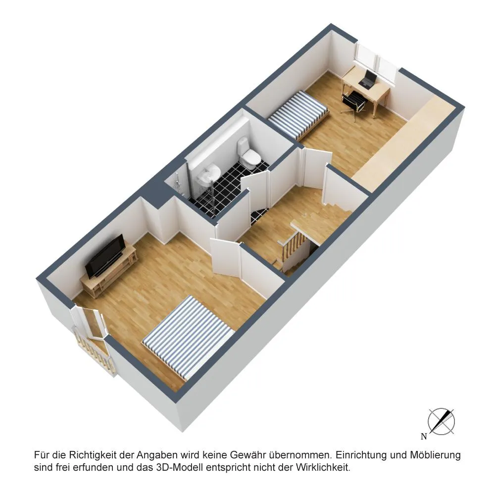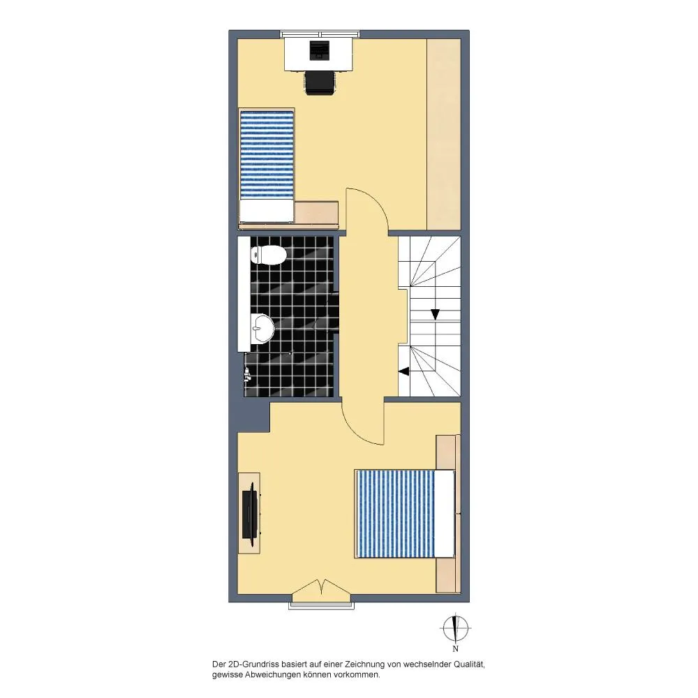 Im Obergeschoss befinden sich auf ca. 40,1 m² Wohnfläche ein Schlafzimmer mit französischem Balkon zur Nordseite, ein Kinderzimmer zur Südseite sowie das innenliegende Haupt-Badezimmer von 2017 mit Dusche/WC und einer Warmwasser-Fußbodenheizung.