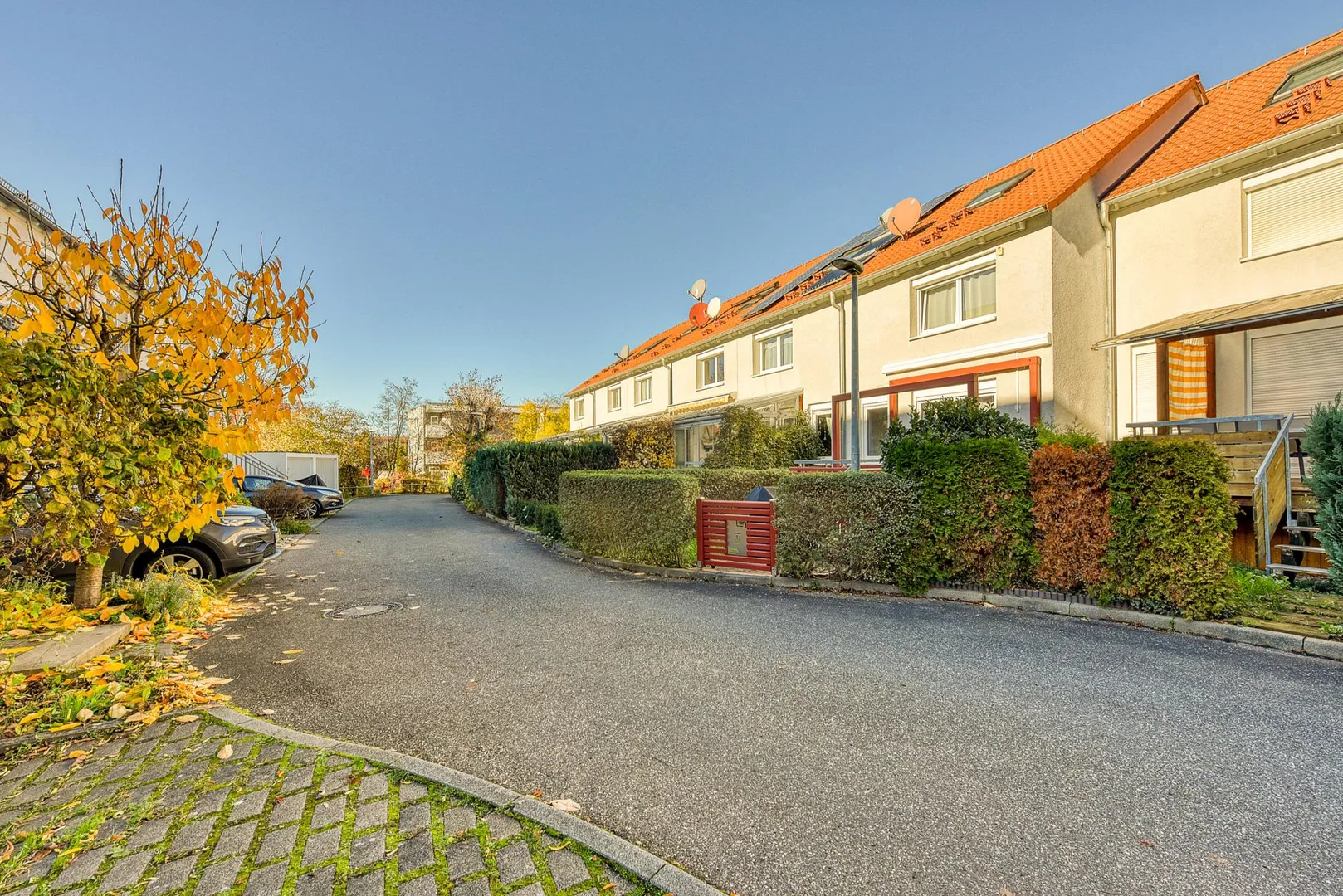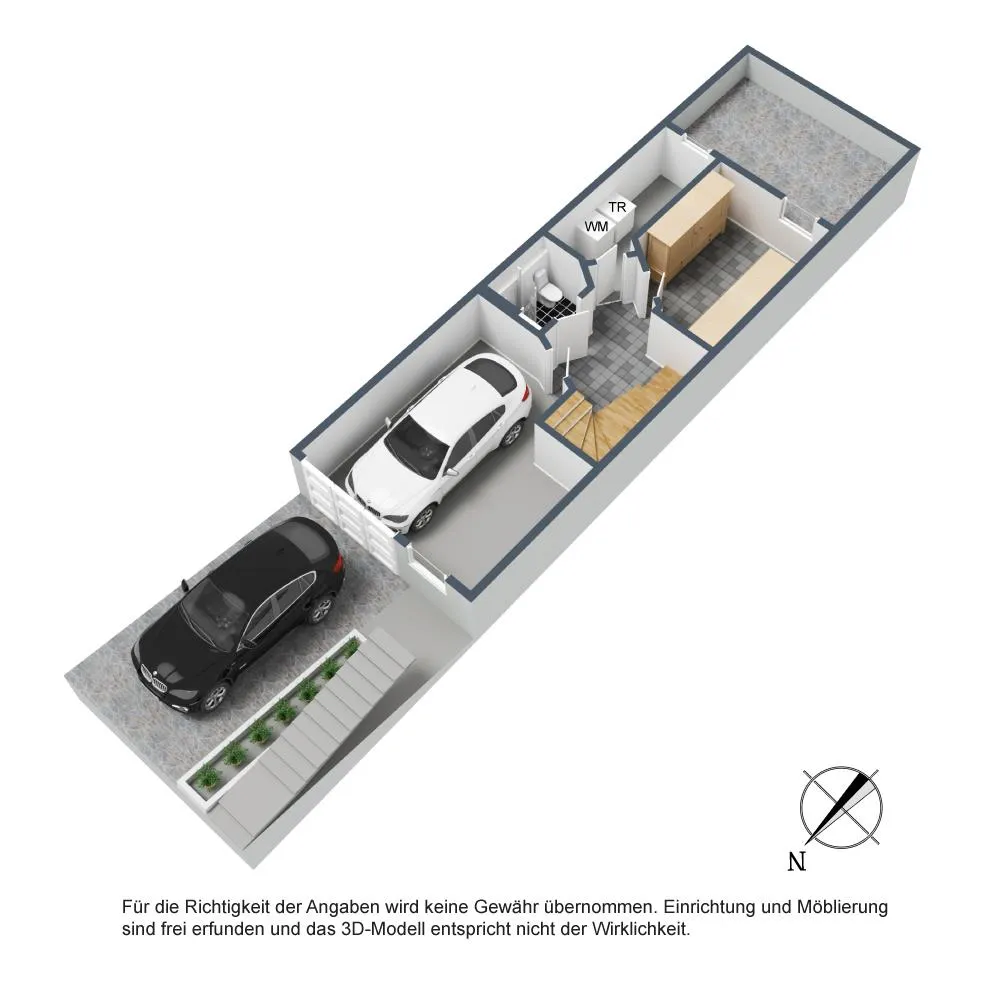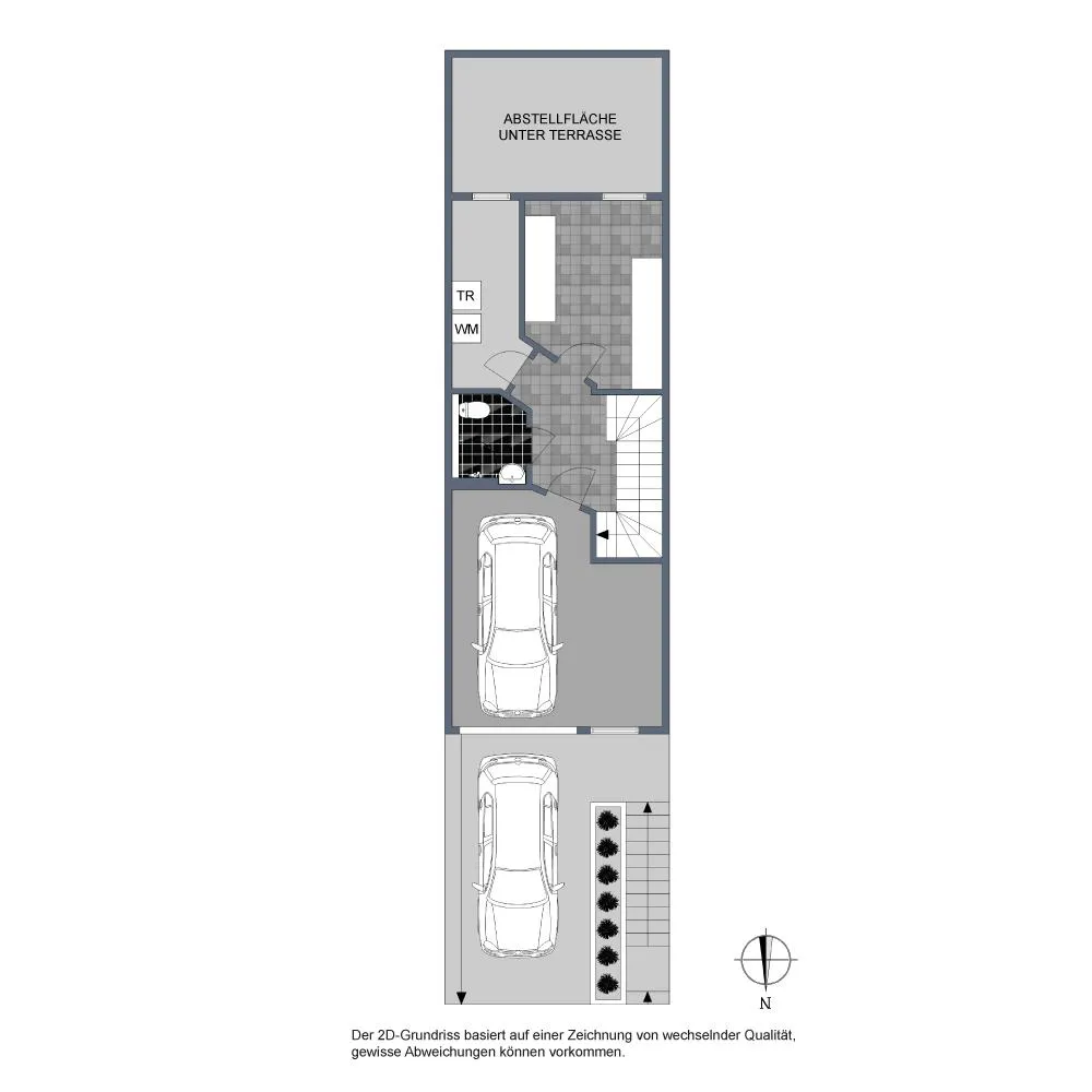 Die Garageneinfahrt mit dem Kfz-Stellplatz ist nach unten geneigt.