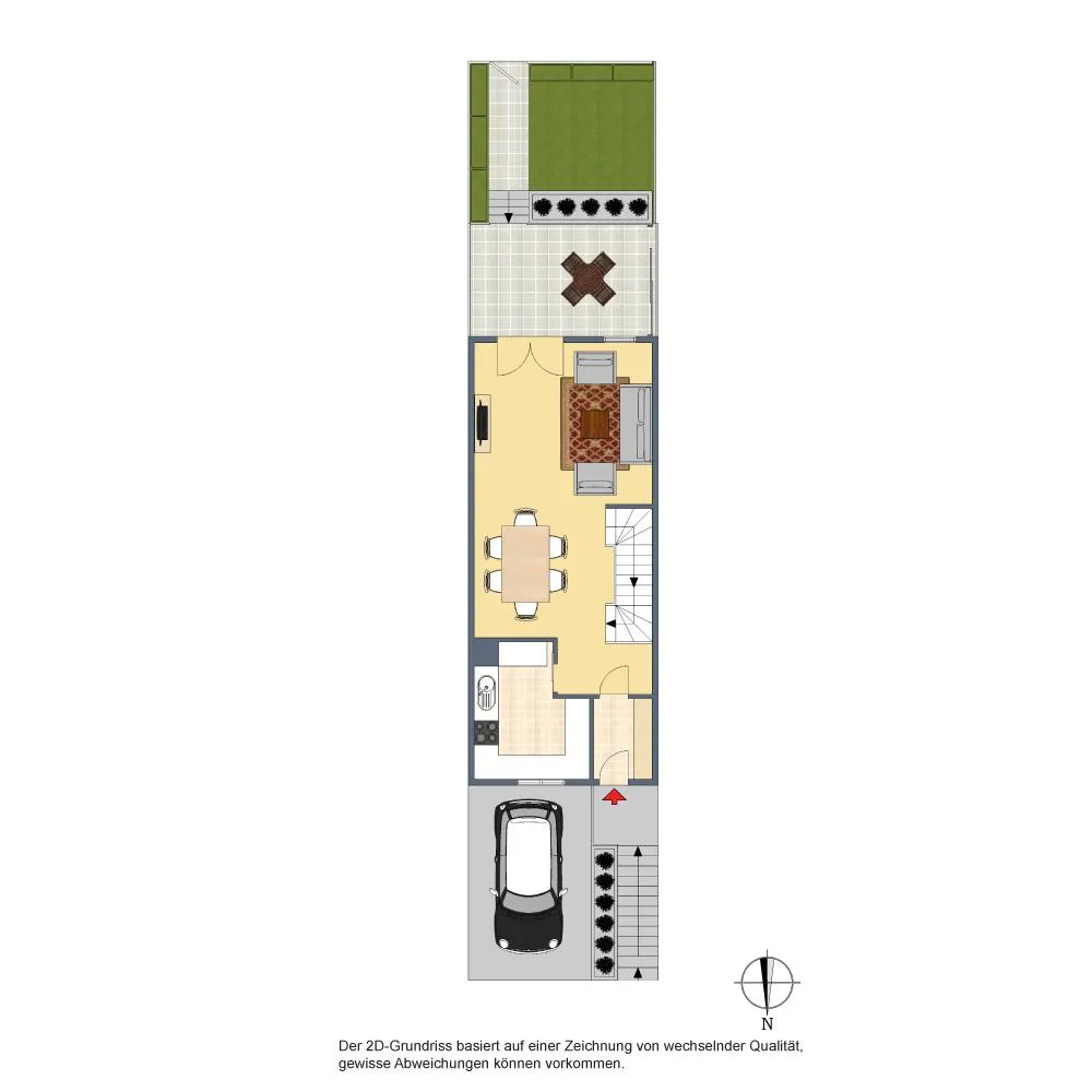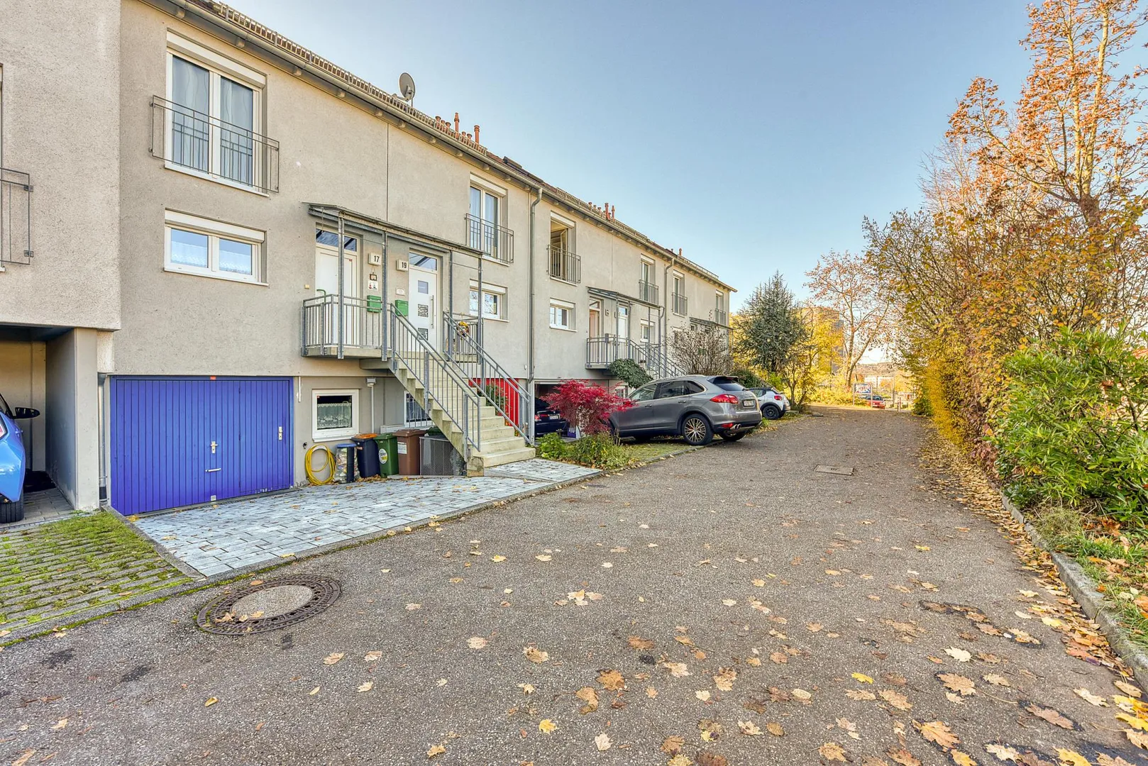 Im Norden befinden sich der Hauseingang sowie die Garageneinfahrt mit einem Stellplatz. Der Hauseingang ist über eine, mit dem Nachbar gemeinschaftliche, 12-stufige Treppe nach oben begehbar.