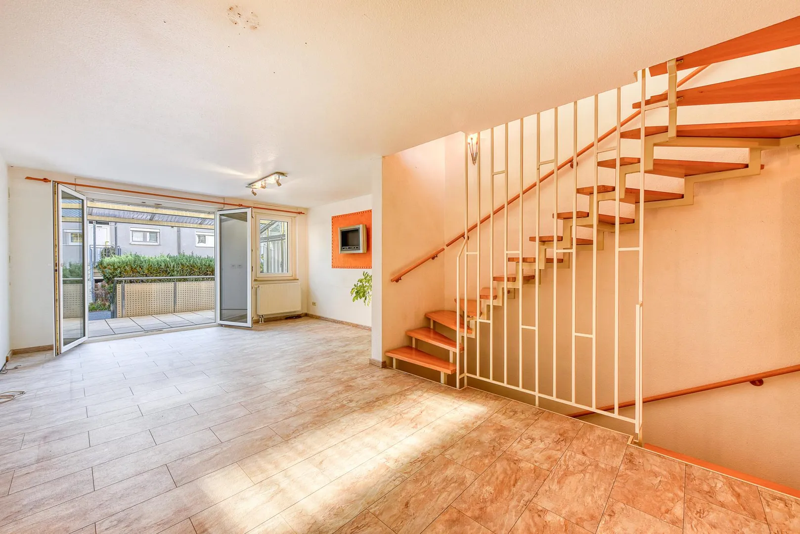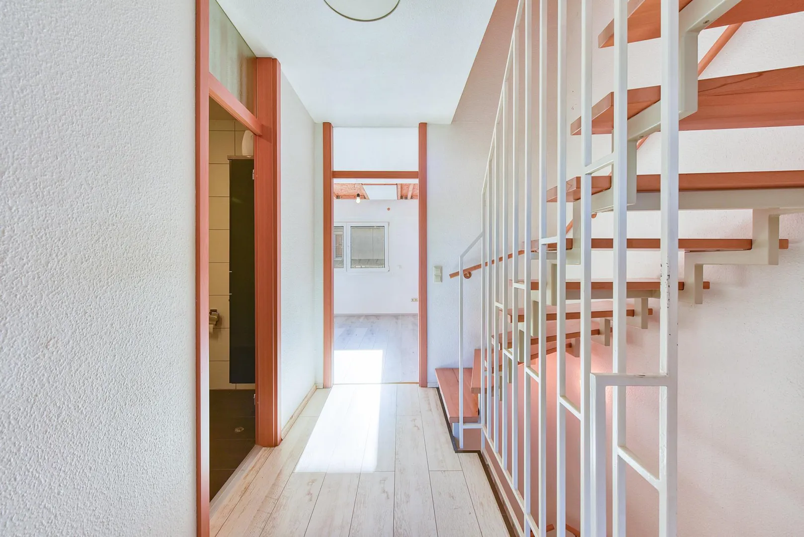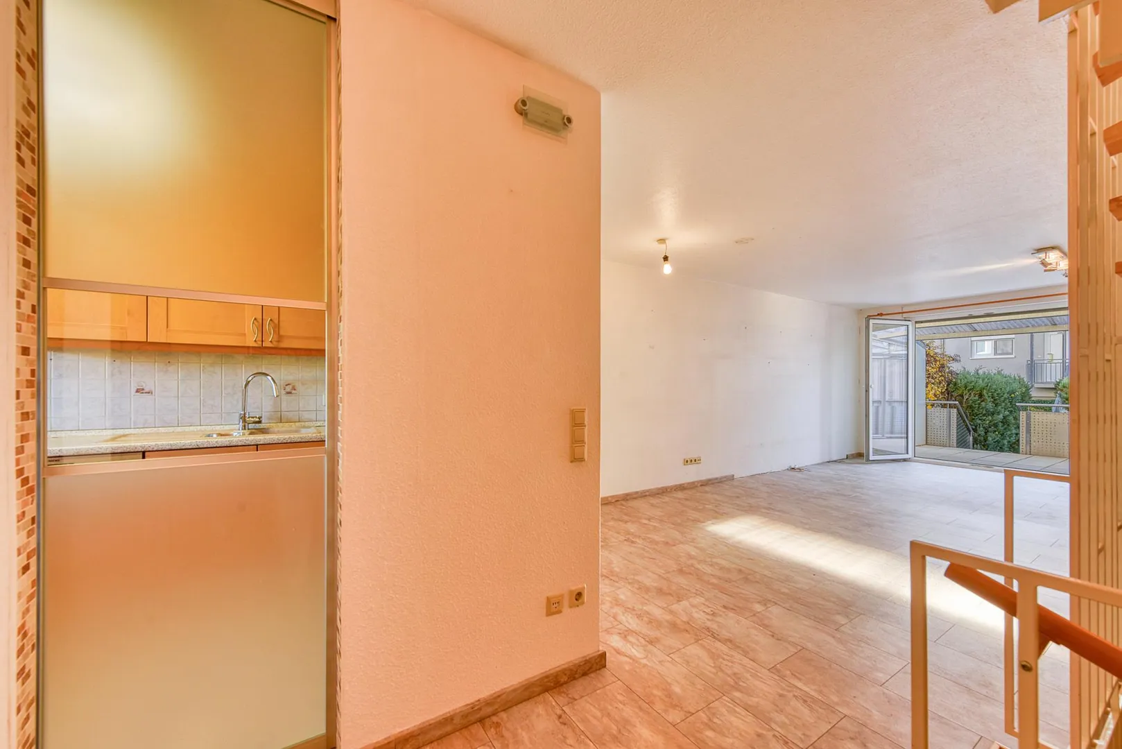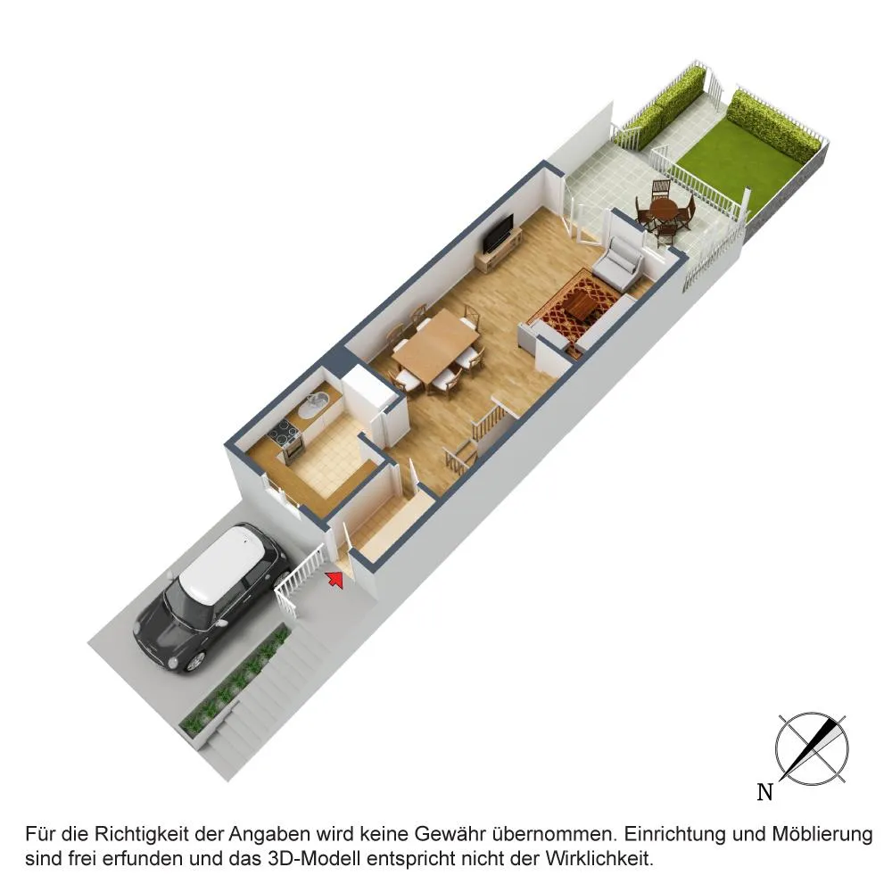 Im Hochparterre befinden sich auf ca. 47,5 m² Wohnfläche der Windfang, die Küche mit Einbauküche und Schiebetür, der Ess- und Wohnbereich sowie die Terrasse mit Abgang zum kleinen Garten.