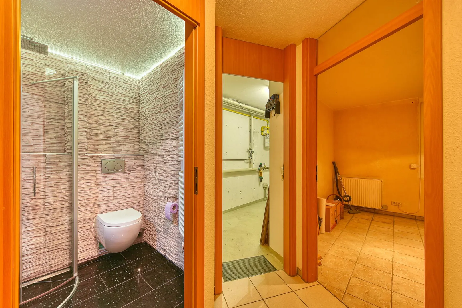 Im Untergeschoss befinden sich die Garage mit elektrischem Torantrieb sowie Funkfernbedienung und Hauszugang, ein kleines Badezimmer von 2017 mit Dusche/WC und elektrischer Fußbodenheizung, ein Arbeits-/Mehrzweckzimmer sowie der Wasch-/Trocken-/Kellerraum. Unter der Terrasse befindet sich eine ca. 10 m² große Lagerfläche mit einer Höhe von ca. 1,90 Meter. Die Lagerfläche ist mit einer Beistelltreppe über das Arbeitszimmer begehbar.