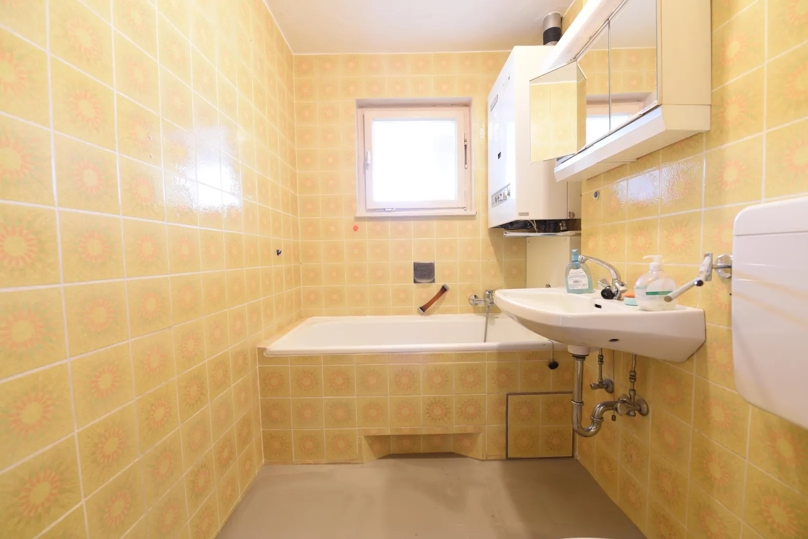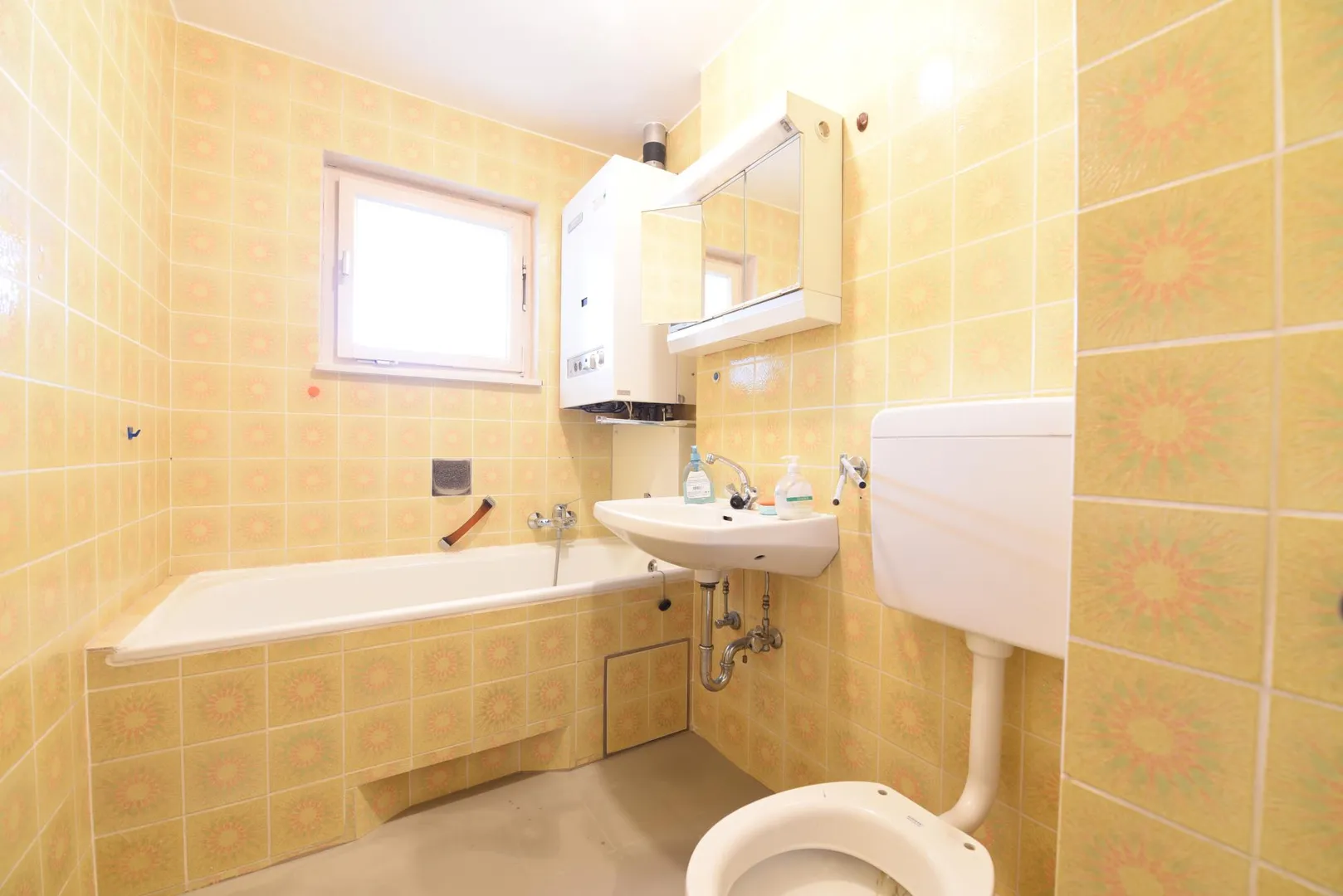 Das Badezimmer mit Fenster ist mit gelblichen Fliesenwänden, einer Badewanne und einem WC ausgestattet.
