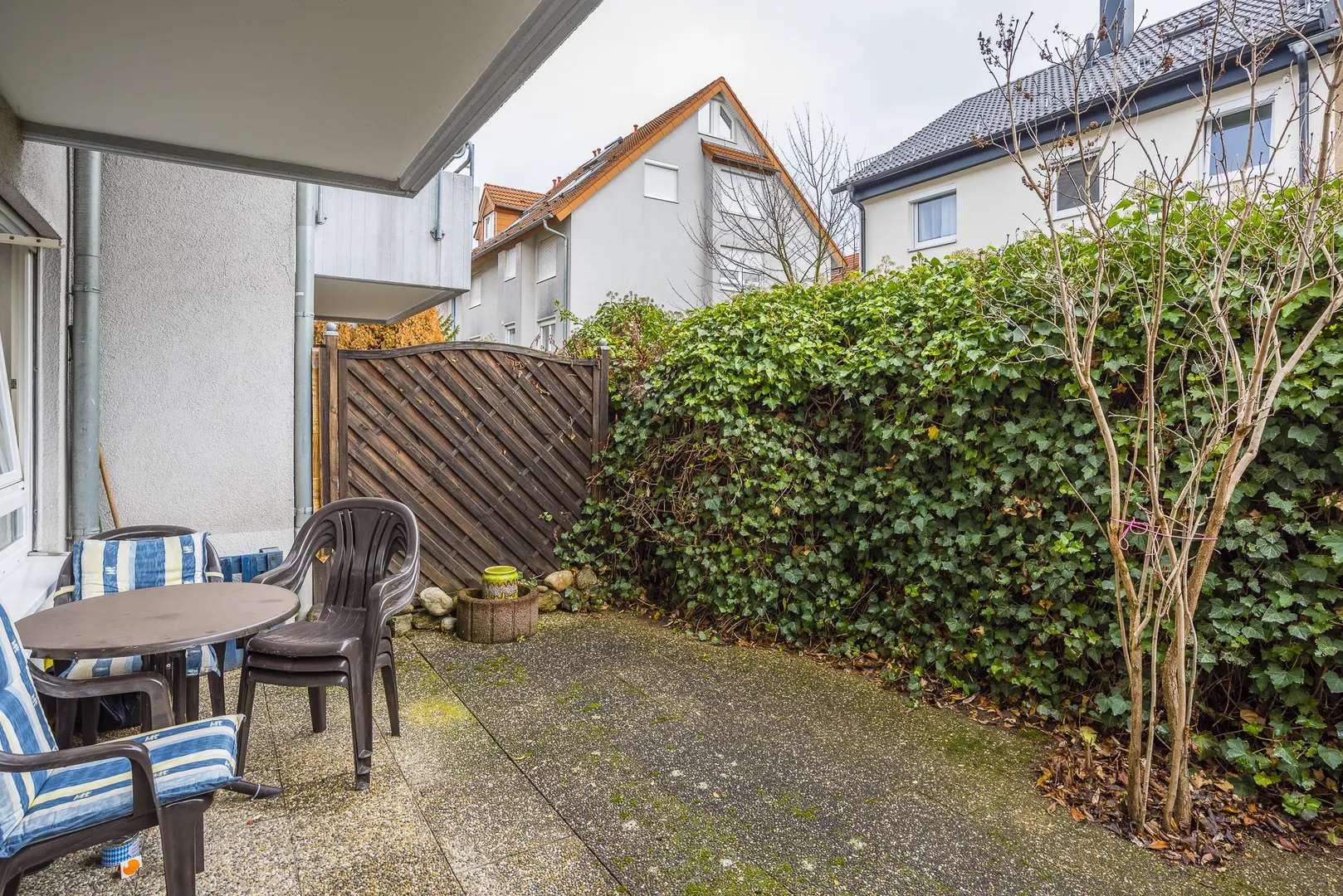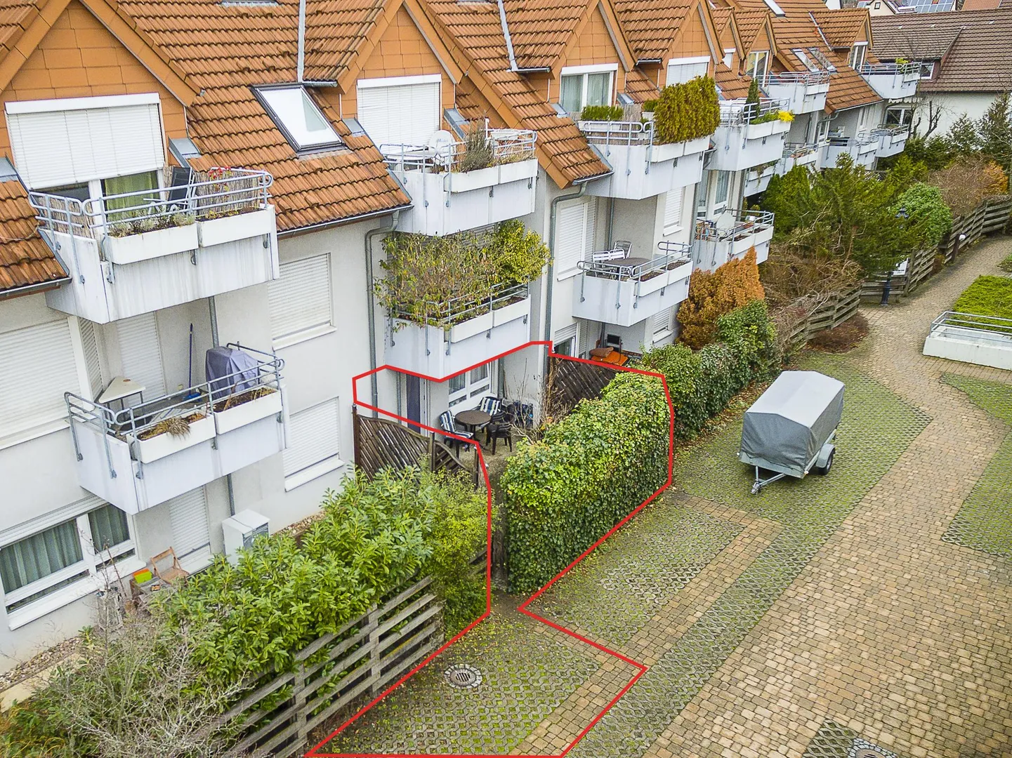Zur Wohnung gehören ein Abstellraum im Untergeschoss sowie ein Kfz-Außenstellplatz vor der Terrasse.