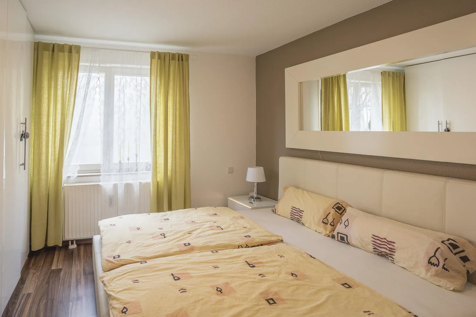 Die Böden im Flur, in der Küche sowie im Badezimmer sind gefliest. Im Schlafzimmer und im Wohnzimmer sind Laminatböden verlegt.