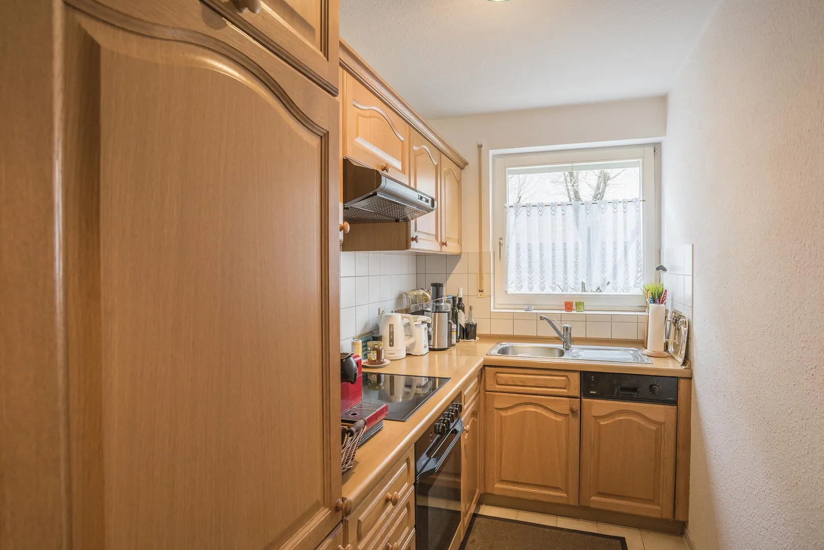 Die ältere Einbauküche beinhaltet einen Kühlschrank, einen Ceran-Herd mit Außendunstabzug, eine Spülmaschine sowie Ober- und Unterschränke. Ein Gefrierschrank ist nicht enthalten.