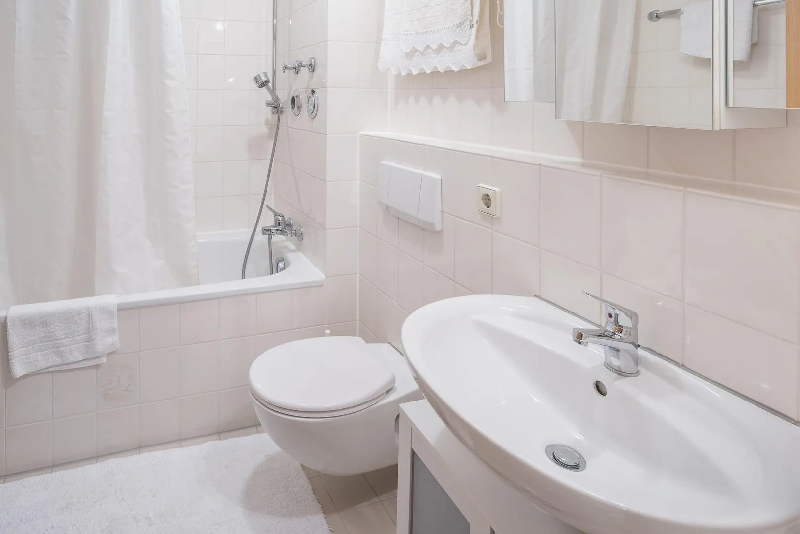 Das raumhoch geflieste Badezimmer ist mit einer Badewanne, einem Waschbecken sowie einem WC ausgestattet.