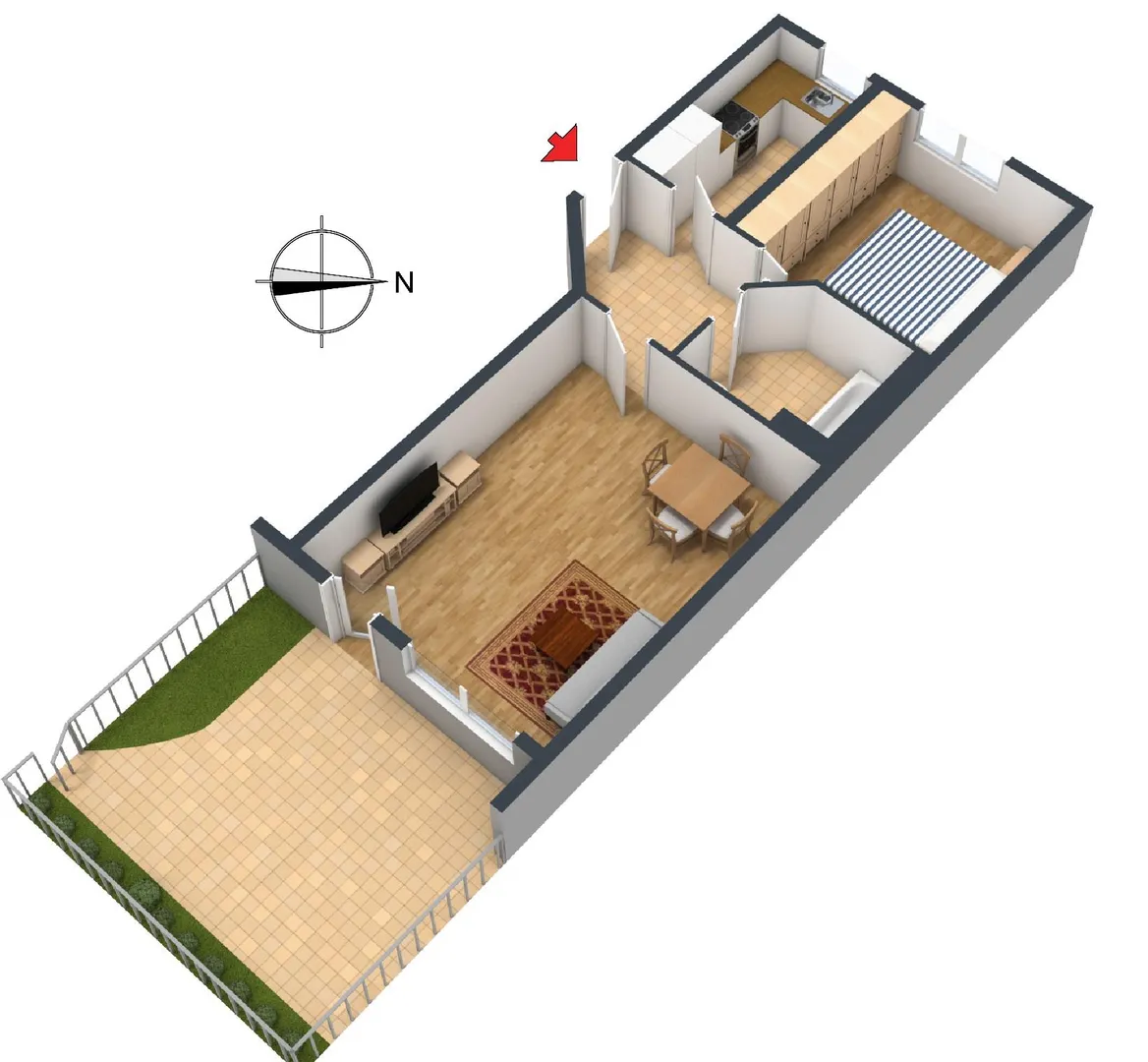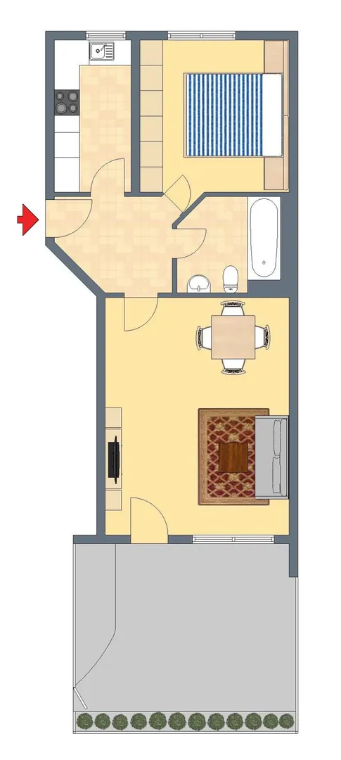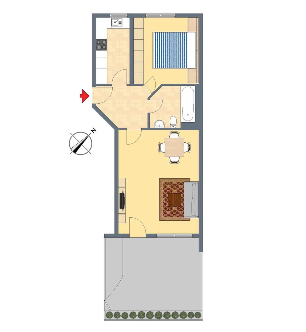 Das Wohnzimmer ist nach Südosten, das Schlafzimmer und die Küche sind nach Nordwesten ausgerichtet.