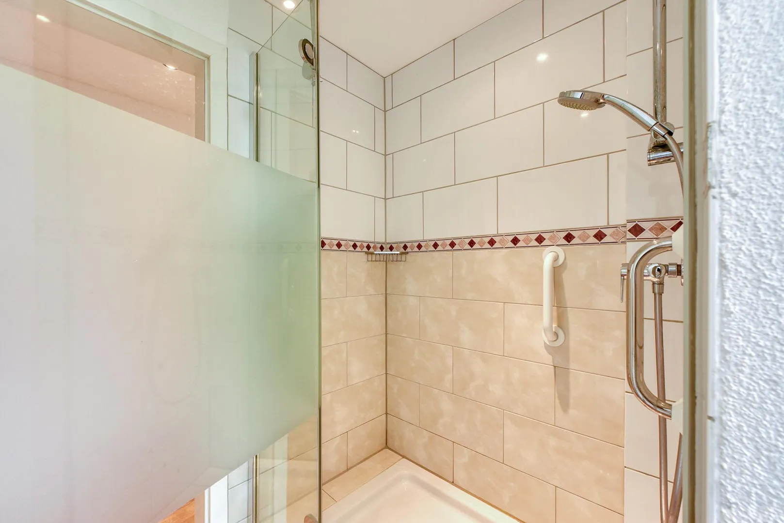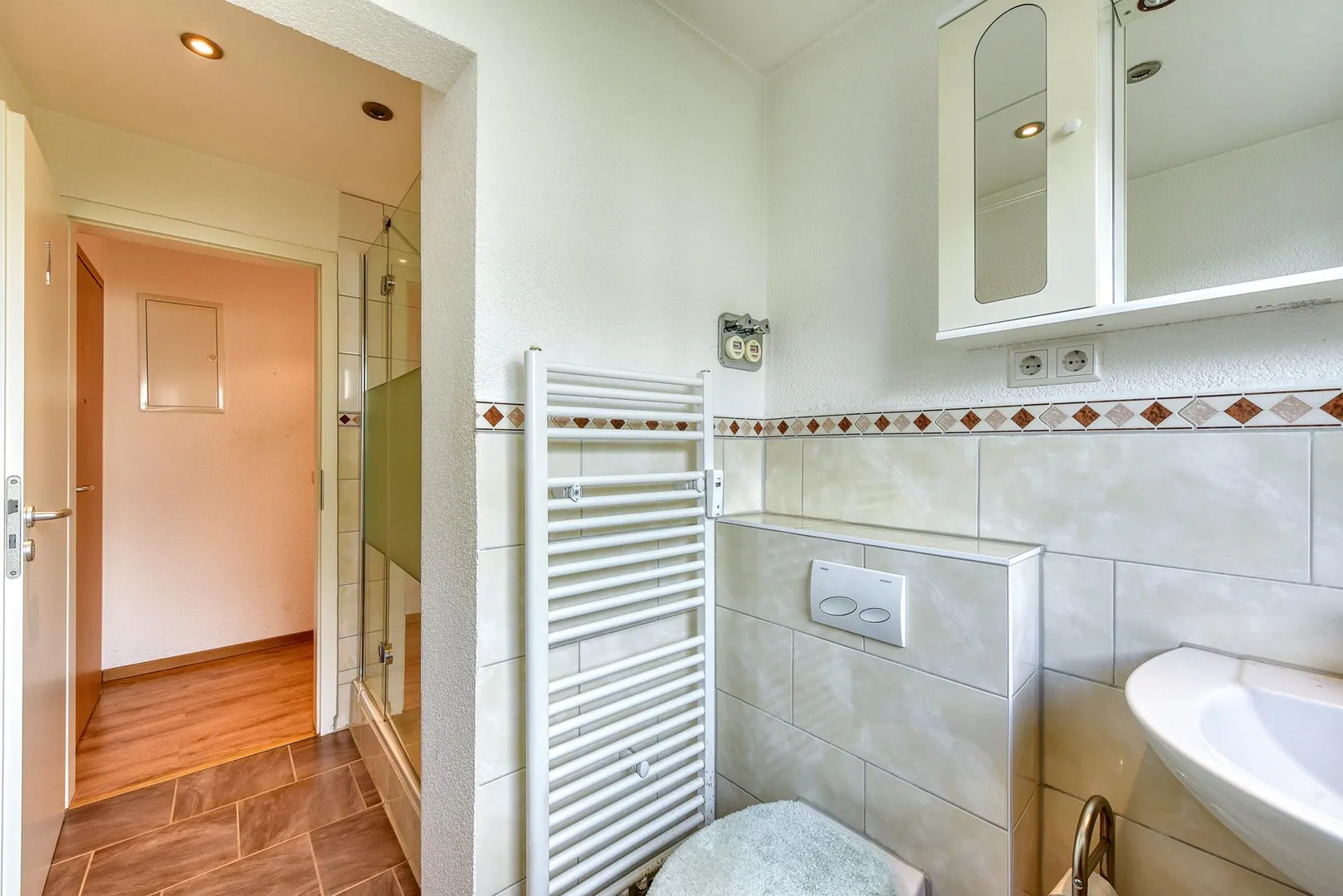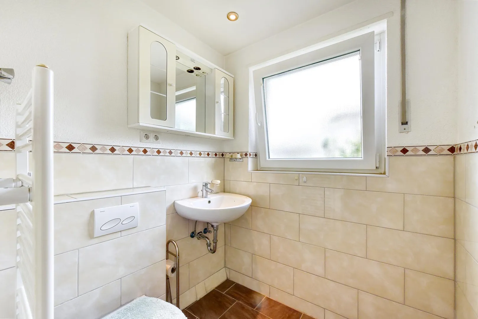 Das geflieste Tageslicht-Badezimmer ist ausgestattet mit einer Dusche, einem WC, einer abgehängten Decke sowie einem Handtuch-Heizkörper. Das Waschbecken ist beschädigt und muss ausgetauscht werden.