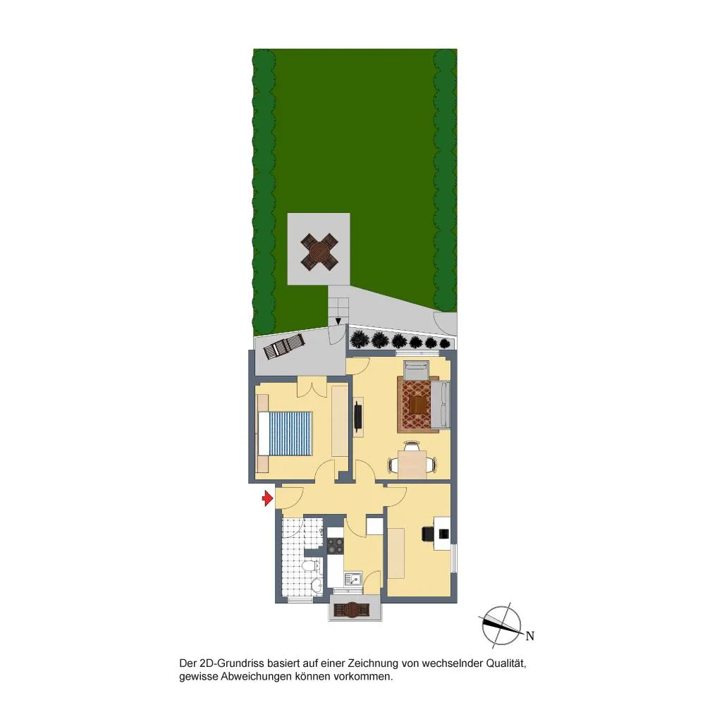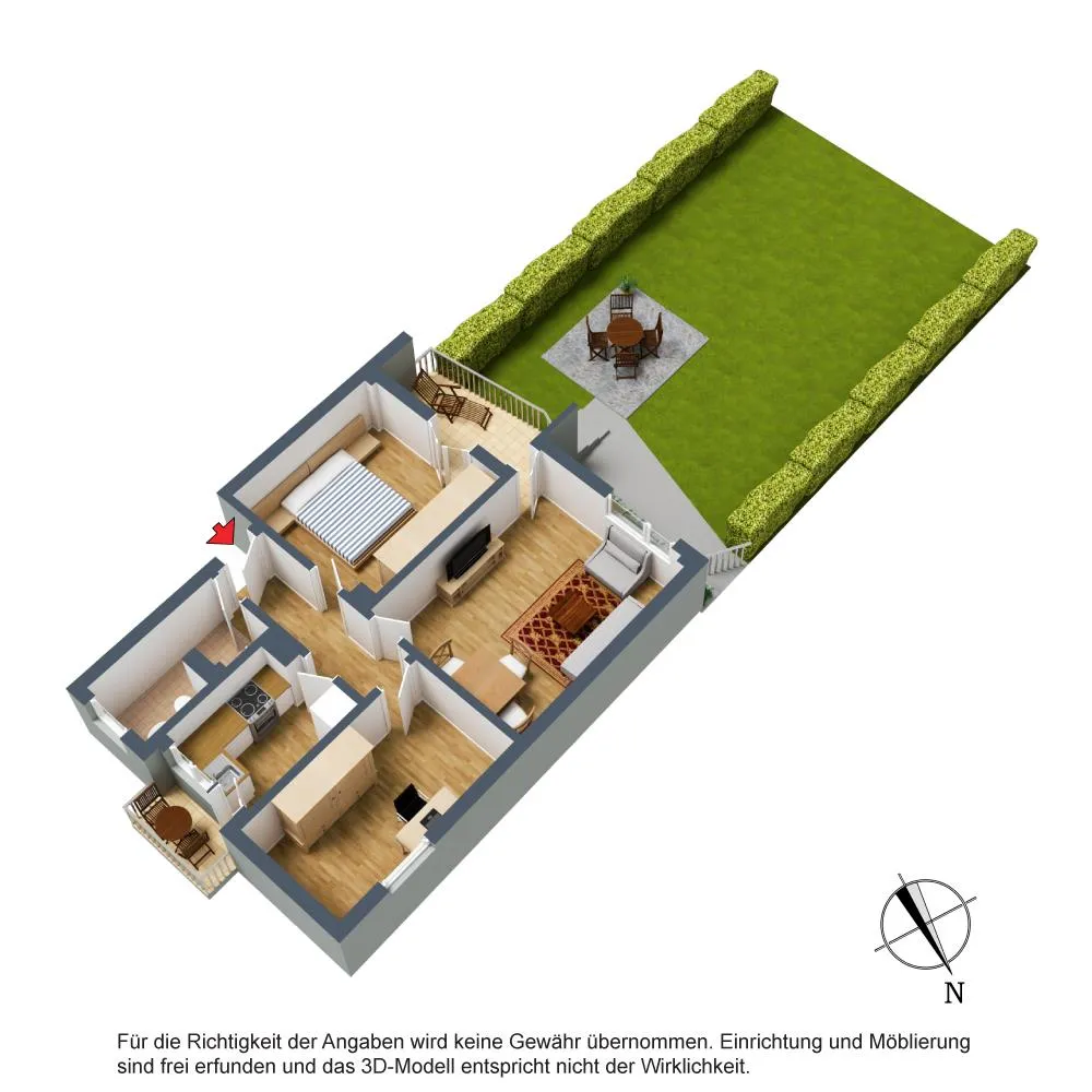 Der Grundriss der Wohnung ist sehr gut. Alle Räume sind direkt vom Flur begehbar. Das Badezimmer verfügt über ein Fenster. Der Süd/West-Balkon ist sowohl über das Wohnzimmer, als auch über das Schlafzimmer begehbar. Der Nord/Ost-Balkon ist über die Küche begehbar. Der Garten mit Terrasse ist sowohl von außen, als auch über den Süd/West-Balkon begehbar.