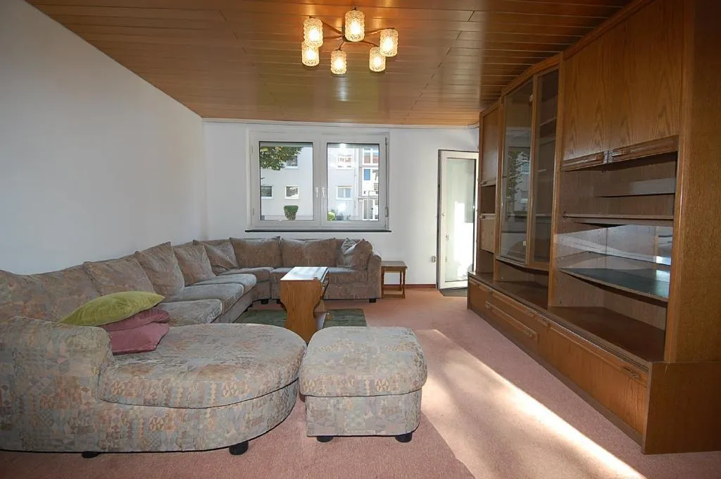 Das Wohnzimmer verfügt über einen Zugang zum Balkon, Flur und Schlafzimmer.