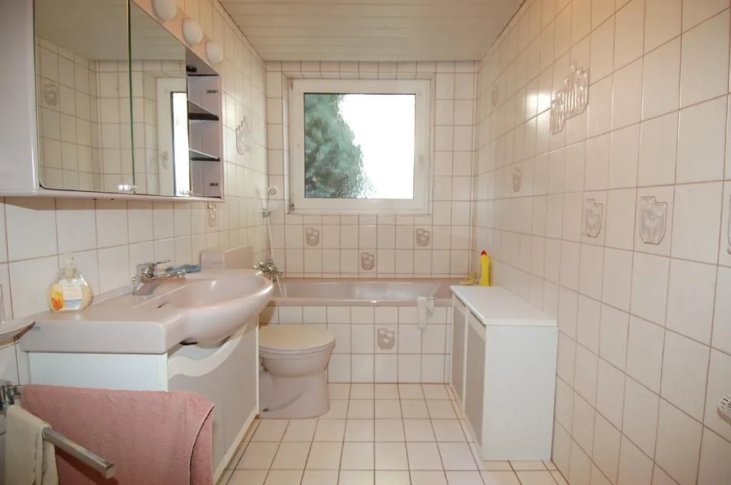 Das Badezimmer mit Tageslichtfenster ist raumhoch gefliest und verfügt über eine Badewanne und ein WC.