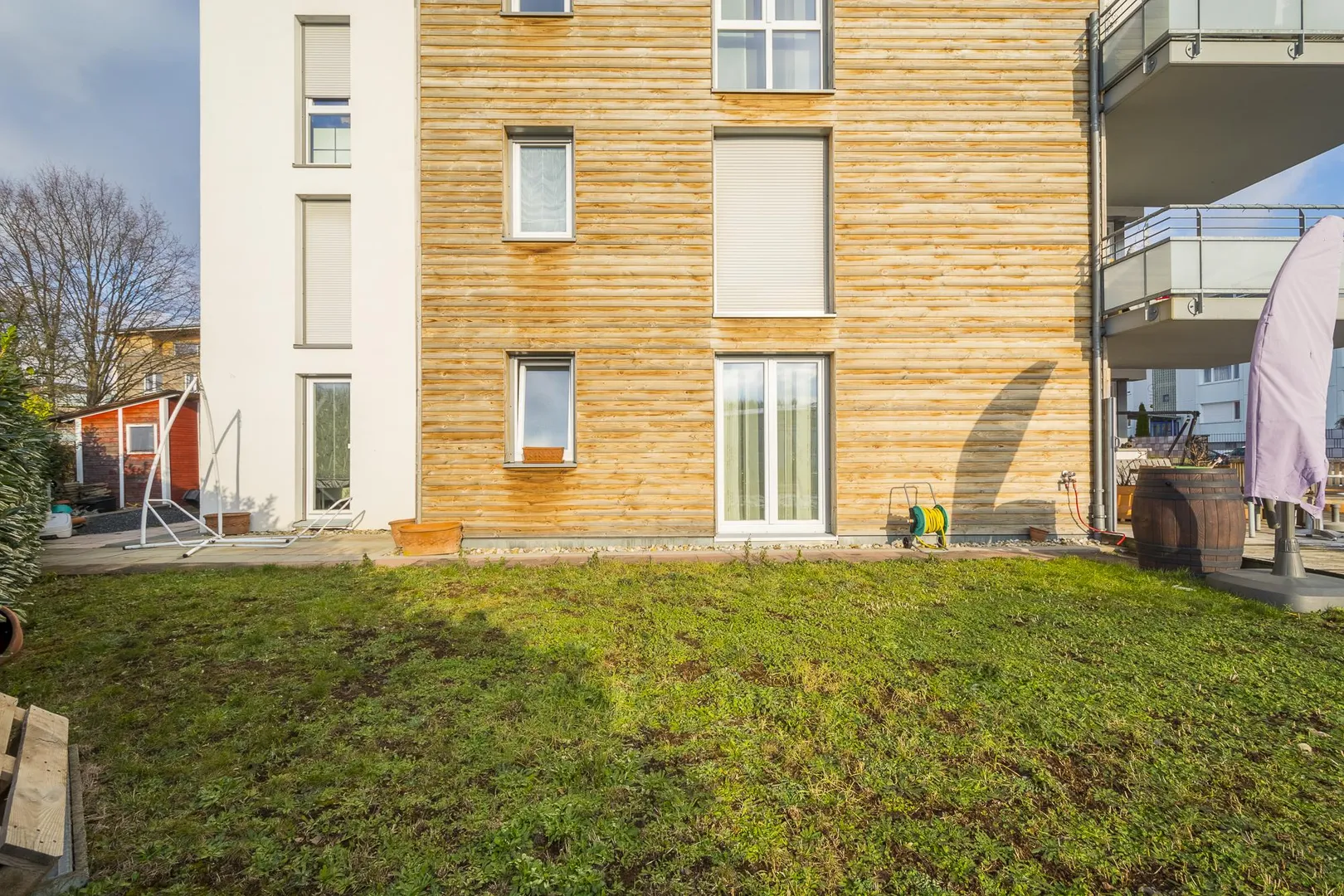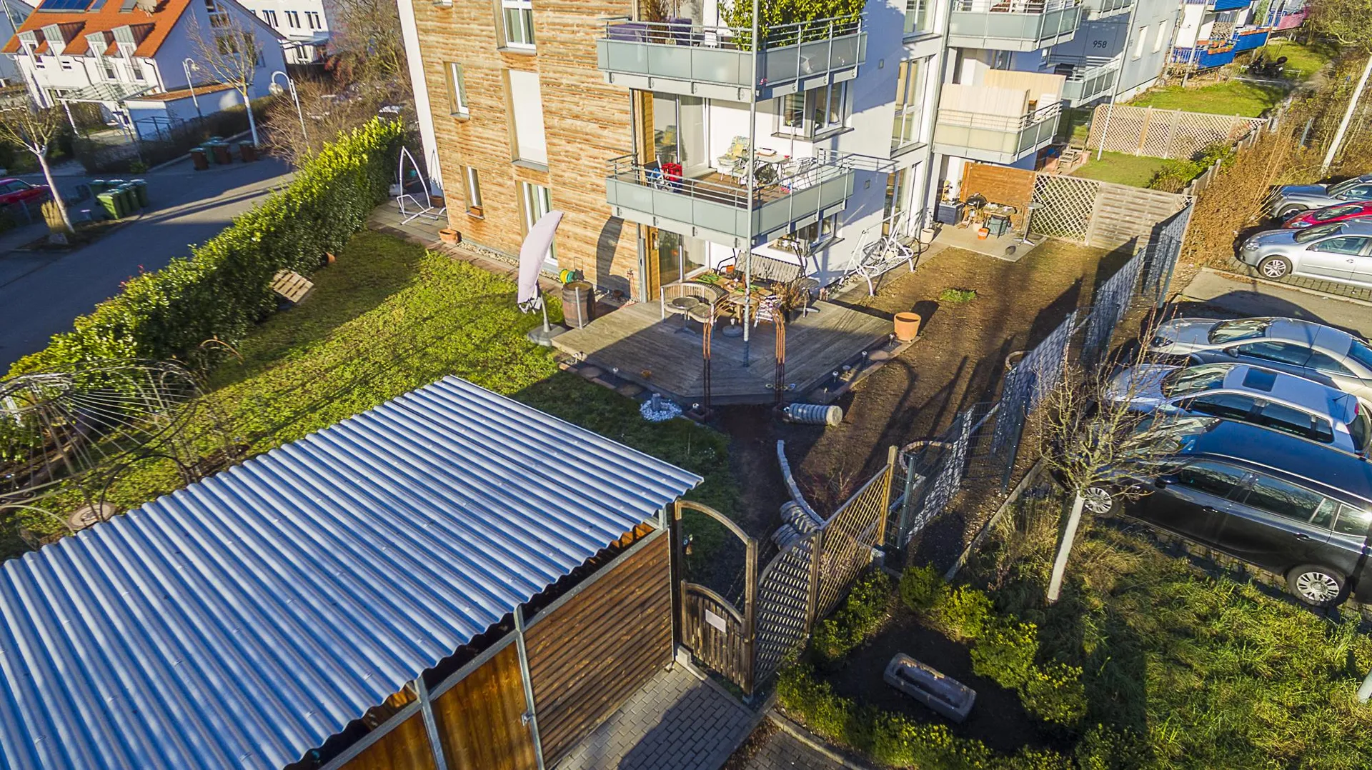 Zur Wohnung gehören das Sondernutzungsrecht am Garten mit einem Geräteschuppen, ein Abstellraum und ein Hobbyraum im Untergeschoss sowie zwei Kfz-Stellplätze in der Tiefgarage.