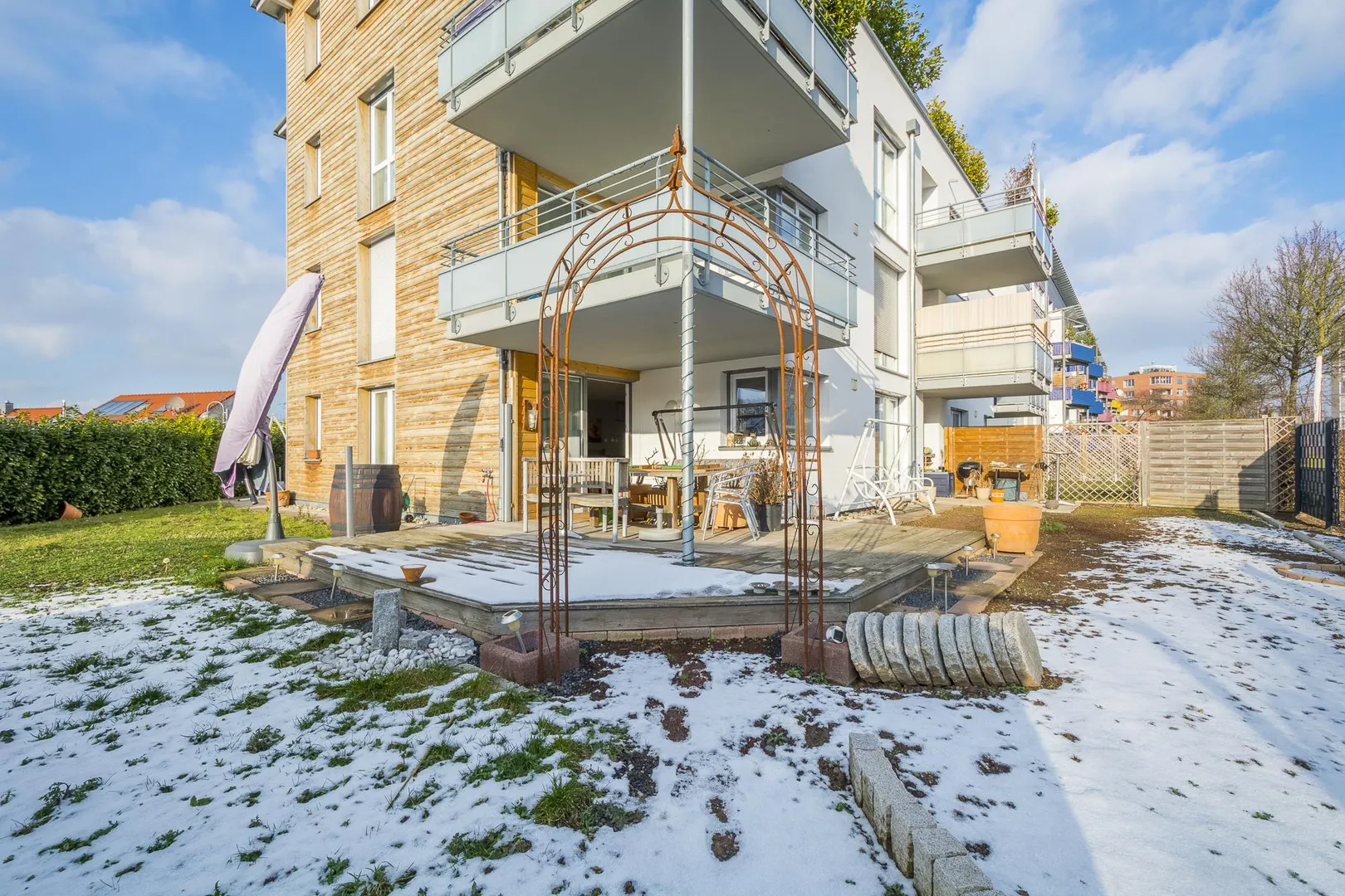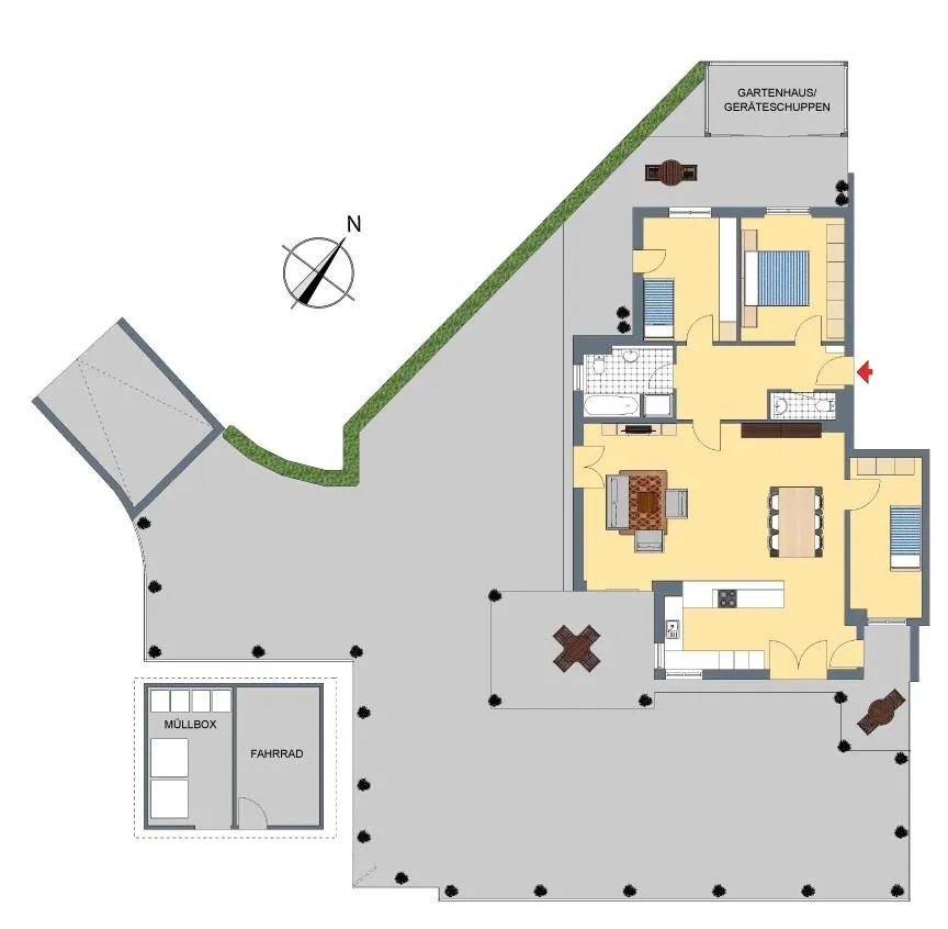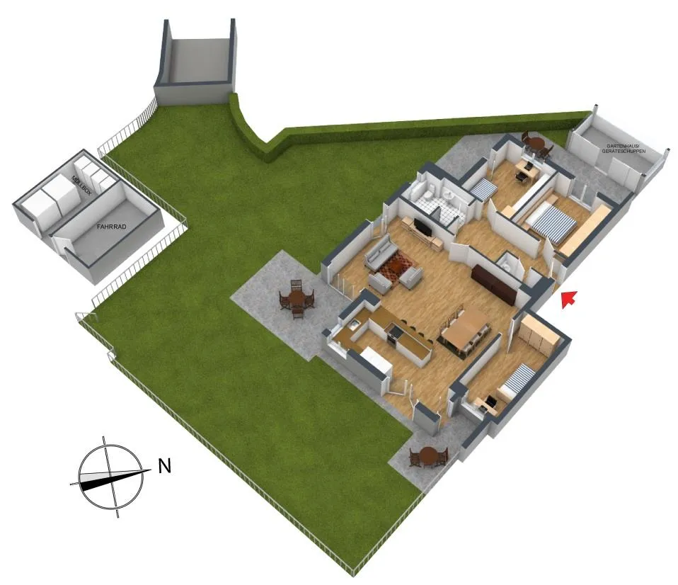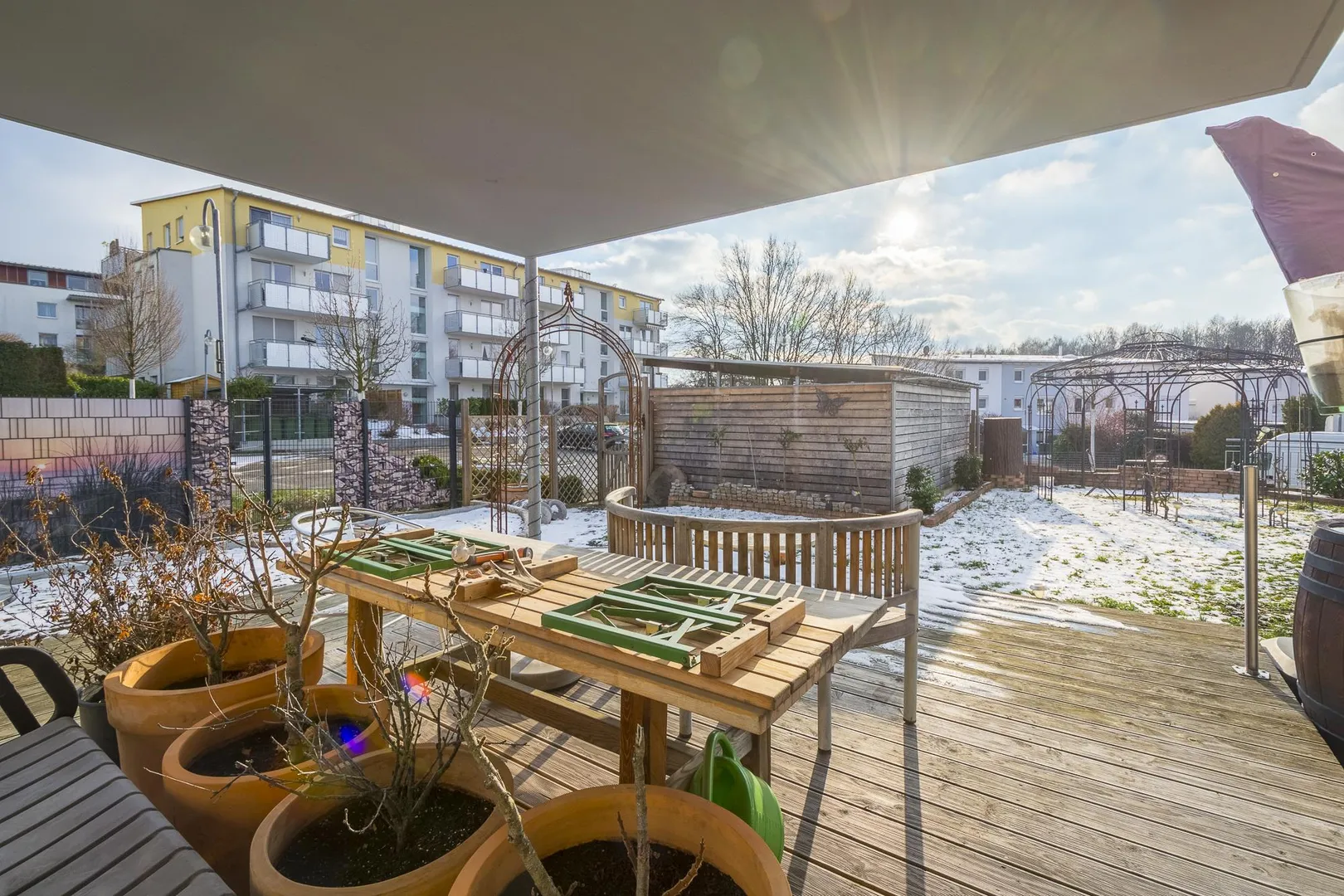 Die Wohnung und der Garten bekommen den ganzen Tag Sonne, weil sie nach Osten, Süden und Westen ausgerichtet sind.