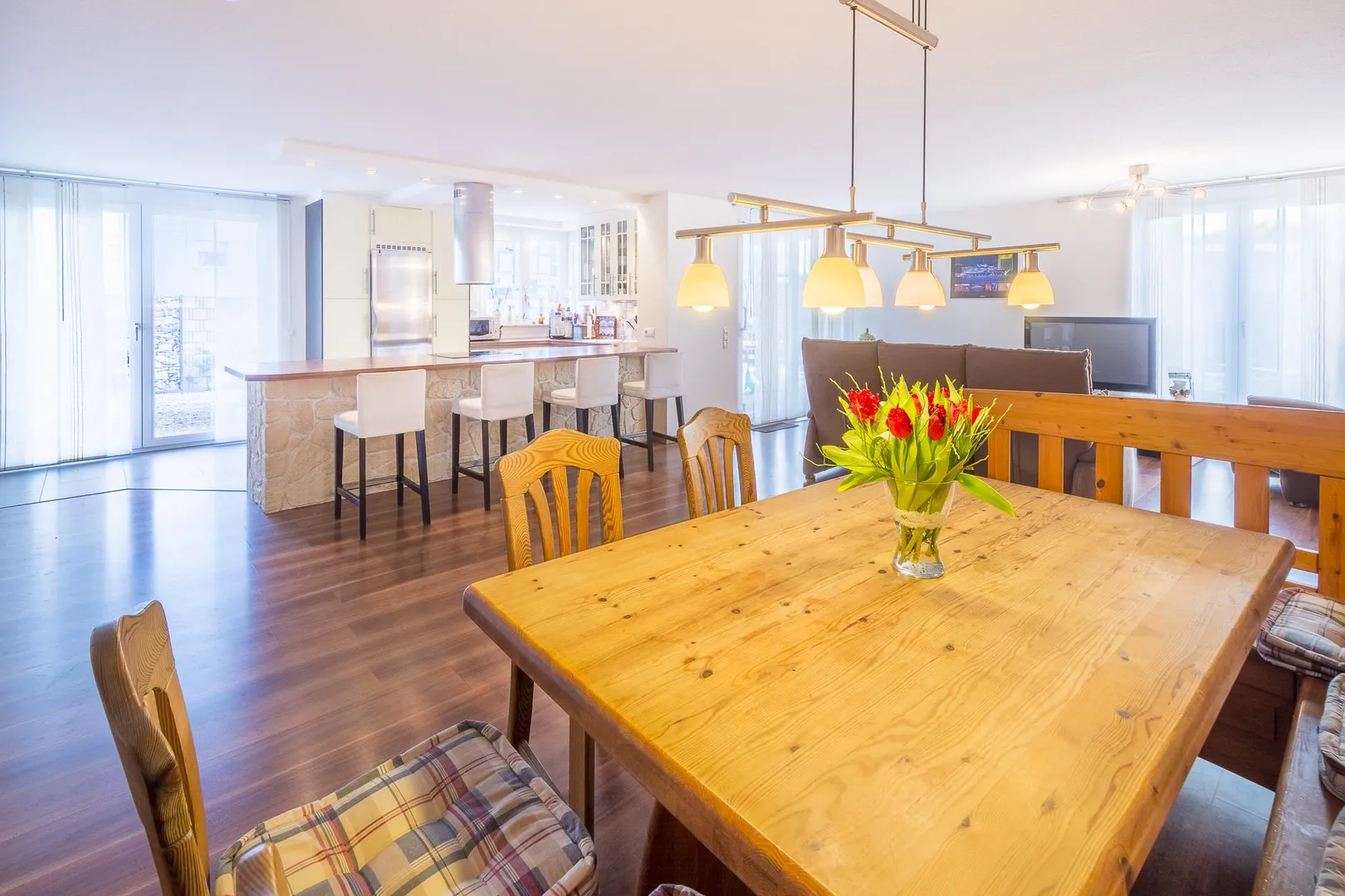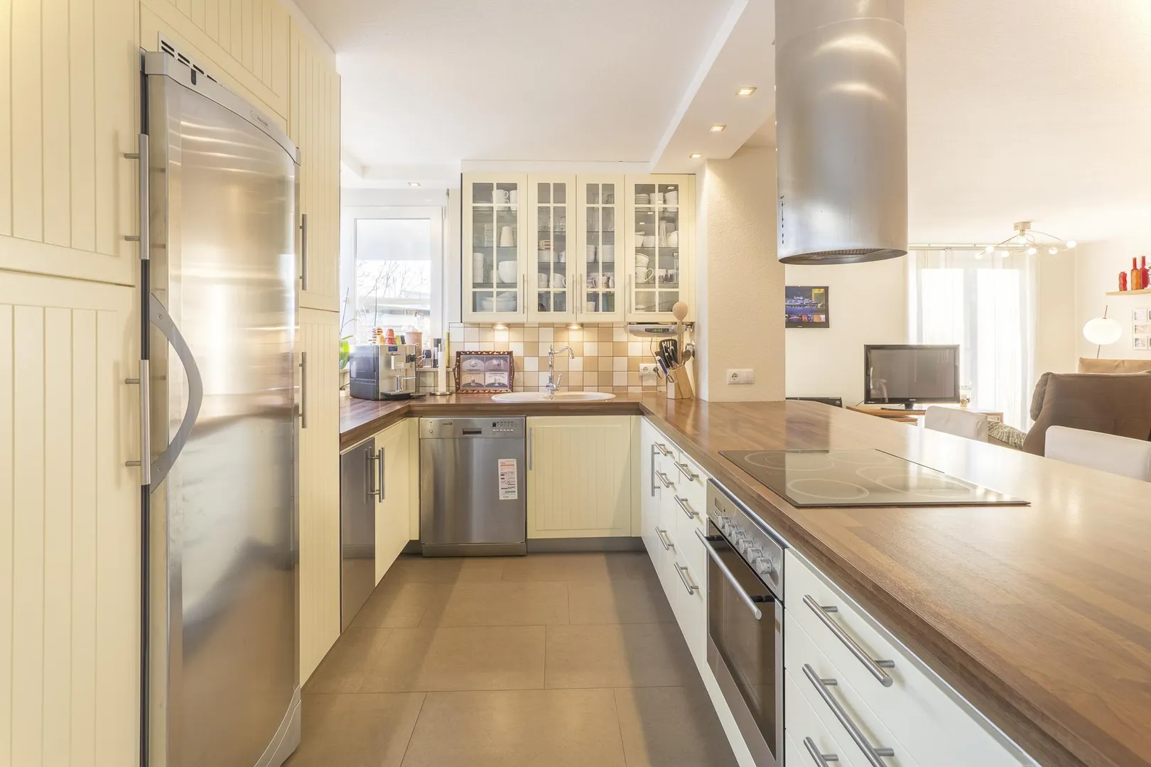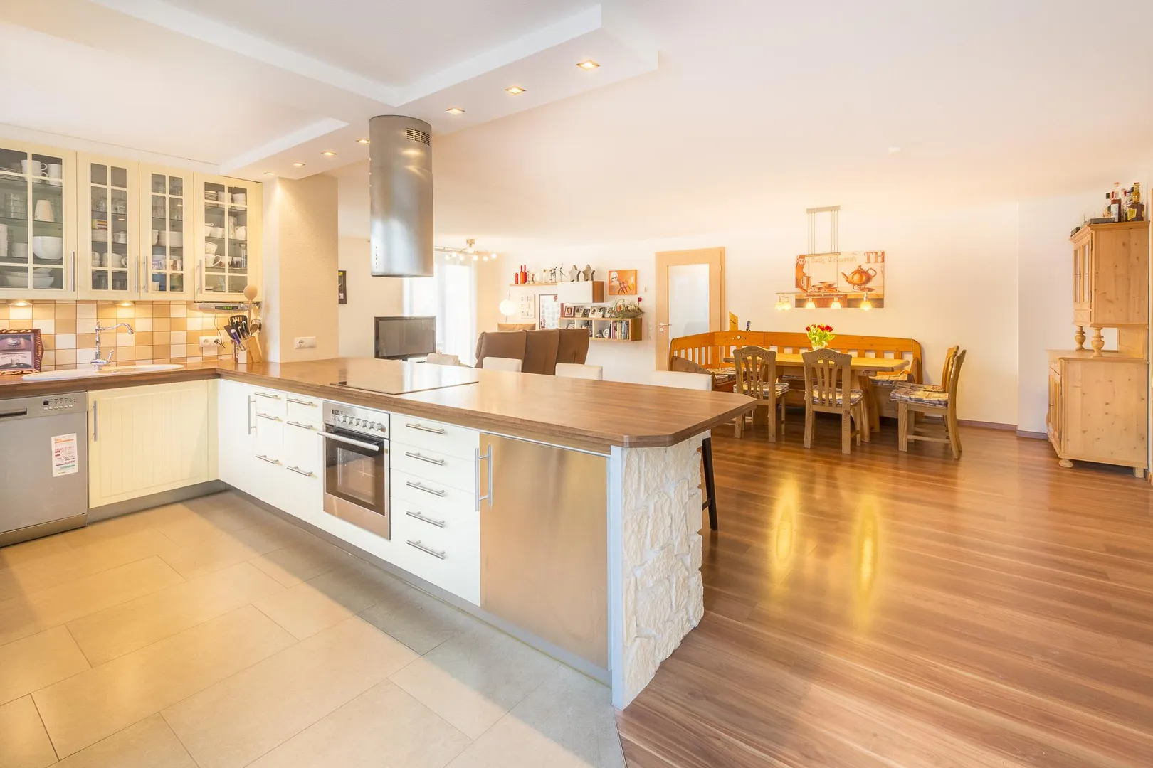 Die offene Küche ist mit einer Einbauküche und einem Dunstabzug nach außen ausgestattet.