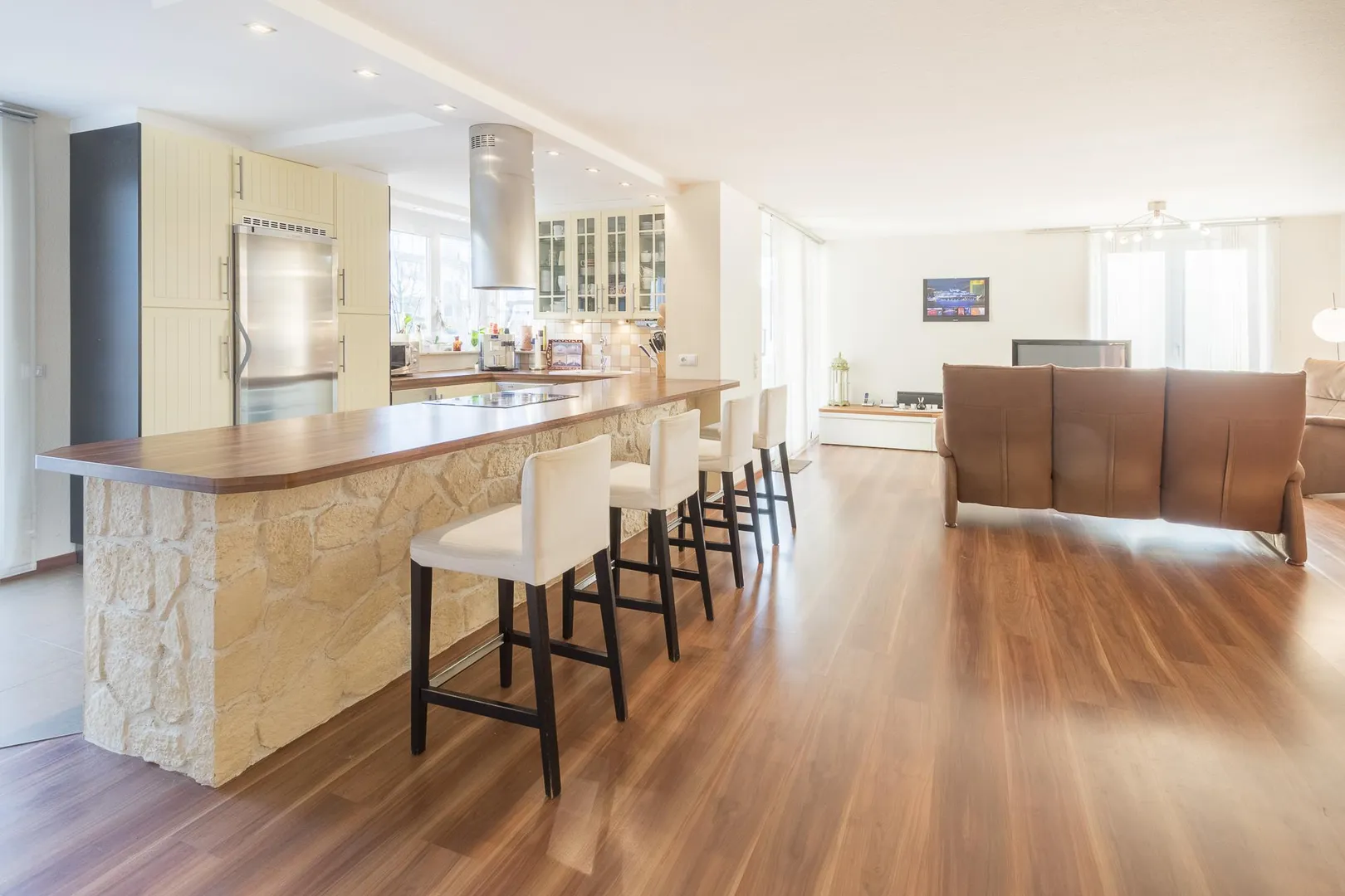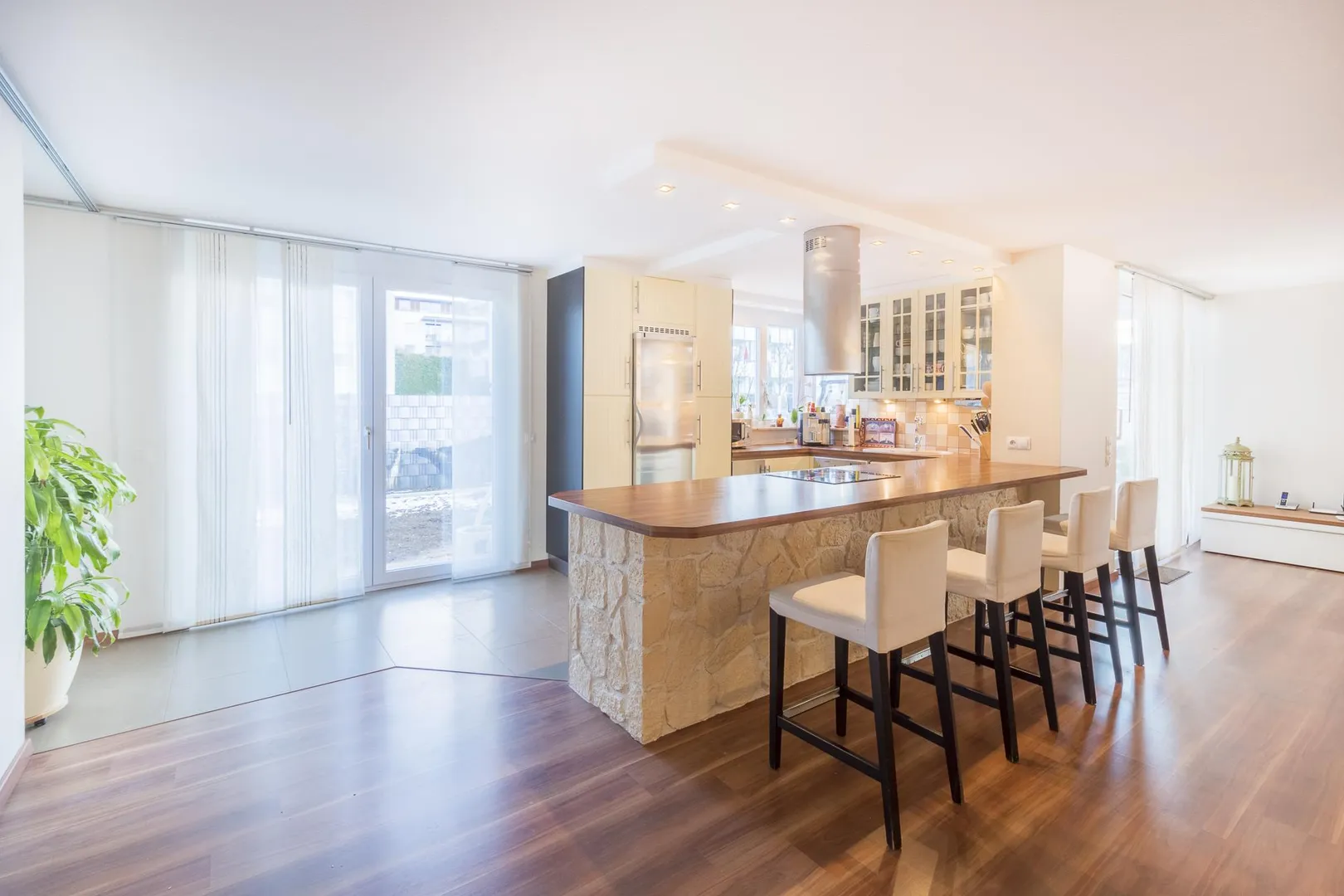 Der Wohn-/Essbereich mit der offenen Küche stellen mit ca. 55 m² Wohnfläche den Mittelpunkt der Wohnung dar und verfügen über zwei Außen-Terrassen.