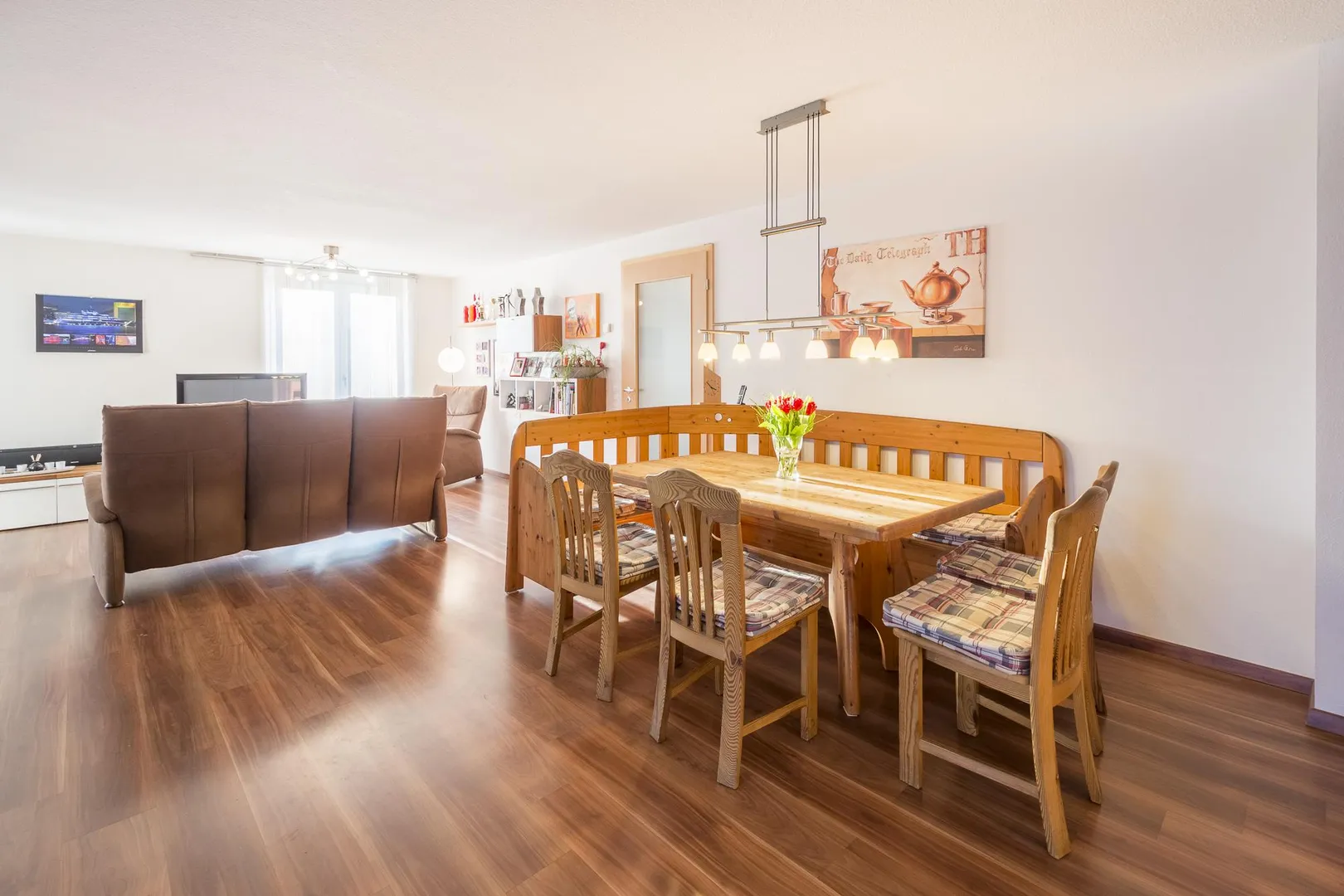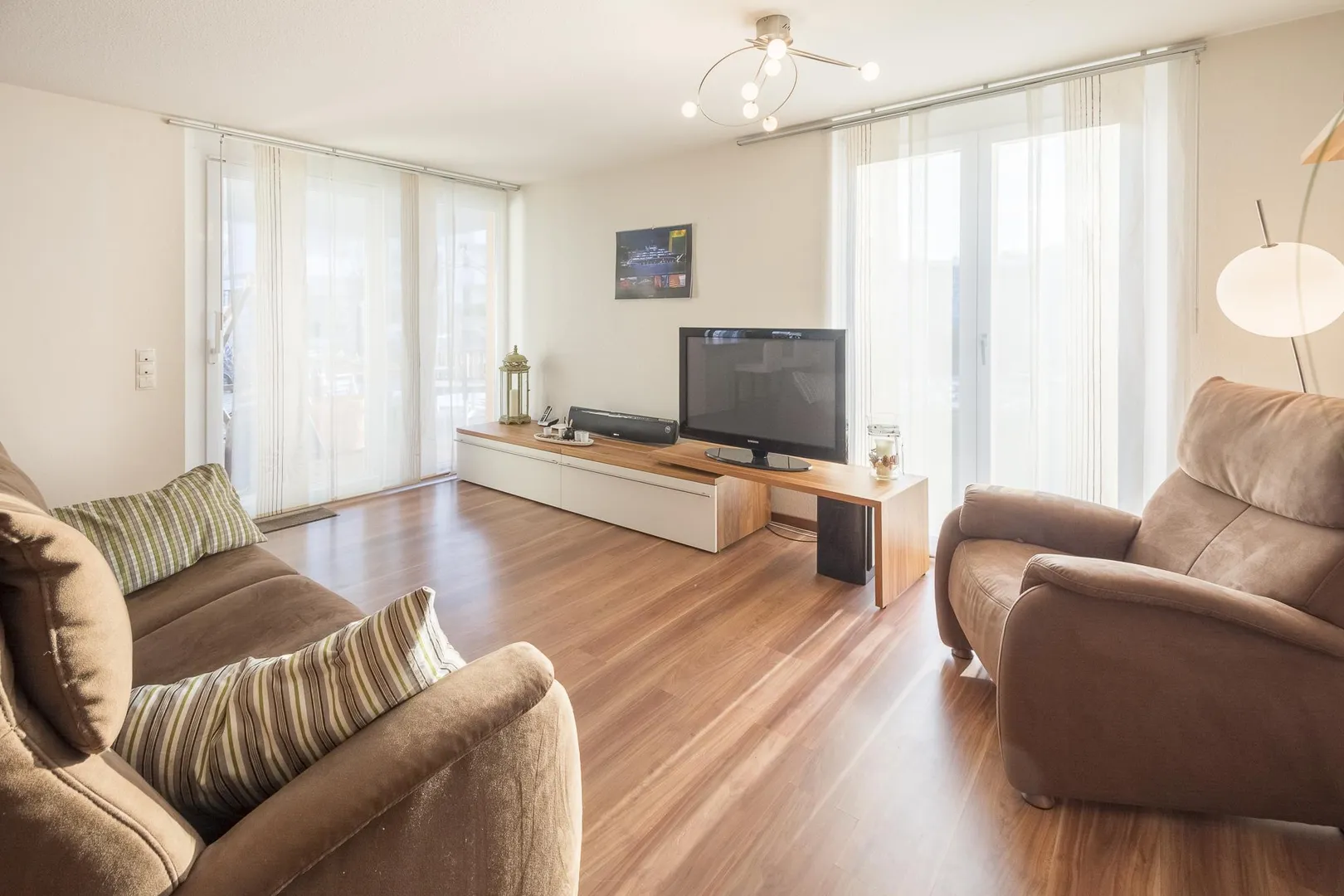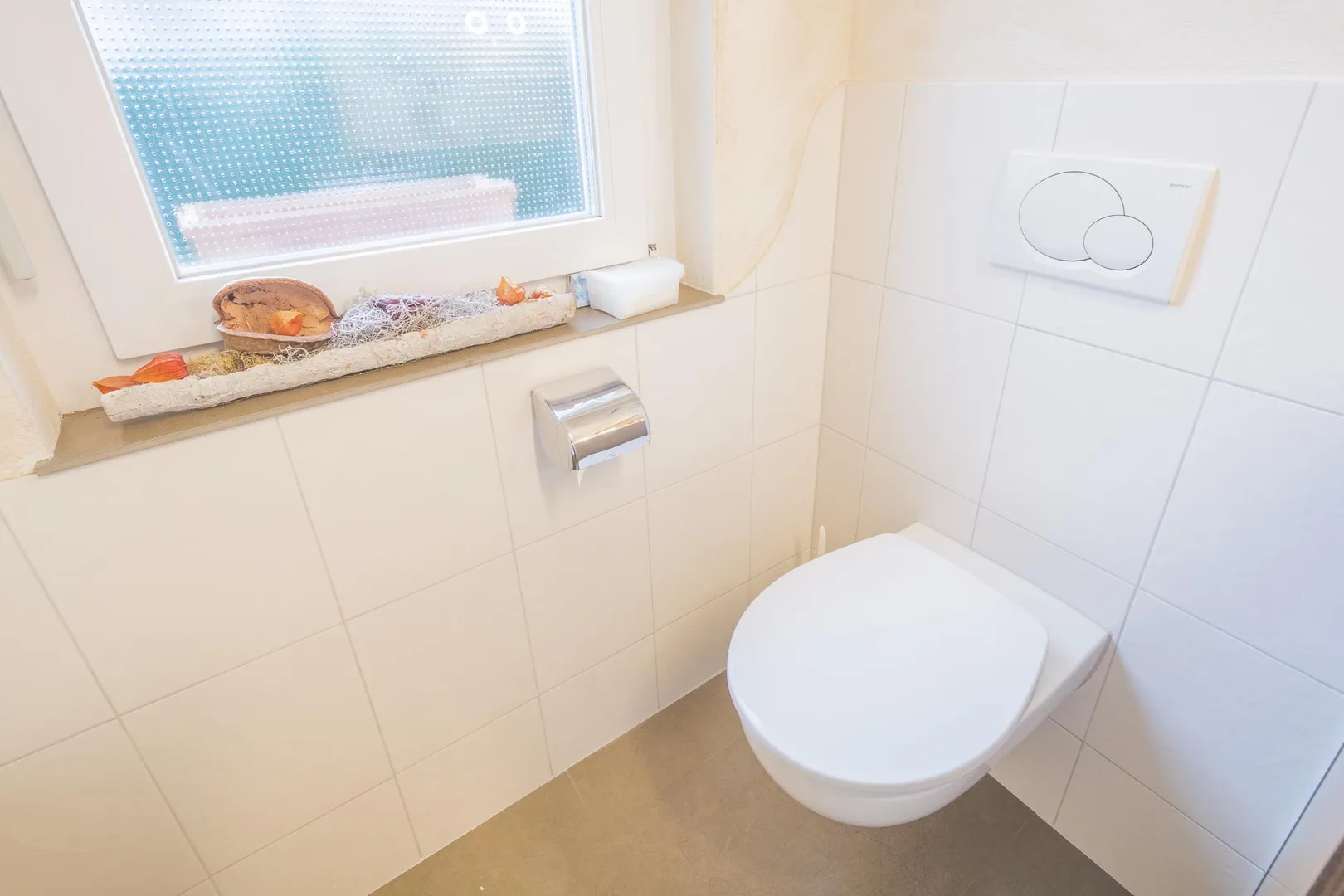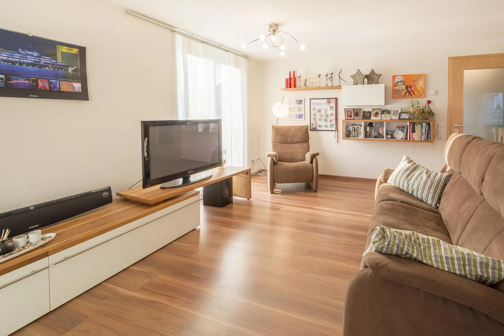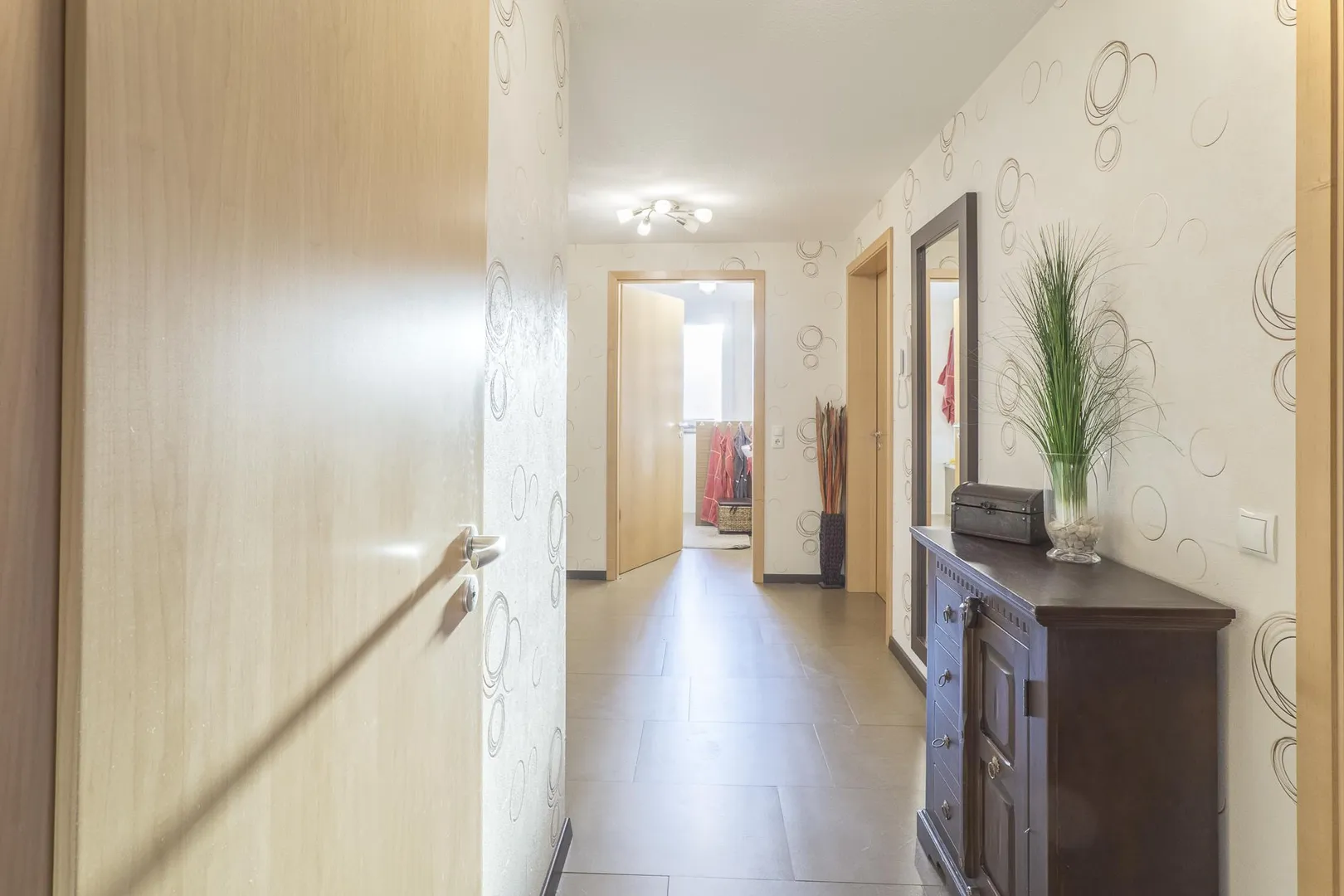 Die Böden in den Zimmern sind mit Laminat ausgestattet. Die Böden im Flur, im Küchenbereich, im Badezimmer und im separaten WC sind gefliest.
