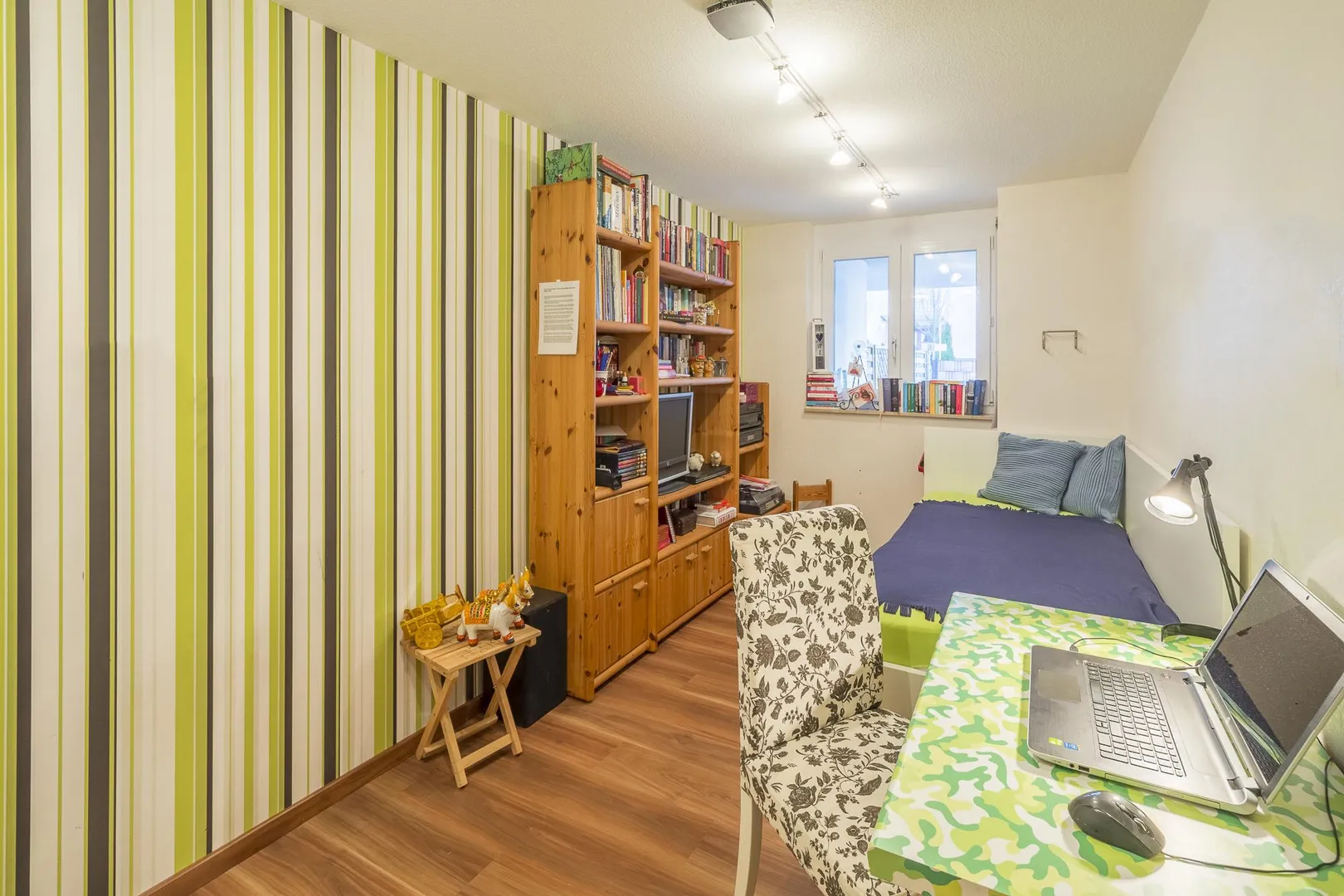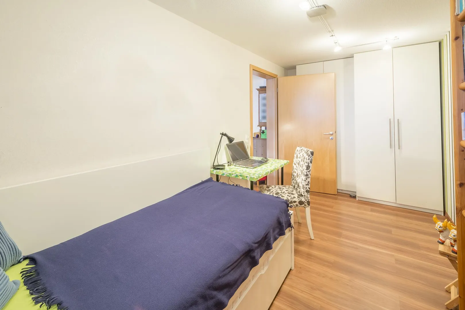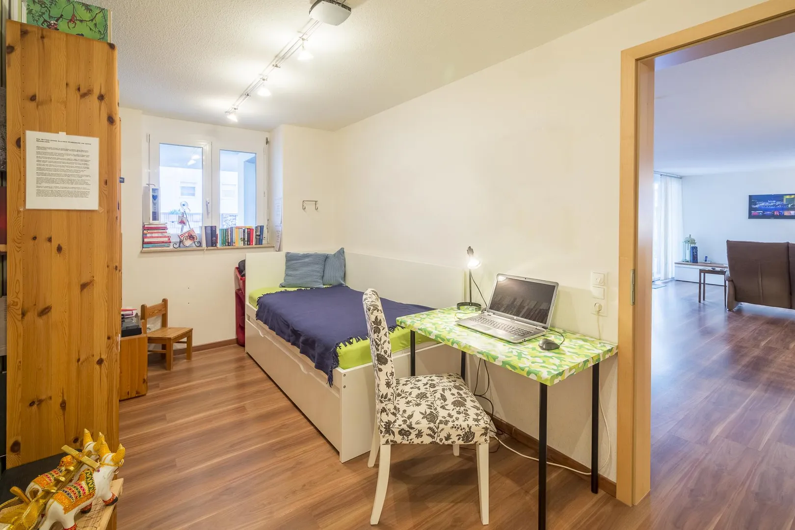 Über den Wohnbereich ist das Arbeitszimmer begehbar. Das Kinderzimmer mit Terrassenzugang ist nach Westen ausgerichtet, das Schlafzimmer ist nach Nord-Westen ausgerichtet. Beide Zimmer sind über den Flur begehbar.