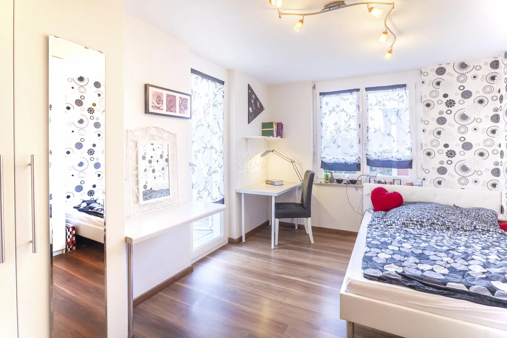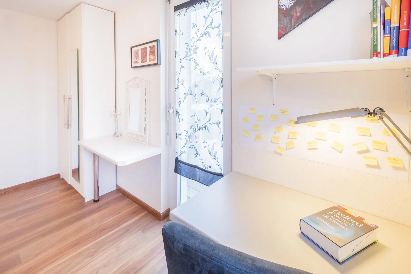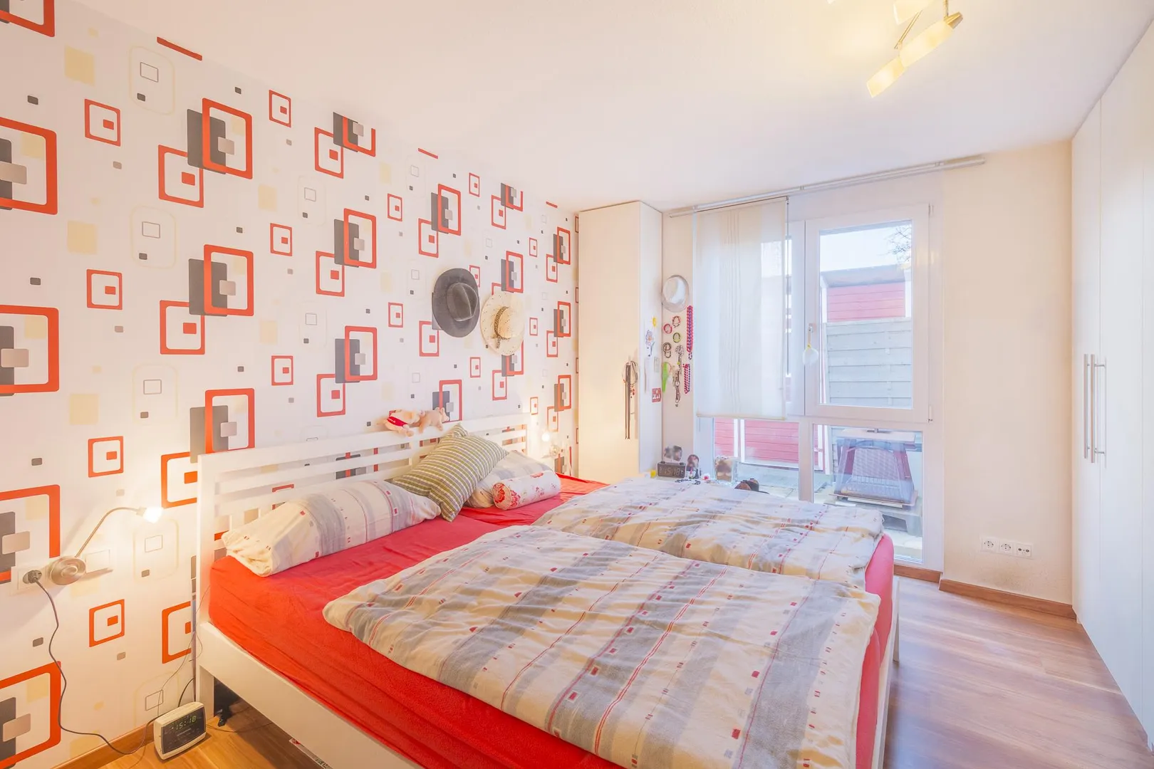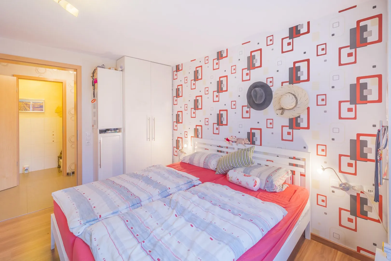 Über den Wohnbereich ist das Arbeitszimmer begehbar. Das Kinderzimmer mit Terrassenzugang ist nach Westen ausgerichtet, das Schlafzimmer ist nach Nord-Westen ausgerichtet. Beide Zimmer sind über den Flur begehbar.