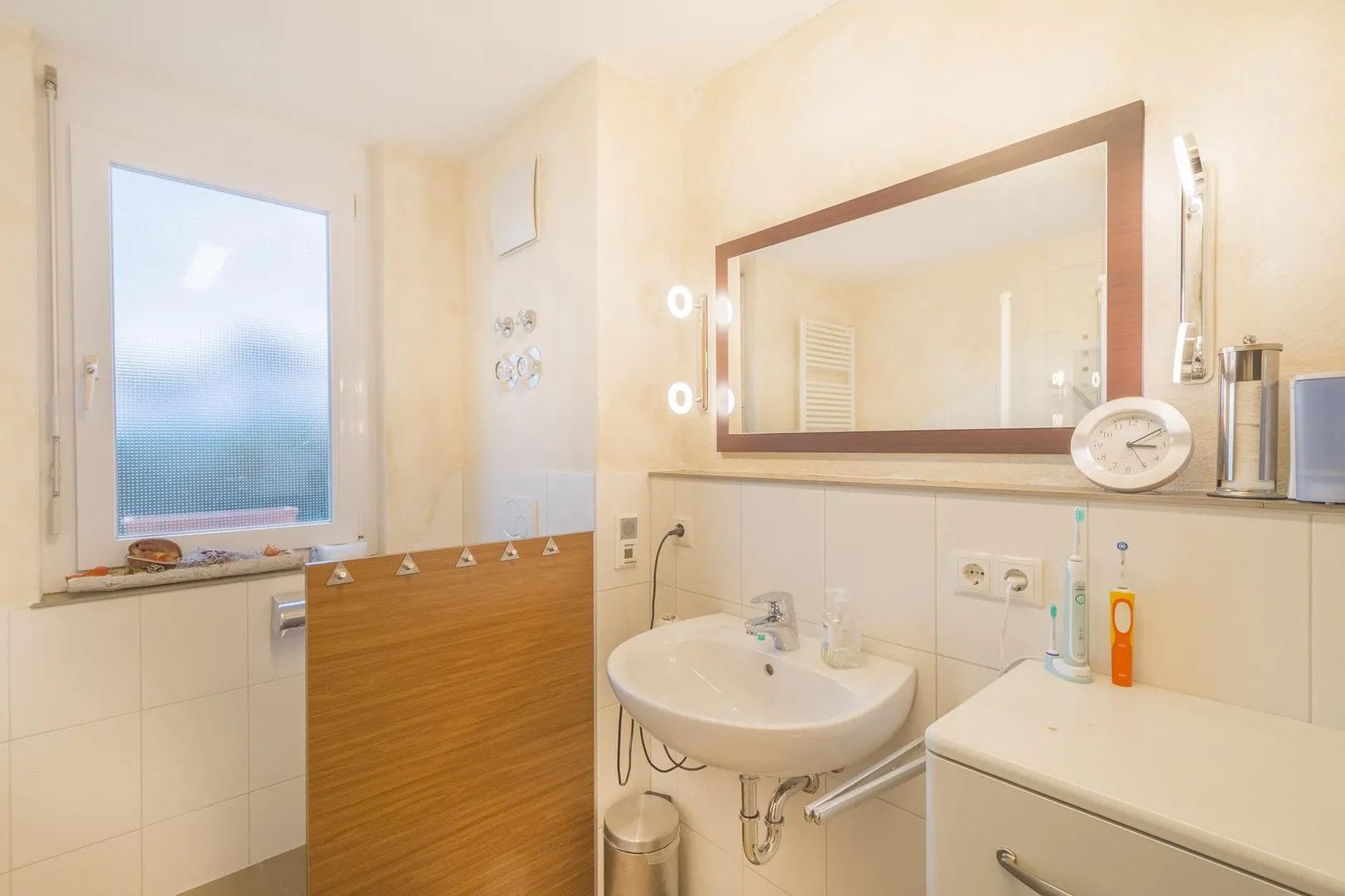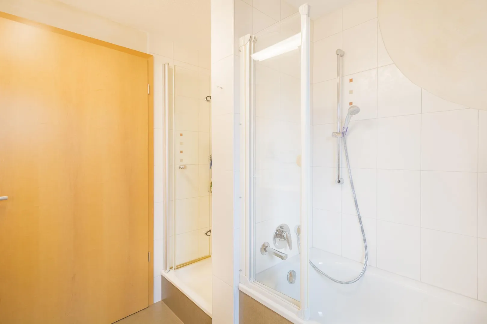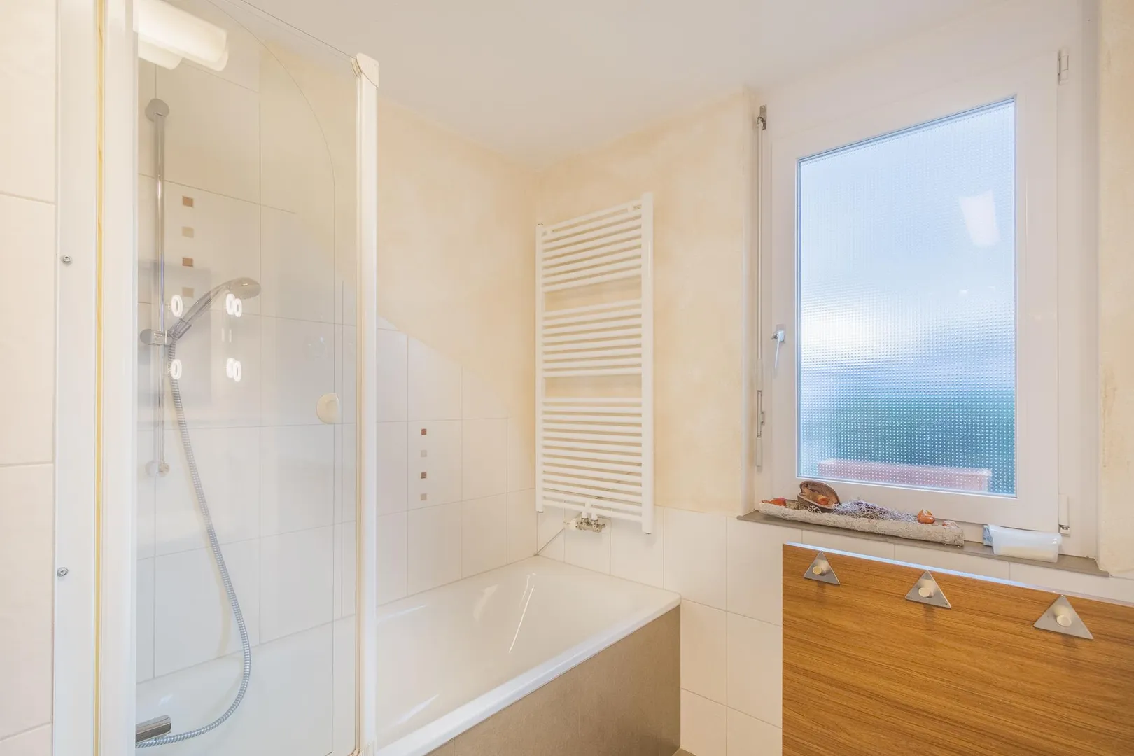 Das Badezimmer mit Fenster ist ausgestattet mit einer Badewanne, einer Dusche sowie einem WC. Ein zweites WC ist separat.