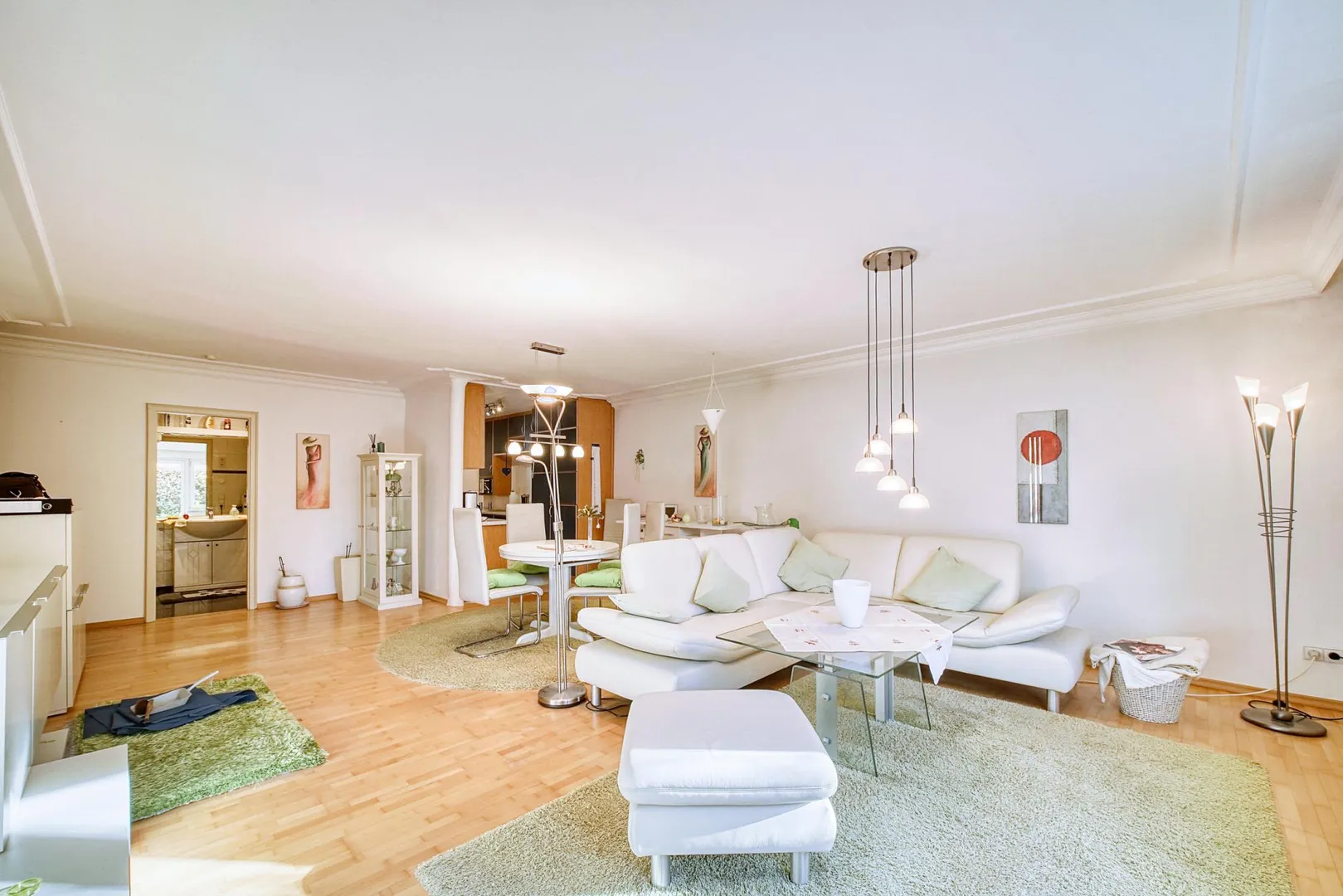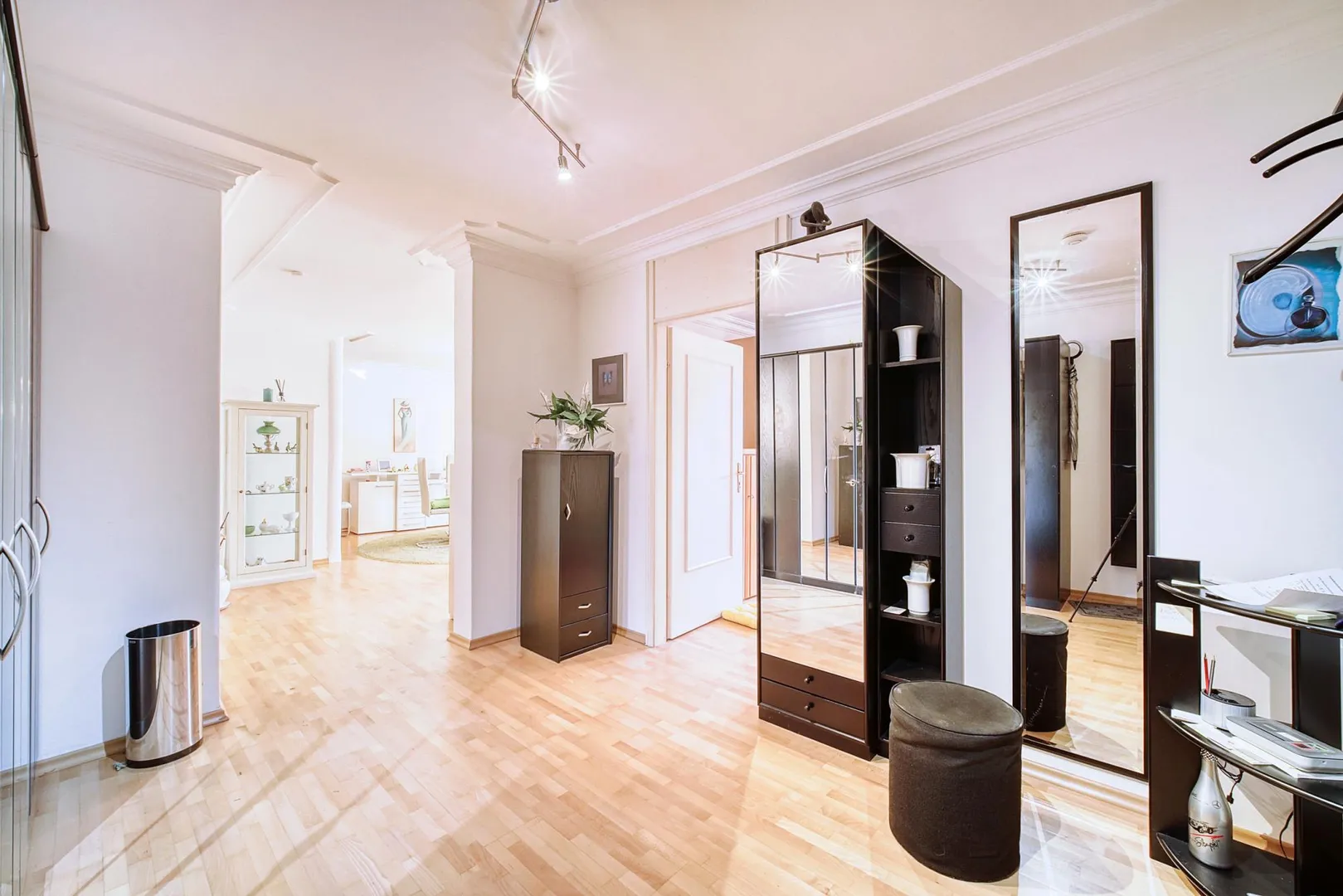 Die Böden in den Zimmern sowie in der Diele sind mit Parkett ausgestattet. Die Wände sind glatt gestrichen. Die Raumhöhen betragen ca. 2,39 Meter.