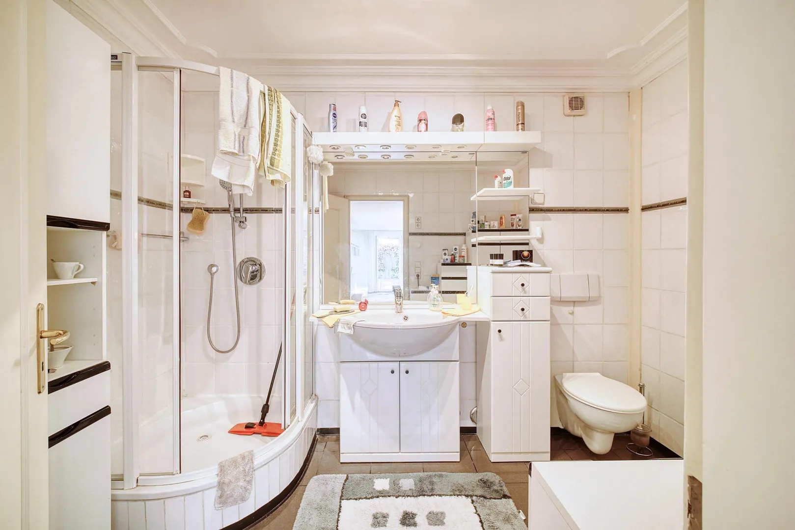 Das raumhoch geflieste Badezimmer ist ausgestattet mit einer Dusche sowie einem WC.