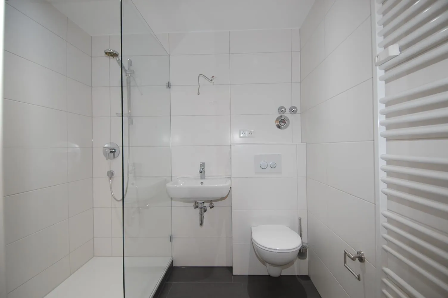Das raumhoch geflieste Badezimmer ist ausgestattet mit einer Dusche, einem WC, einem Handtuch-Heizkörper sowie einem belichteten Spiegelschrank.