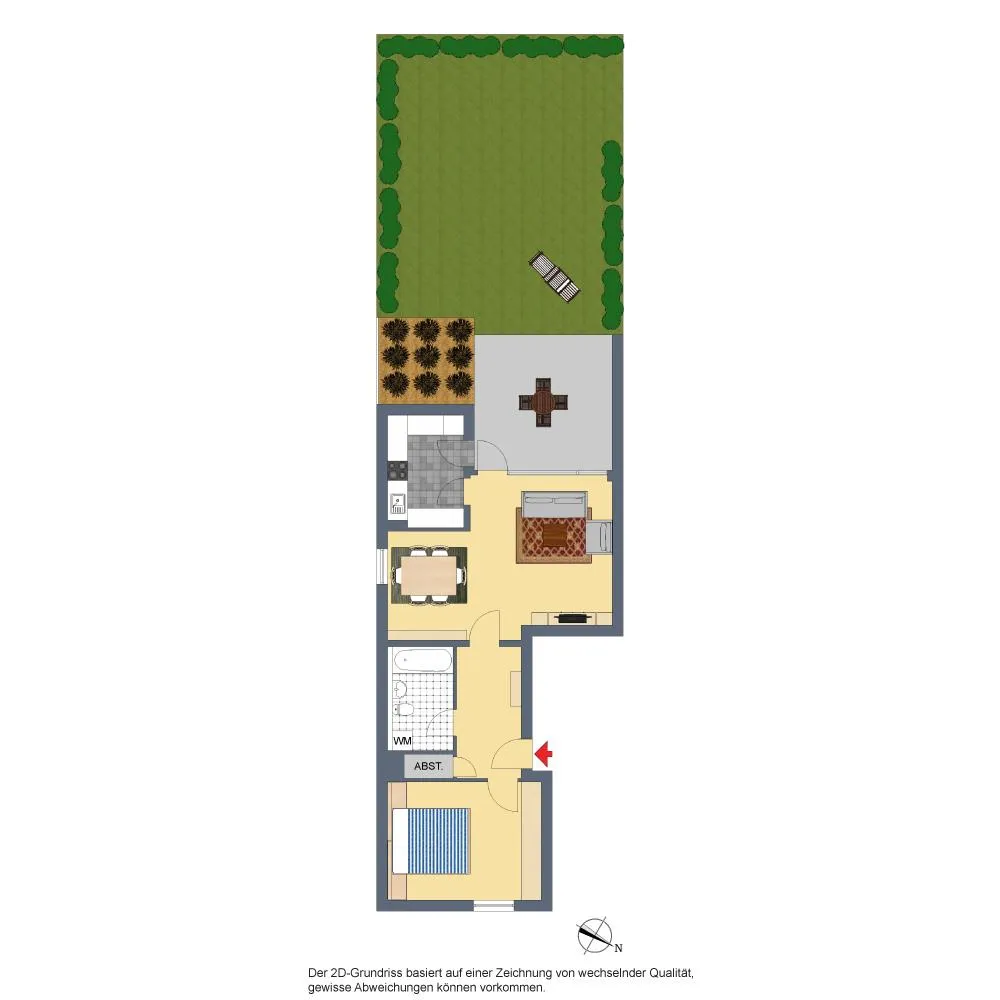 Das Schlafzimmer ist nach Nord-Osten (zum Eingangsbereich) ausgerichtet. Der Wohnbereich mit Terrasse und Grünfläche sind nach Süd-Westen ausgerichtet.