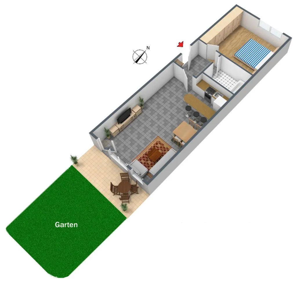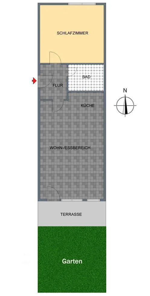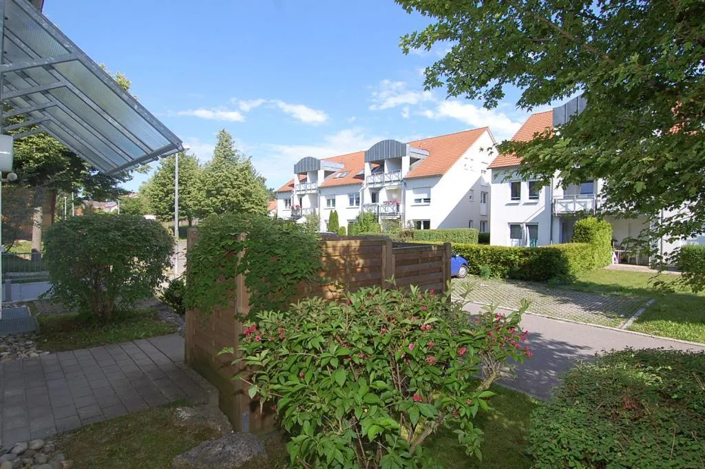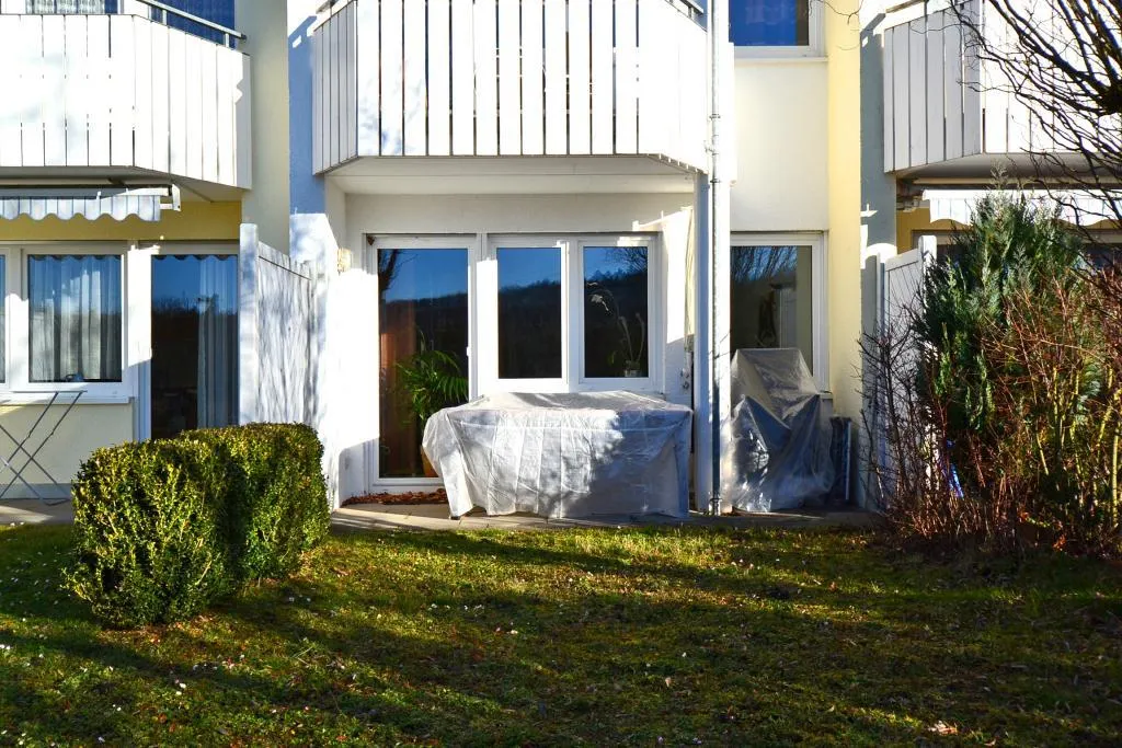 Die Wohnung verfügt über eine ca. 8 m² große und überdachte Süd-Terrasse mit einem ca. 30 m² großen Gartenanteil.