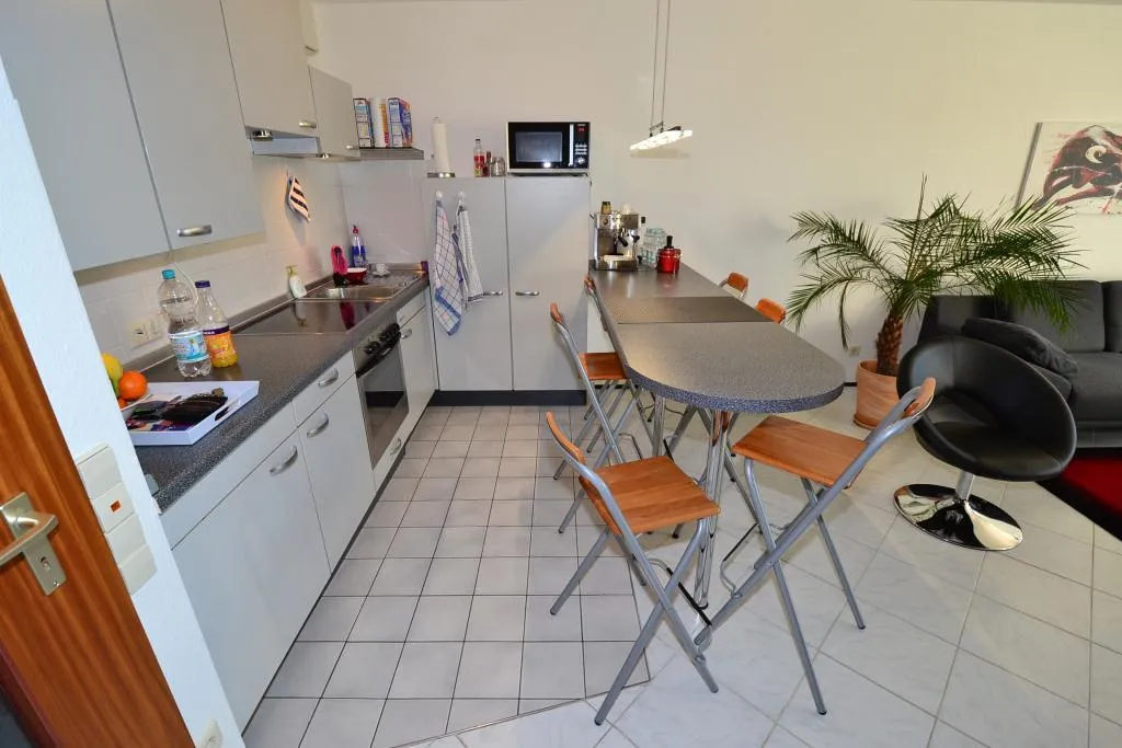Der Fußboden ist gefliest. Die Küche ist mit einer Einbauküche ausgestattet.