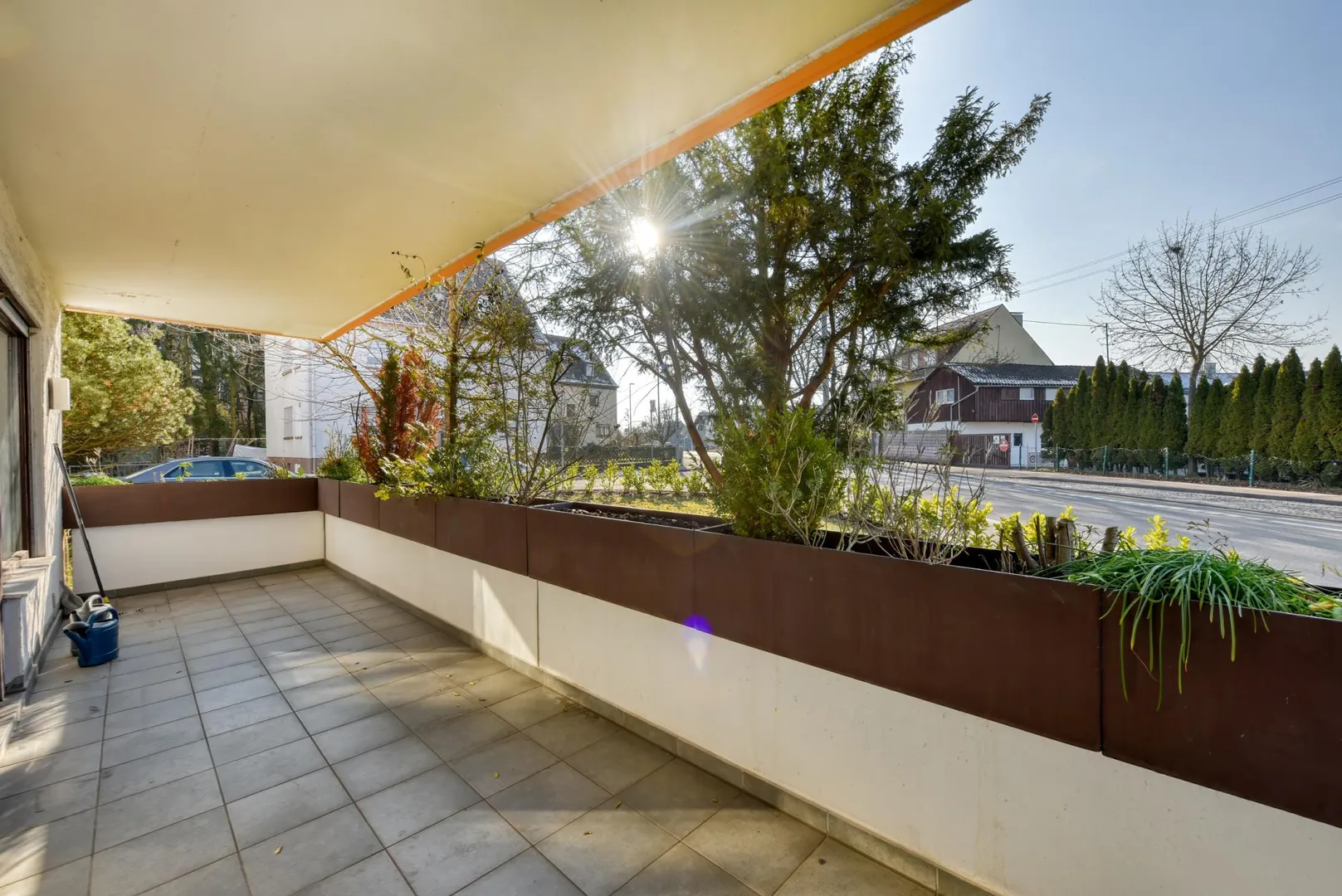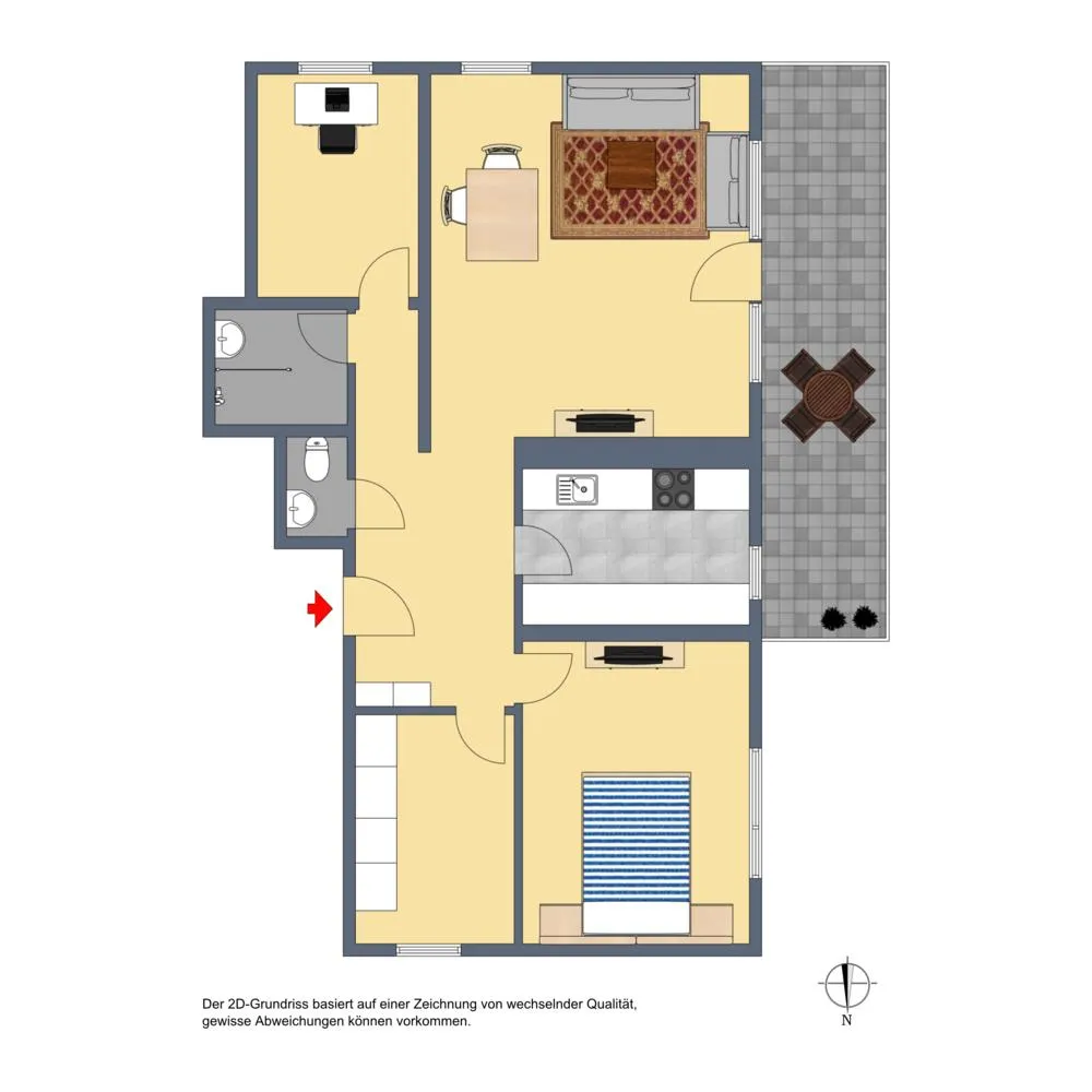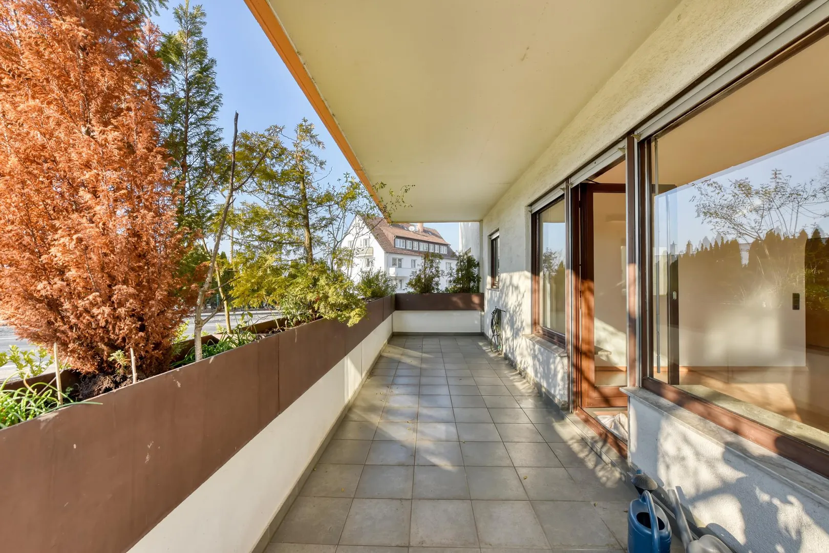 Der Grundriss ist offen gestaltet. Der Wohnbereich ist zur Diele offen. Der 13 m² große und überdachte West-Balkon ist über das Wohnzimmer begehbar. Das kleine Badezimmer sowie das separate WC sind innenliegend.