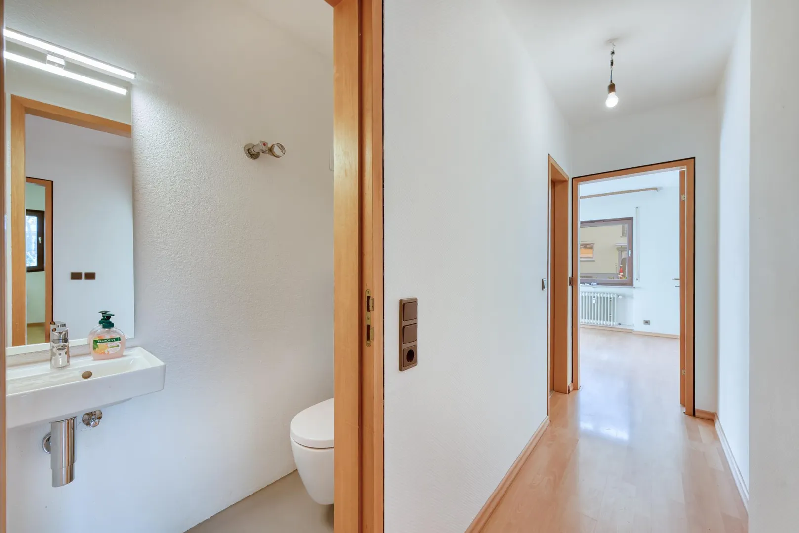 Das separate WC wurde ebenfalls mit einer hochwertigen Spachteltechnik modernisiert und mit einem belichteten Spiegel ausgestattet.