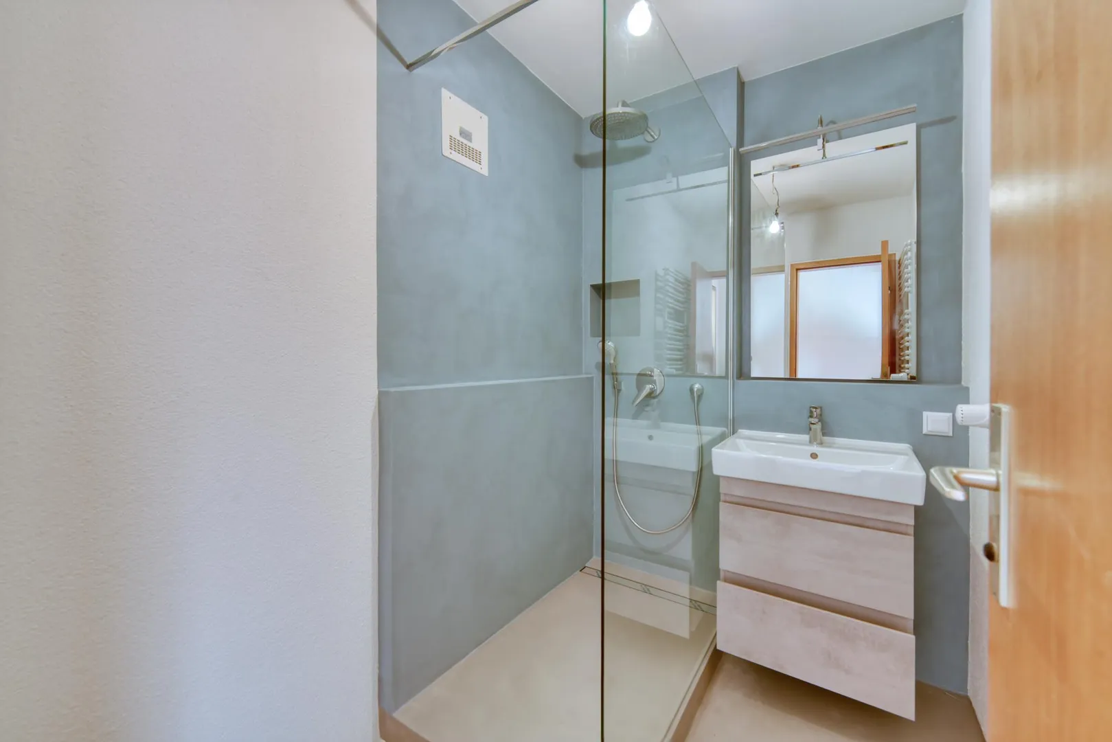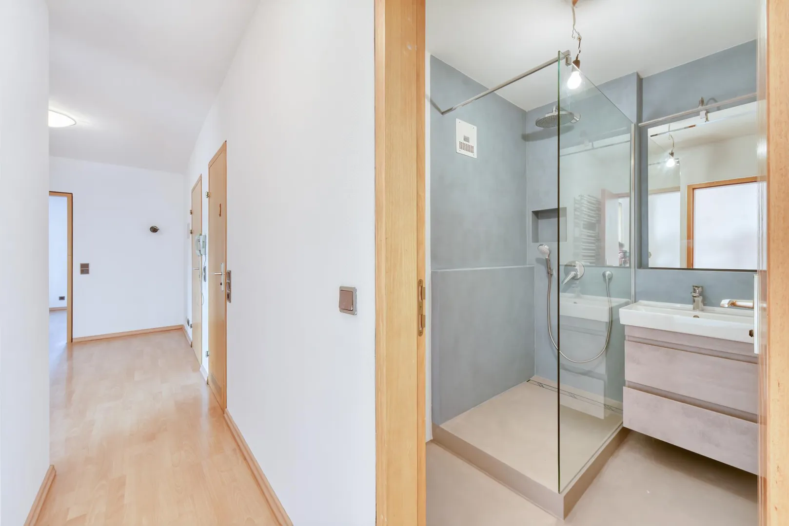 Das Badezimmer wurde aktuell modernisiert und ist ausgestattet mit einem gespachtelten Boden sowie gespachtelten Wänden, einer Dusche, einem Handtuch-Heizkörper, einem Waschtisch-Unterschrank sowie einem belichteten Spiegel.